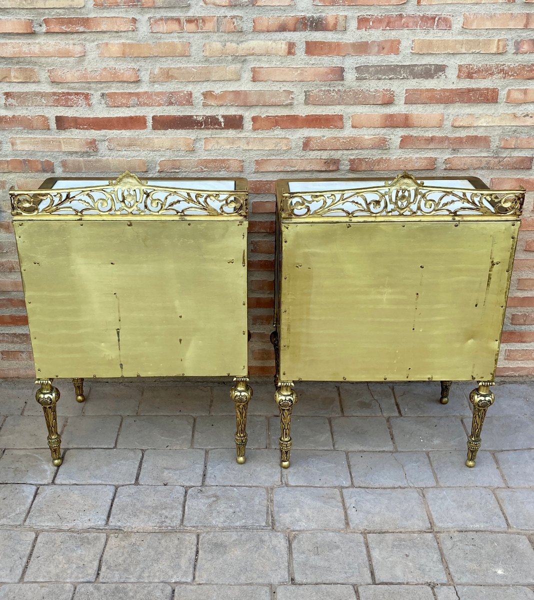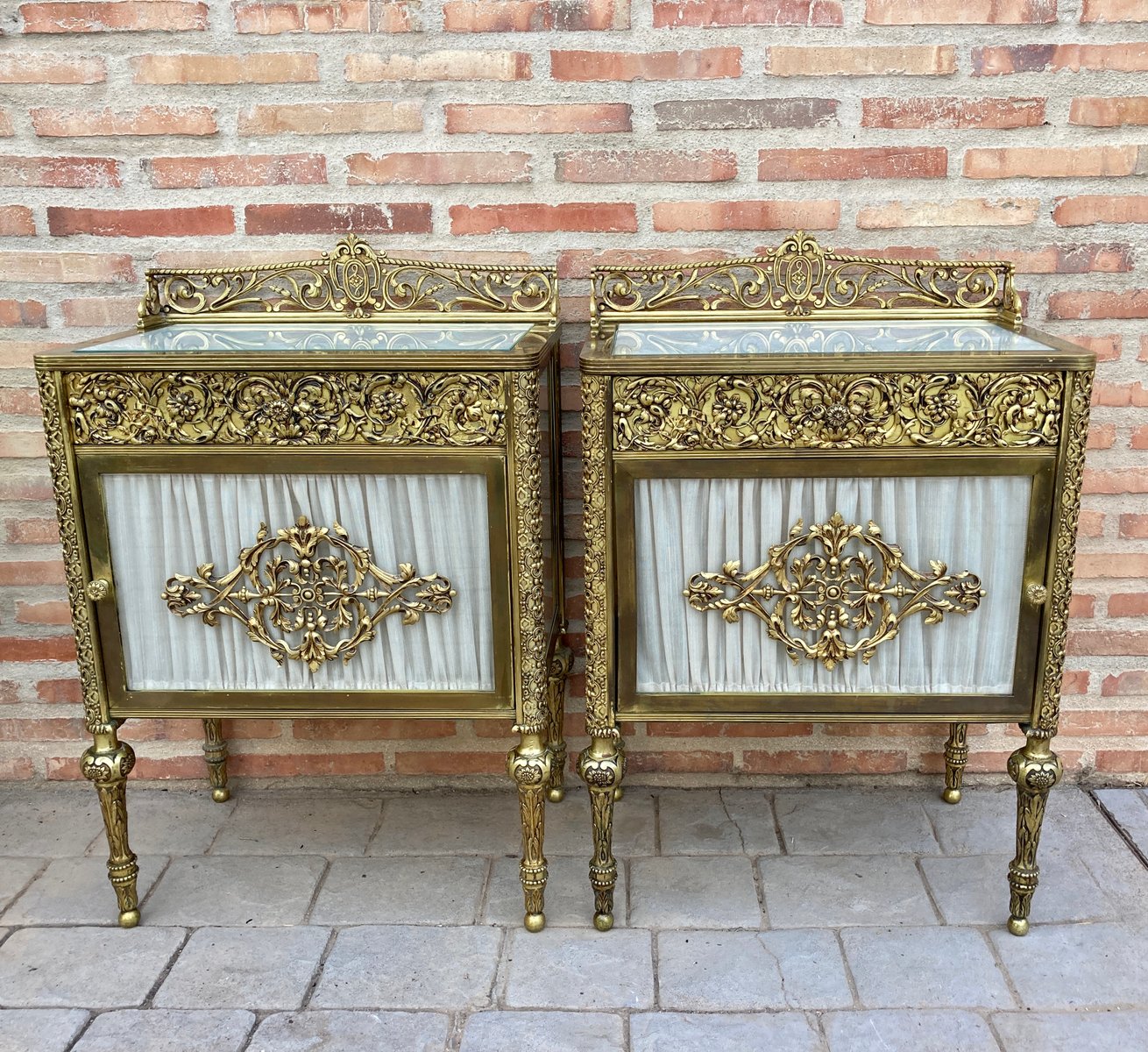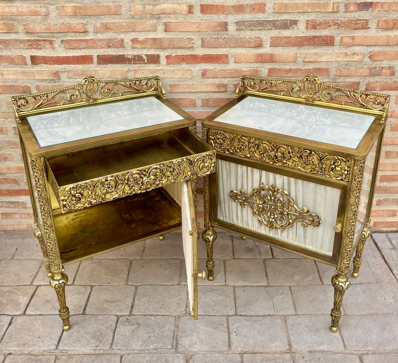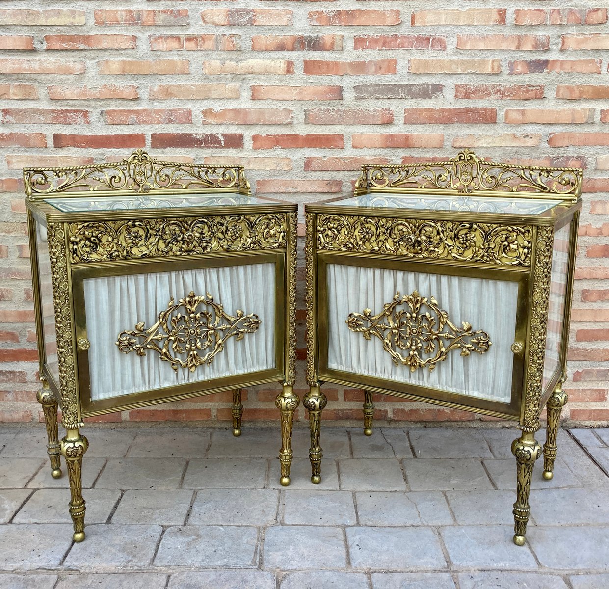 19th Century French Bronze Vitrine Nightstands with Glass Doors and Brass Drawers, Set of 2