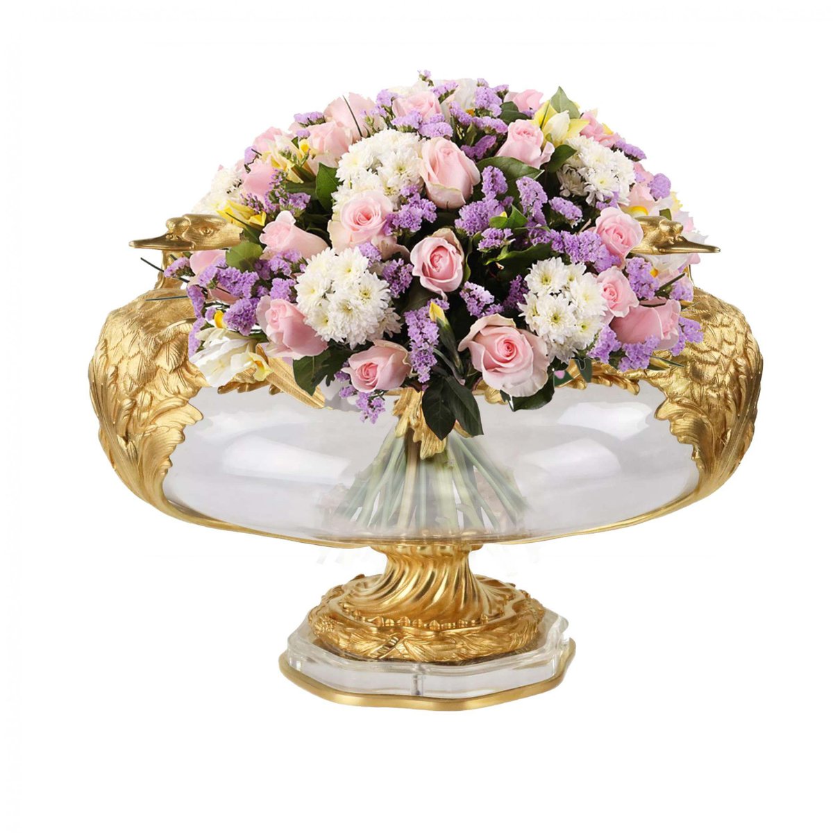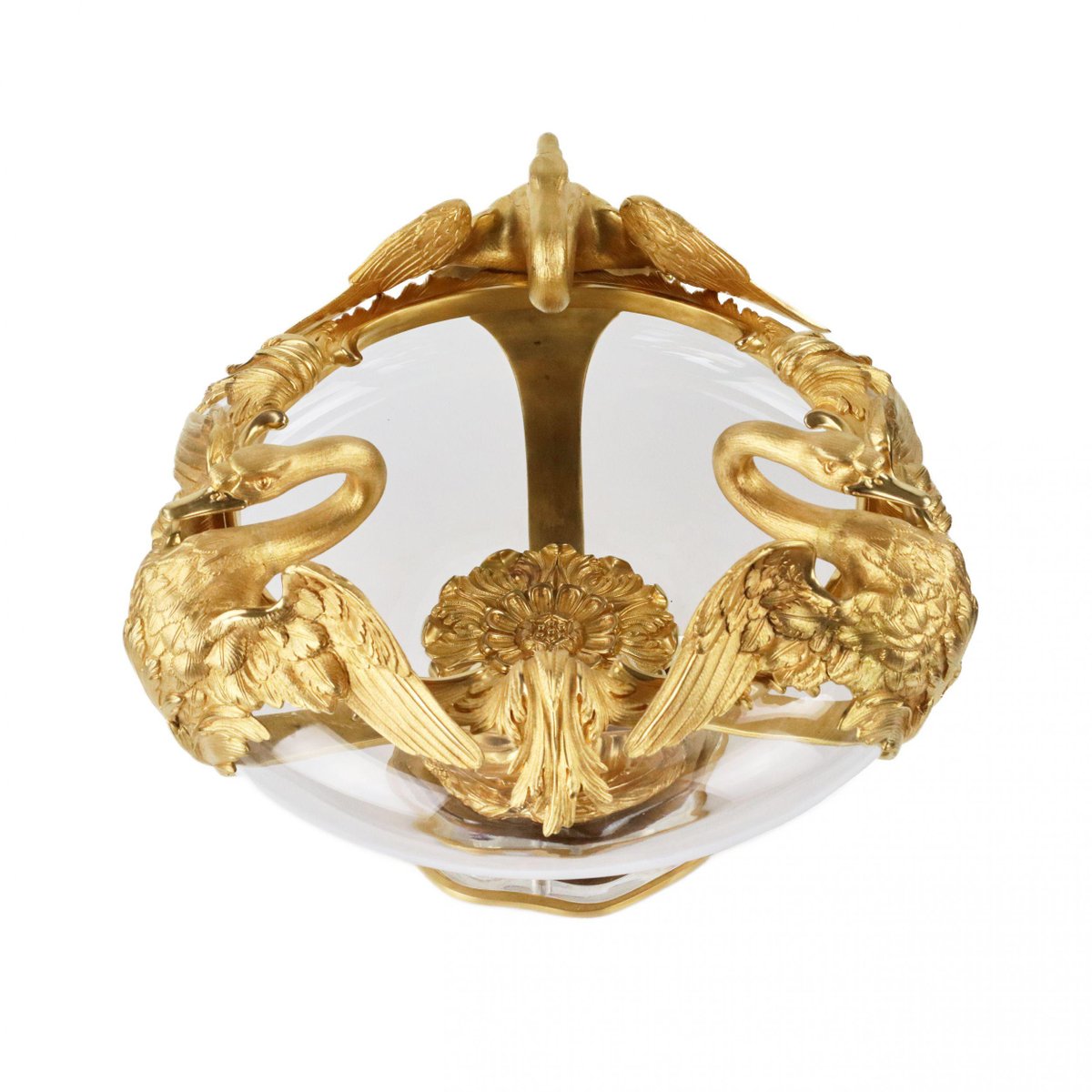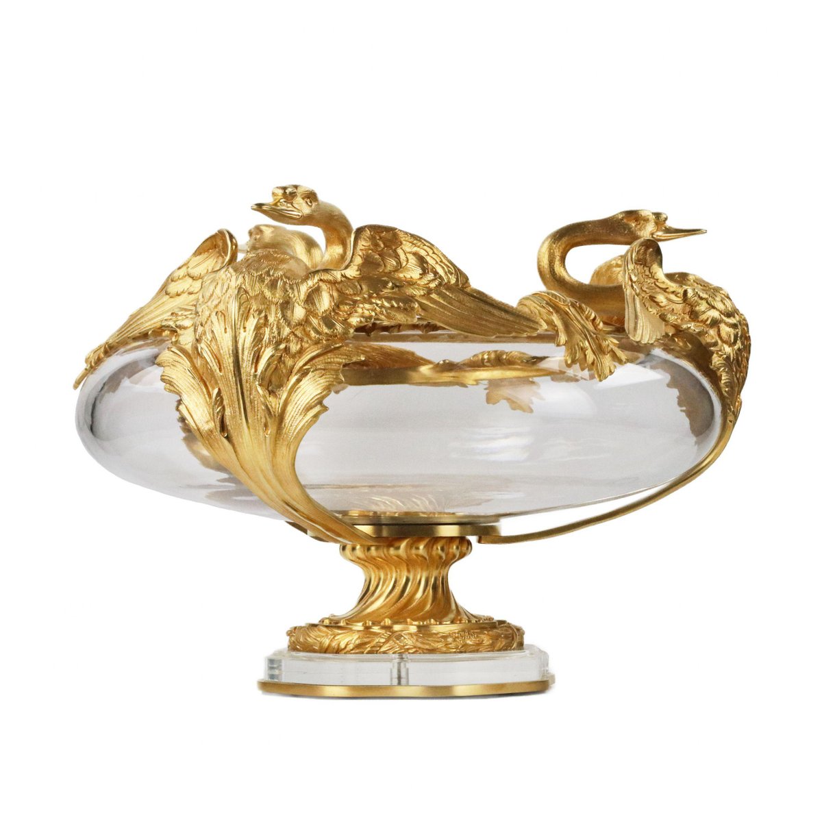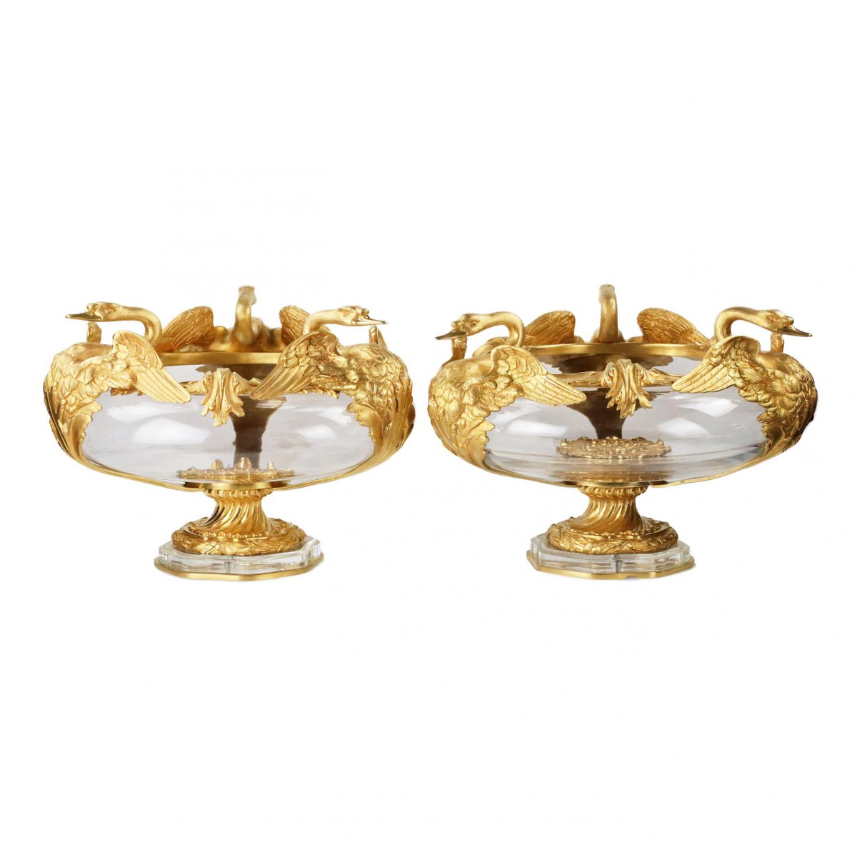 20th Century French Round Vases in Cast Glass and Gilded Bronze with Swan Motif, Set of 2