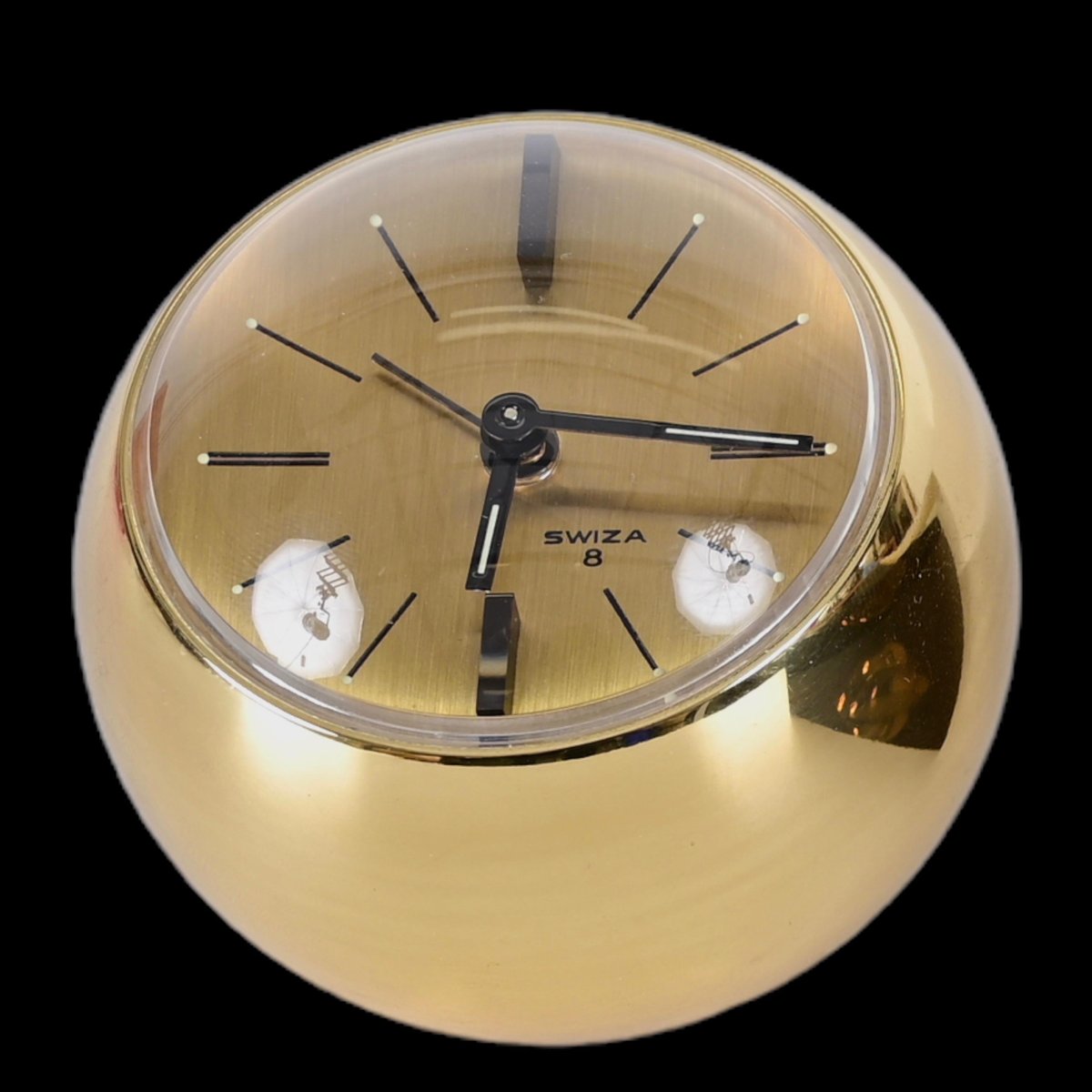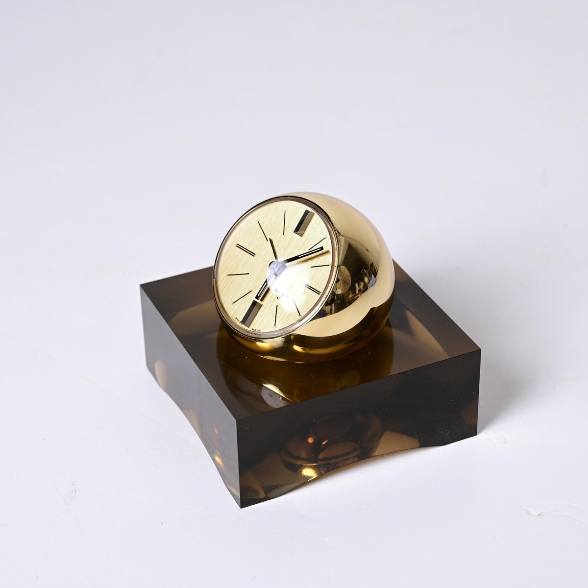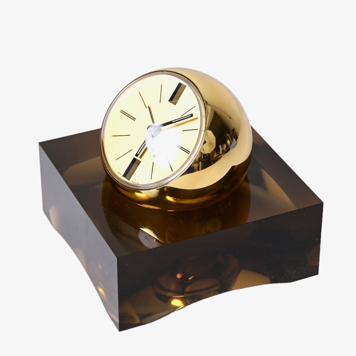 8 Day Gilt Sphere Clock with Smoked Acrylic Glass Base in Box from Swiza, 1970s
