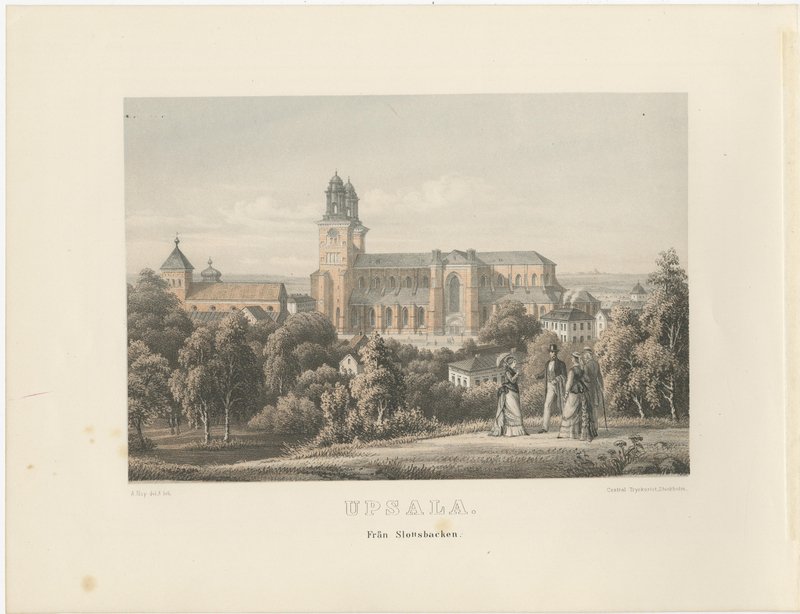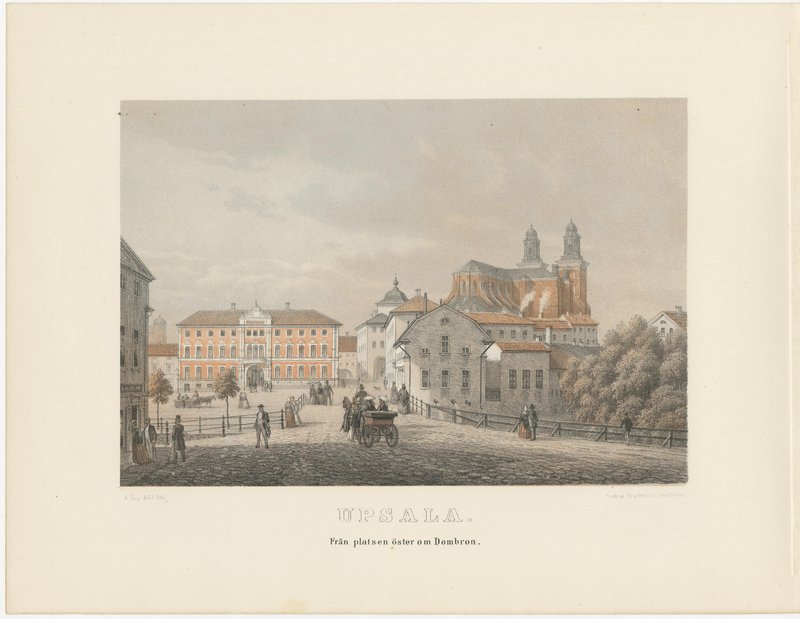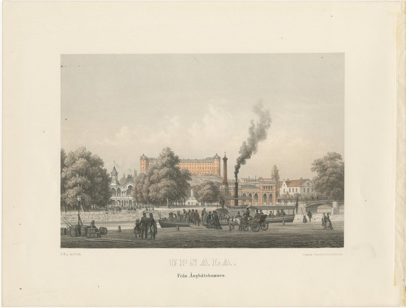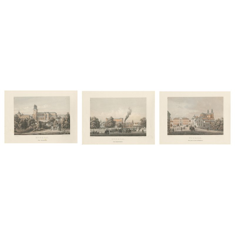 Uppsala City Views, 3 Tinted Lithographs by A. Nay, Sweden 1877 : This curated set of three tinted lithographs presents a coherent and atmospheric visual portrait of Uppsala as it appeared in the late nineteenth century. Executed with a calm precision and subtle tonal colouring, the views document the city’s principal urban spaces, riverfront, and elevated outlooks, offering a balanced impression of civic life, architecture, and landscape. Together, the three compositions form a measured and harmonious sequence of exterior views, unified by format, scale, and artistic approach. Note: the beautiful sample of a framed set (see attached images) is just for imagination only. We sell the prints unframed. The plates were drawn and lithographed by A. Nay and published in 1877 in the illustrated volume Upsala, with accompanying text by S. Nordström. This later issue contains ten tinted lithographic plates rather than the twelve found in the earlier 1870 edition, and represents a documented variant rather than an incomplete work. Nay’s lithographs are distinguished by their careful architectural rendering combined with softly modulated tones, lending the city scenes both clarity and atmosphere. The set includes views from Slottbacken, along the river near the steamboat harbour, and east of Dombron, each capturing a different aspect of Uppsala’s urban fabric. The elevated perspective from Slottbacken establishes a broad overview of the city, while the riverside scenes introduce movement and daily activity, with water, bridges, and buildings interwoven into calm, readable compositions. Human figures appear sparingly, providing scale without distracting from the architectural setting. All three lithographs are horizontal in format, making the set particularly well suited for cohesive presentation in an interior setting. The consistent scale and tonality allow the works to be displayed together as a unified group, while each image also retains sufficient visual strength to stand on its own. The set appeals equally to collectors of Scandinavian city views, architectural prints, and nineteenth-century topographical lithography, as well as to interior designers seeking historically grounded yet visually restrained works. These views form part of a broader 1877 visual documentation of Uppsala that also included cathedral interiors and additional city scenes. Offered here as a focused city-view group, the set emphasizes Uppsala’s public spaces and urban character rather than its ecclesiastical interiors. Condition: Good overall condition. Light age-related toning consistent across all three sheets. Minor scattered foxing and faint handling marks, mostly confined to the margins. Image areas clean and well preserved. Margins ample and uniform. Framing tips: The horizontal format benefits from wide ivory or soft warm-grey mats to enhance depth and cohesion across the set. Matching dark walnut, stained oak, or ebonized frames will reinforce the architectural character while maintaining a refined, gallery-quality presentation. Museum glass recommended. Technique: Tinted lithograph Maker: A. Nay, Sweden, 1877