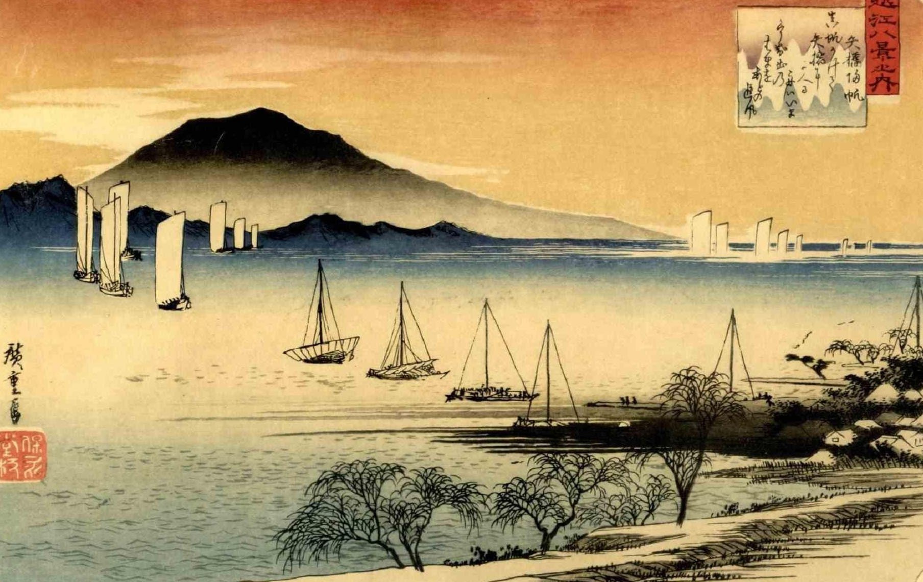 After Utagawa Hiroshige, Sunset in Yabase, Original Woodcut, 1920s