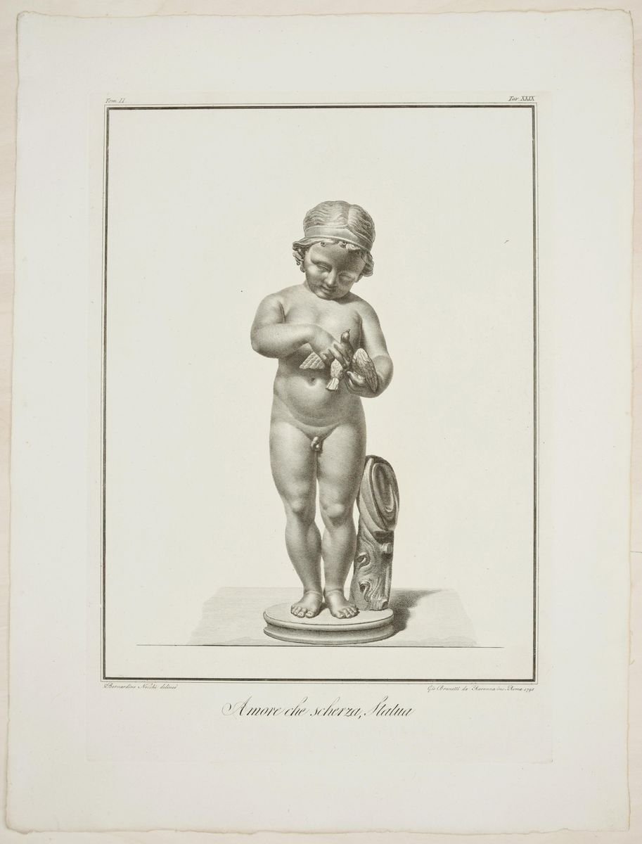 “Amore che scherzo, Statua” (Joking Eros, Statue) is a wonderful black and white etching on paper, realized by the artist Giovanni Brunetti da Ravenna, after Bernardino Nocchi as the inscriptions on plates on lower margins report “Bernardino Nocchi delineò/ Gio Brunetti da Ravenna inc. Roma 1795”. This original print is numbered on plate in Roman numerals on higher right corner “Tav. XXIX” and is a plate from the series ''Illustrazioni de'Monumenti scelti Borghesiani già esistenti nella Villa sul Pincio (..)date ora per la prima volta in luce dal cav. Gio. Gherardo De Rossi e da Stefano Piale sotto la guida di Vincenzo Feoli'', by Ennio Quirino Visconti, published by Stamperia de Romanis in Rome, 1821. This old master’s original prints representing a precious piece of the Borghese collection, an Eros statue caressing a sparrow, is in excellent conditions with some light signs of the time (some little whormholes on the left margin beyond the marginal line of the matrix) but with fresh impression. Illustrazioni de'Monumenti scelti Borghesiani This collection in two volumes is a beautifully detailed catalog of classical sculptures collected by Prince Borghese (1730-1800) in his Villa on the Pincio. Ennio Quirino Visconti (1751 - 1818) wrote the texts that accompany the large branches depicting. To these writings, which were found and made available by the son of the illustrious archaeologist, the publishers added only a few illustrations relating to some minor monument of which copper had already been engraved. The engraved title-plate are signed by draughtsmen like Agostino Tofanelli, Stefano Tofanelli, Bernardino Nocchi, Domenico de Angelis or Teodoro Matteini, and by engravers Pietro Fontana Veneto, P. Vitali, Pietro Bettelini, Giovanni Folo Veneto, Giovanni Brunetti da Ravenna, Giovanni Ottaviani, Francesco Cecchini, Gio. Batta. Leonetti, Girolamo Carattoni, Domenico Cunego, Luigi Cunego, Alessandro Mochetti, Luigi Pizzi, Angelo Campanella or Giacomo Bossi. The Volume I shows ancient full-length statues, of the Borghese warrior by Agasias (two plates), Greek gods and heroes and Roman famous historical figures; the last two plates represents antique Egyptian deities. There are plates representing ancient bas-reliefs, sarcophagi, of mythological subjects, the Borghese Vase, portrait busts, a vase on an altar, two statues of Amor; and two modern statues, by Bernini (the Apollo and Daphne, and the David). Special attention is held for the “Borghese Warriors”. «Très bel ouvrage» writes Brunet, «Grand ouvrage, le seul qui mérite, parmi ceux sur la villa Borgese, de figurer dans le chapitre aux Galeries et Collections» Vinet said, looking at this plate. Agostino Tofanelli (Lucca 1770 - Rome 1834) Son of the engraver Andrea, Agostino Tofanelli studied with his father and his brother Stefano. In 1781 he settled in Rome to attend the courses of the Accademia del Nudo. Until the early years of the century, he was a popular draftsman and engraver; in 1807 he was appointed custodian of the Capitoline Museum, a position he held until his death. The first important assignments as a painter was in Rome in Palazzo Spada (1808) and in the renovation of the apartments of the Quirinale (Salon de Musique of the Empress, 1812). In 1813 he was appointed member of the Accademia di San Luca to follow the interventions in Palazzo Taverna (1810-1814), in the Palazzi Vaticani (1817-1818) and in the chapel of the Quirinale. In Lucca, he was also commissioned by Maria Luisa di Borbone (1818-1820), for family portraits and works of biblical theme. Bernardino Nocchi (Lucca, 1741 - Rome, 1812) Bernardino Nocchi moved to Rome in 1769 with his colleague Stefano Tofanelli, entering the school of Niccolò Lapiccola where he developed a baroque style with neoclassical suggestions. Bernardino Nocchi was noticed by Pope Pius VI, who in 1780 entrusted him with the painting of the Sacred Apostolic Palaces and then in 1785 with the Print Room of the Vatican Library. But he also works outside the capital, in Gubbio where in 1797 he realizes the transit of St. Joseph in the Church of San Secondo, in Spoleto, in Lucca and in Catania. Returning to Rome, Nocchi painted some of his best paintings: Prince Camillo Borghese in 1799 , The apotheosis of Saint Prudenziana, Saint Novato and Saint Timothy in 1803 and Pius VII in 1807. This artwork is shipped from Italy. Under existing legislation, any artwork in Italy created over 70 years ago by an artist who has died requires a licence for export regardless of the work’s market price. The shipping may require additional handling days to require the licence according to the final destination of the artwork.