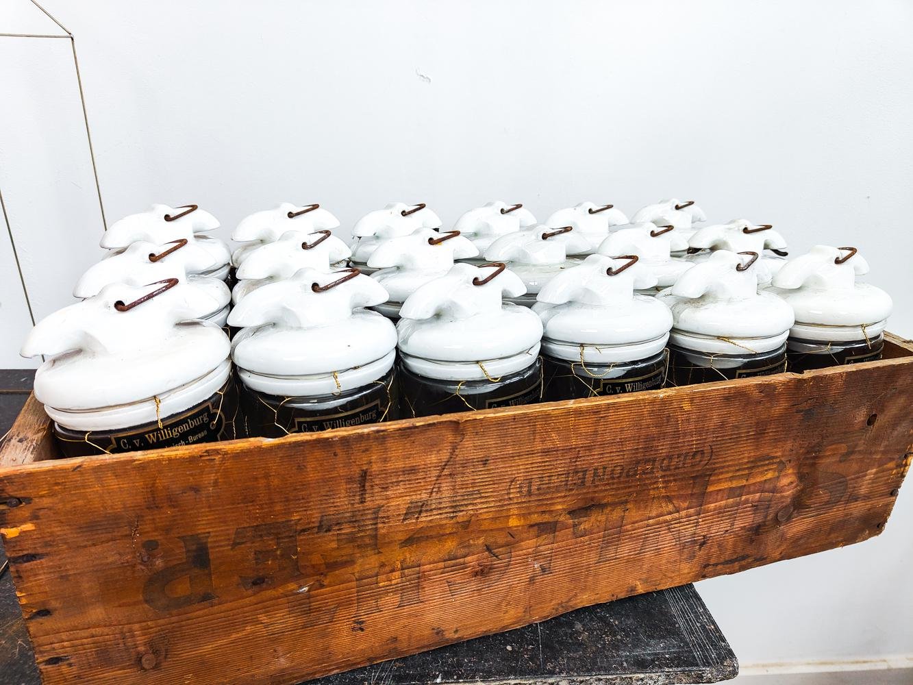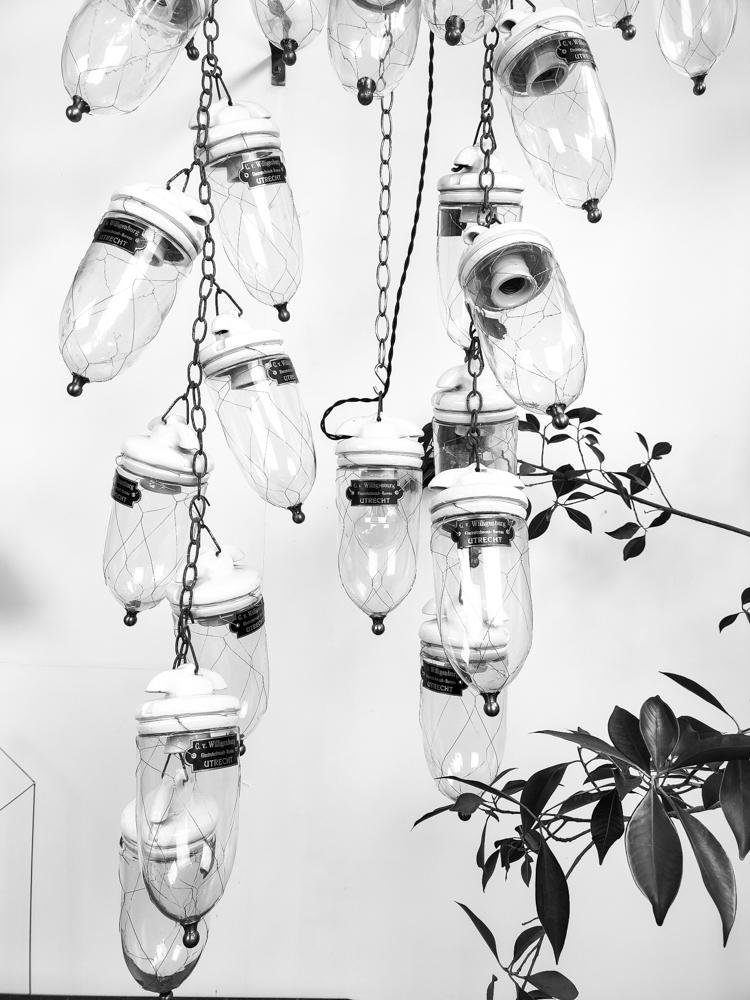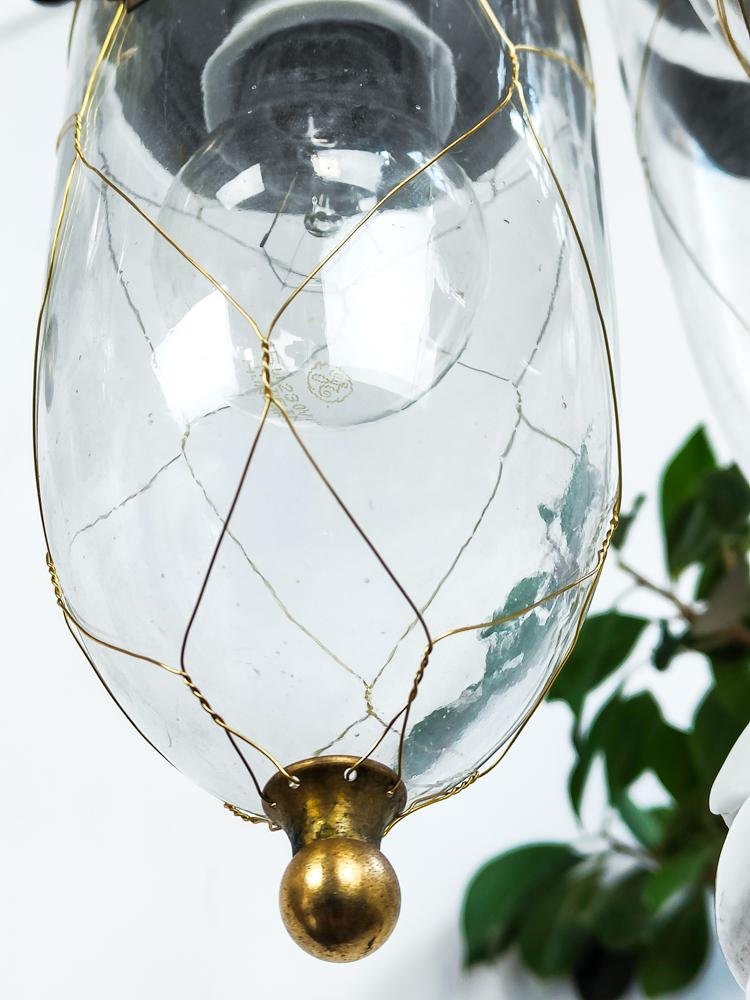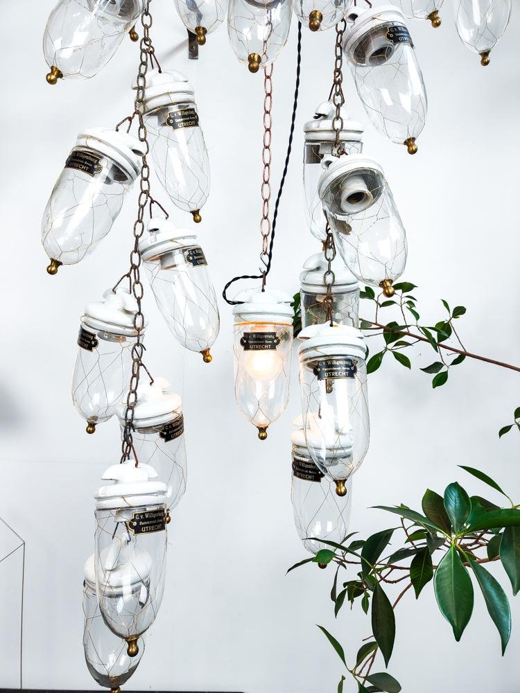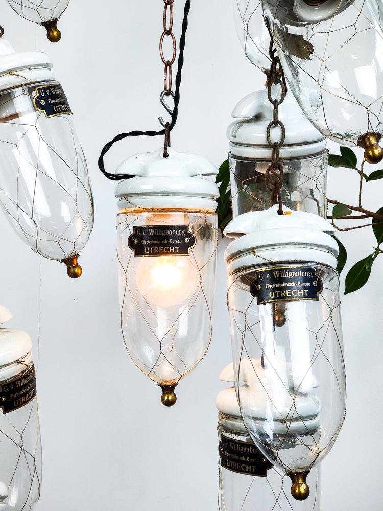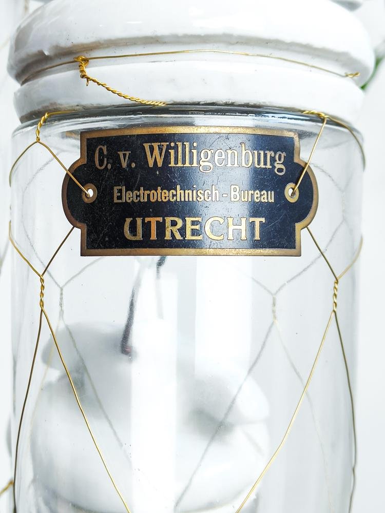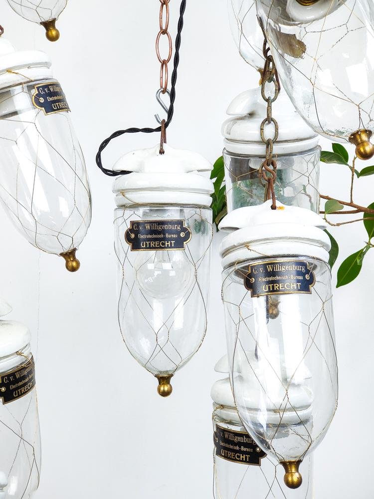 Antique Dutch Brass Wire Caged Porcelain and Glass Pendant from Utrecht