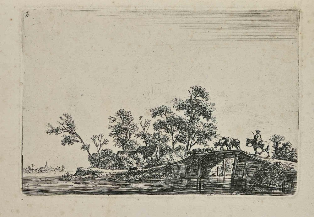 Antonie Waterloo, Shepherd with Cattle on a Wooden Bridge, 17th Century, Etching