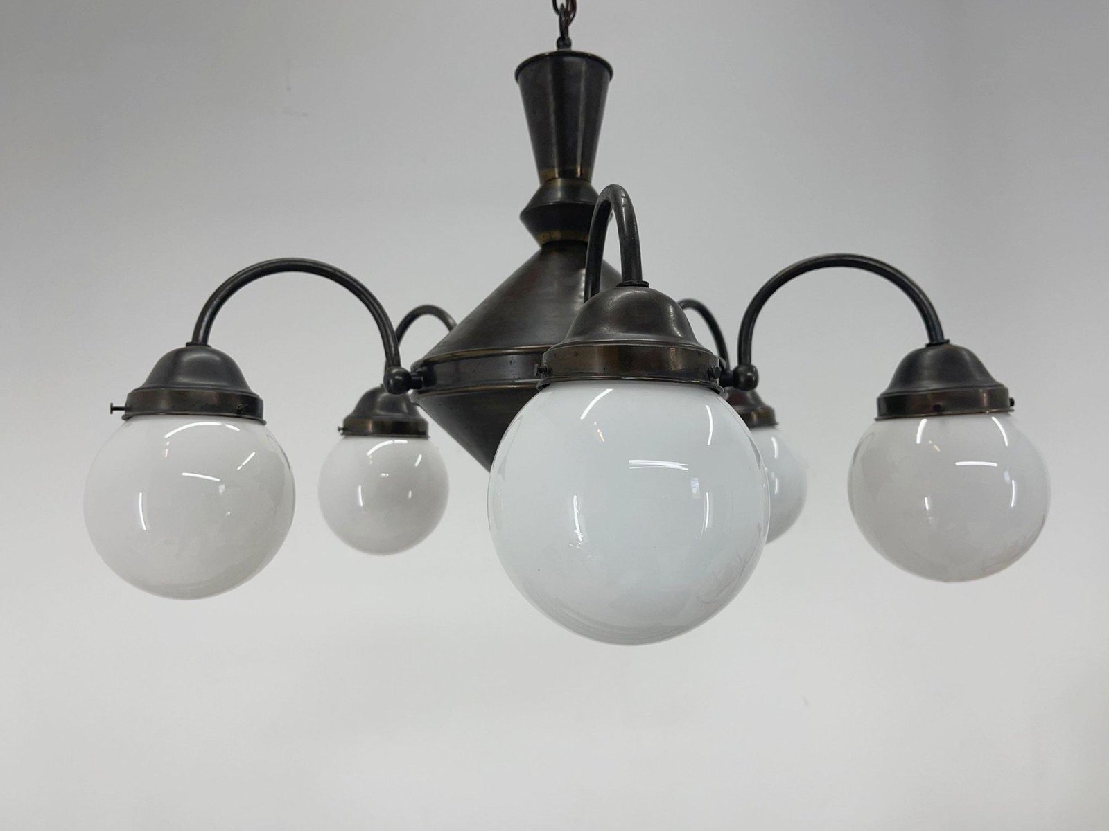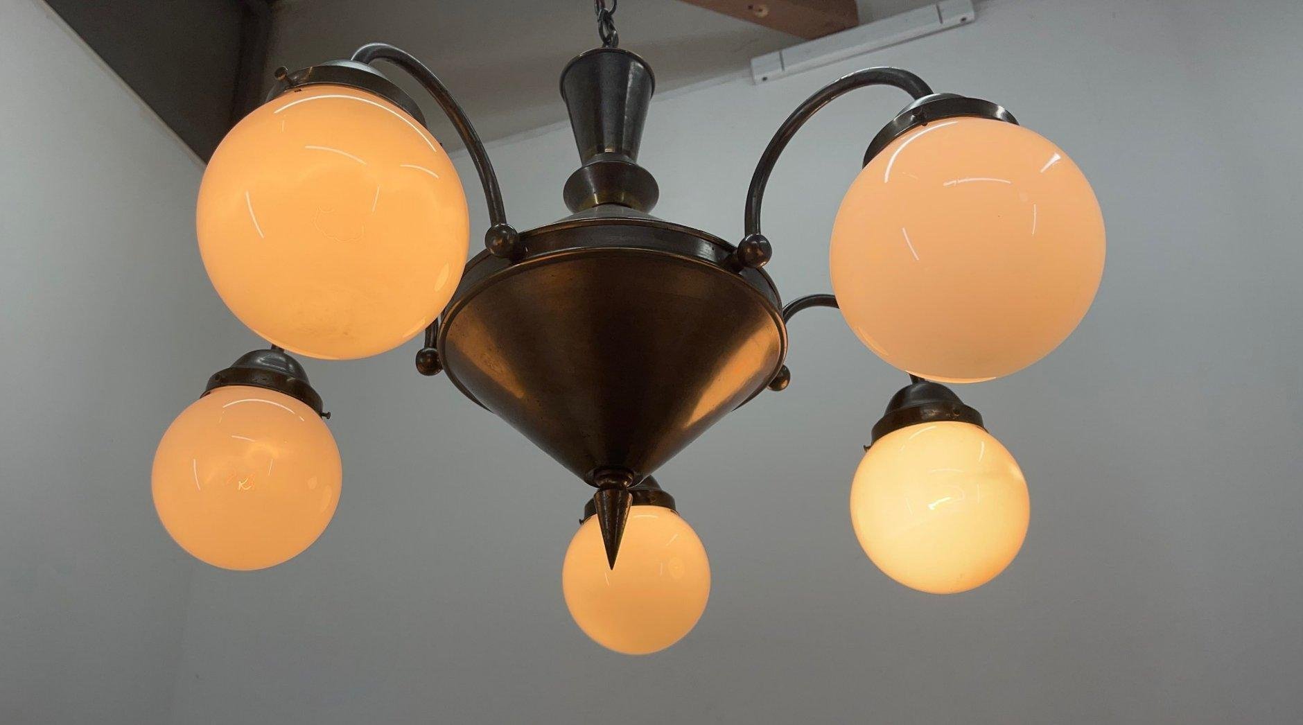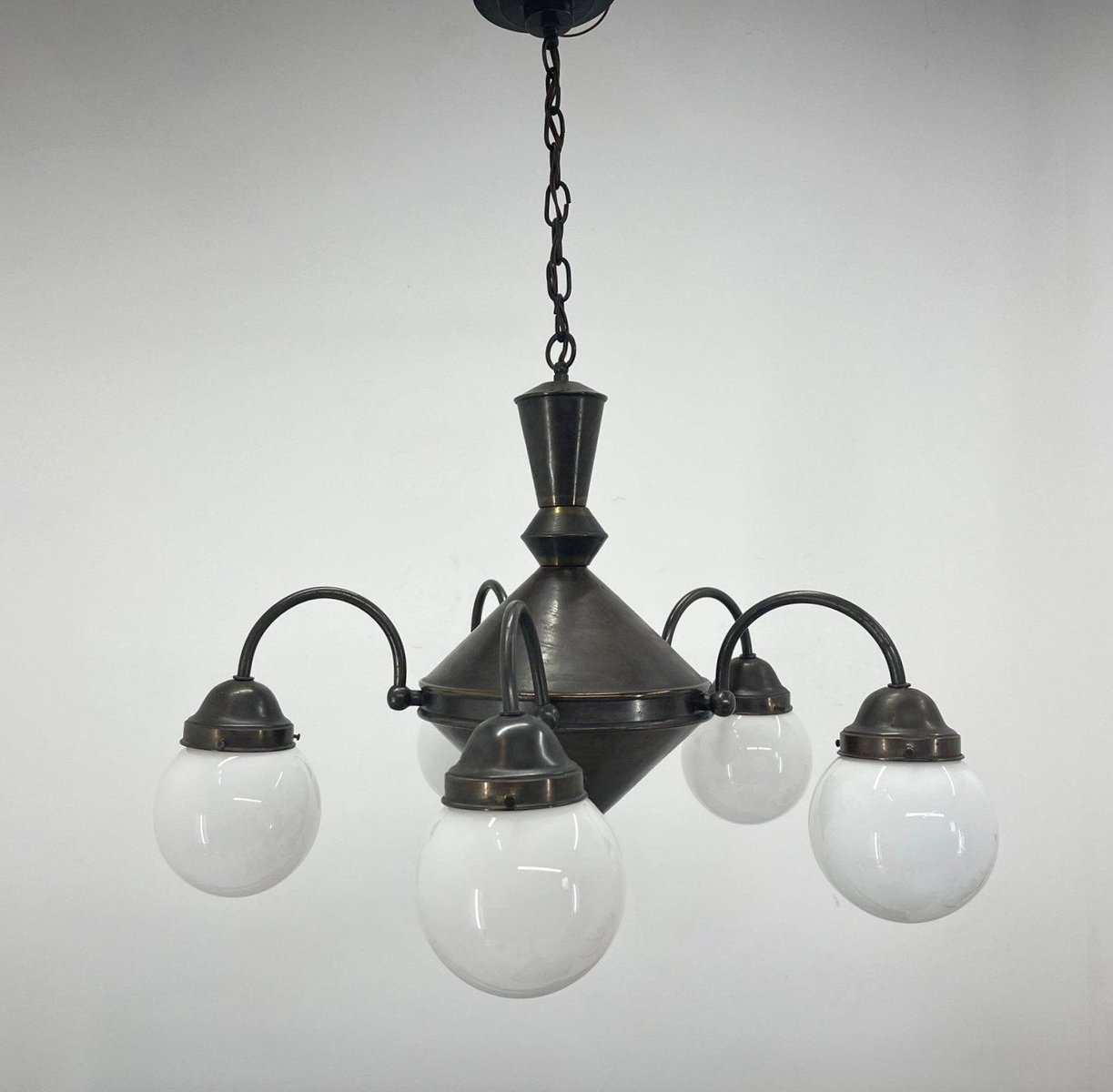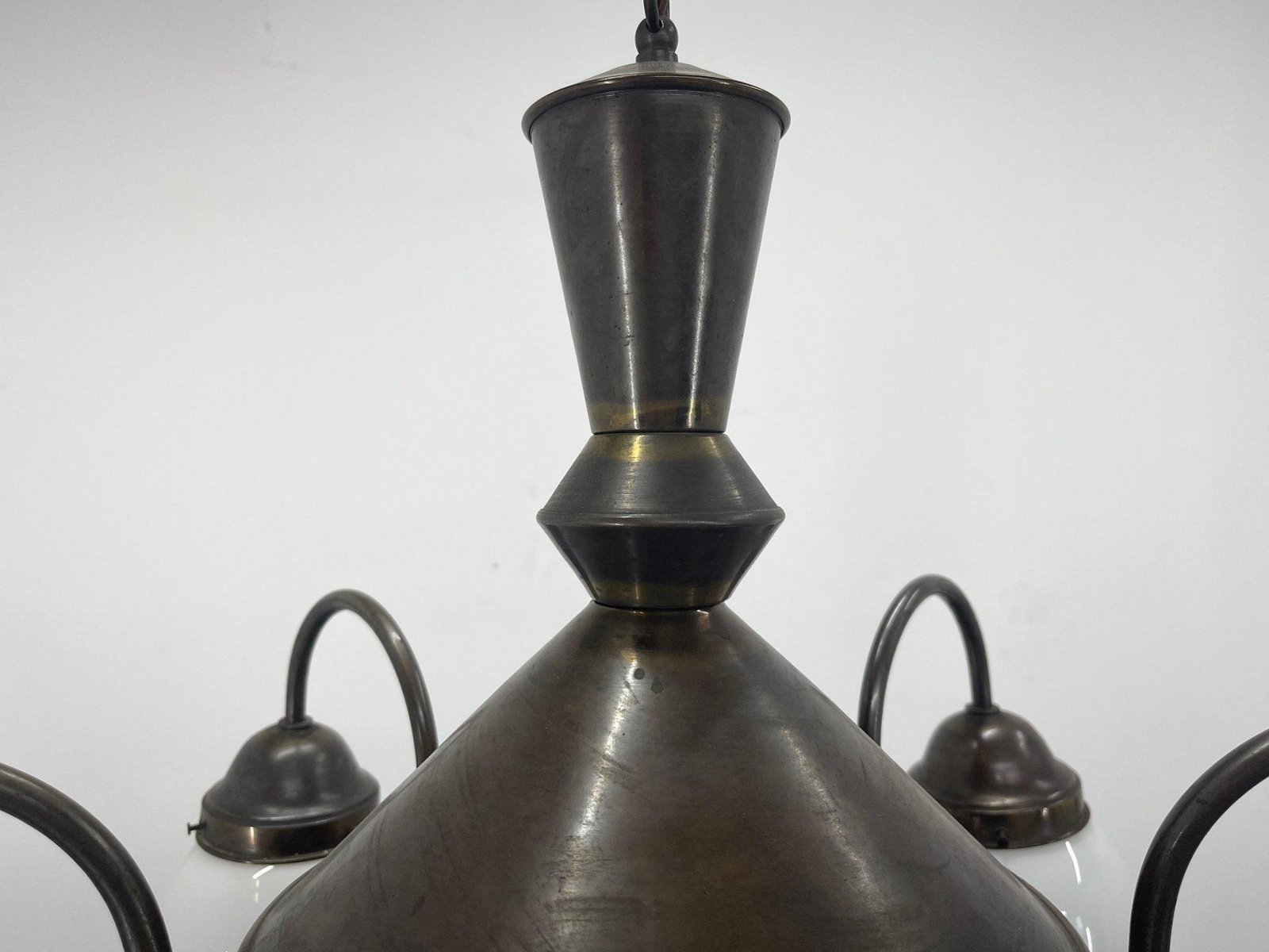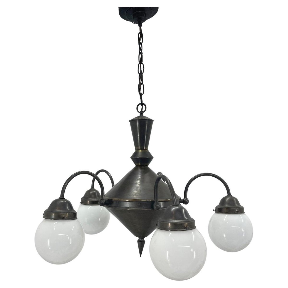 Art Deco Metal and Milk Glass Chandelier, 1930s
