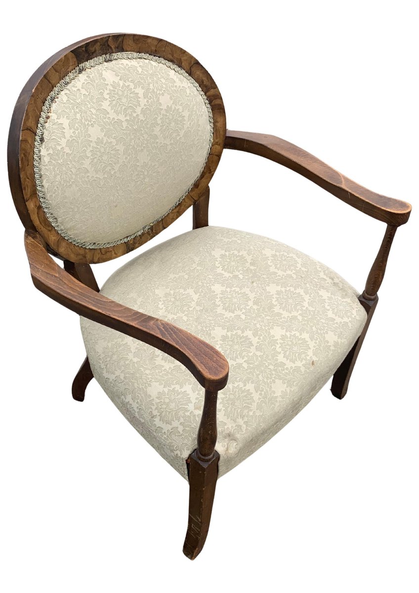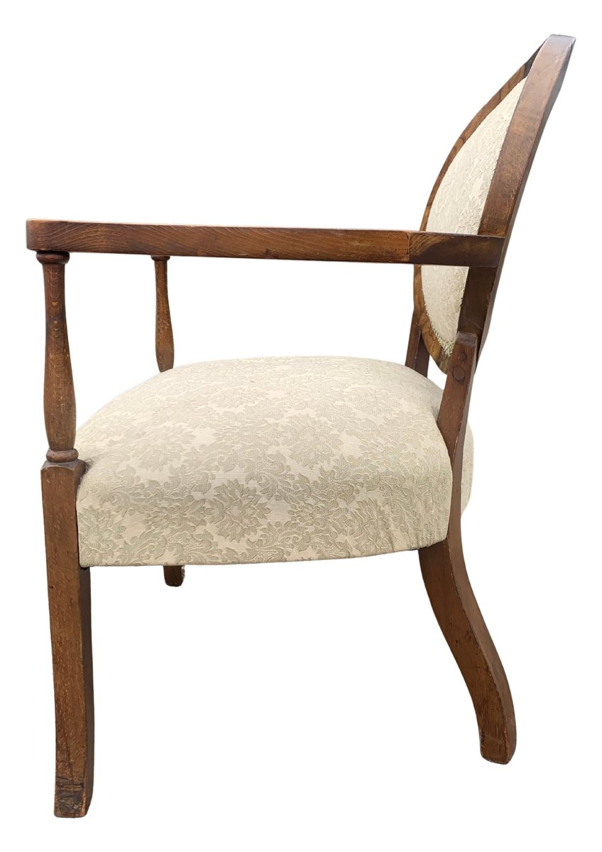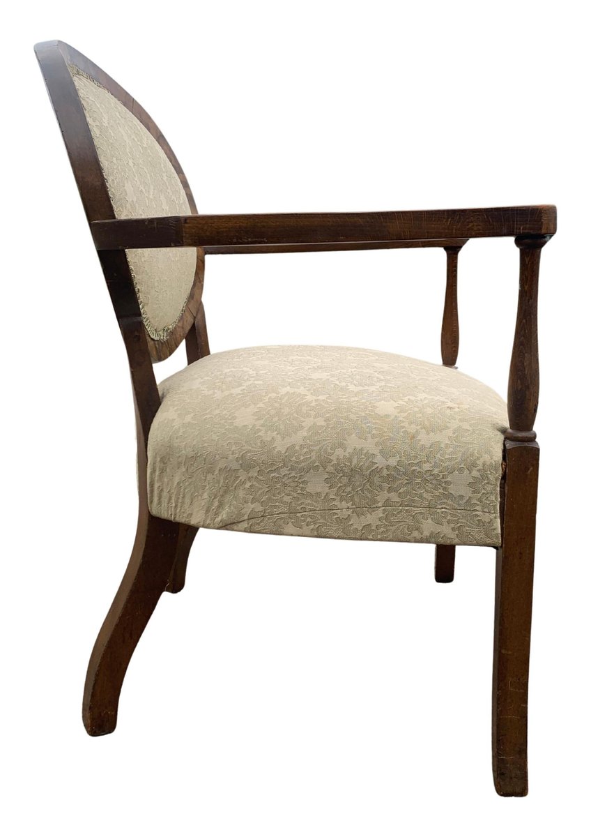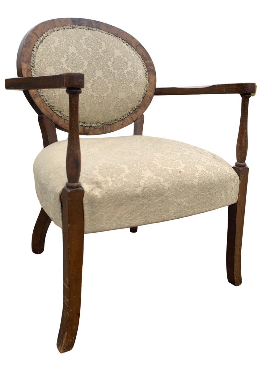 Art Deco Walnut Spoonback Open Frame Armchair with Cream Damask Upholstery
