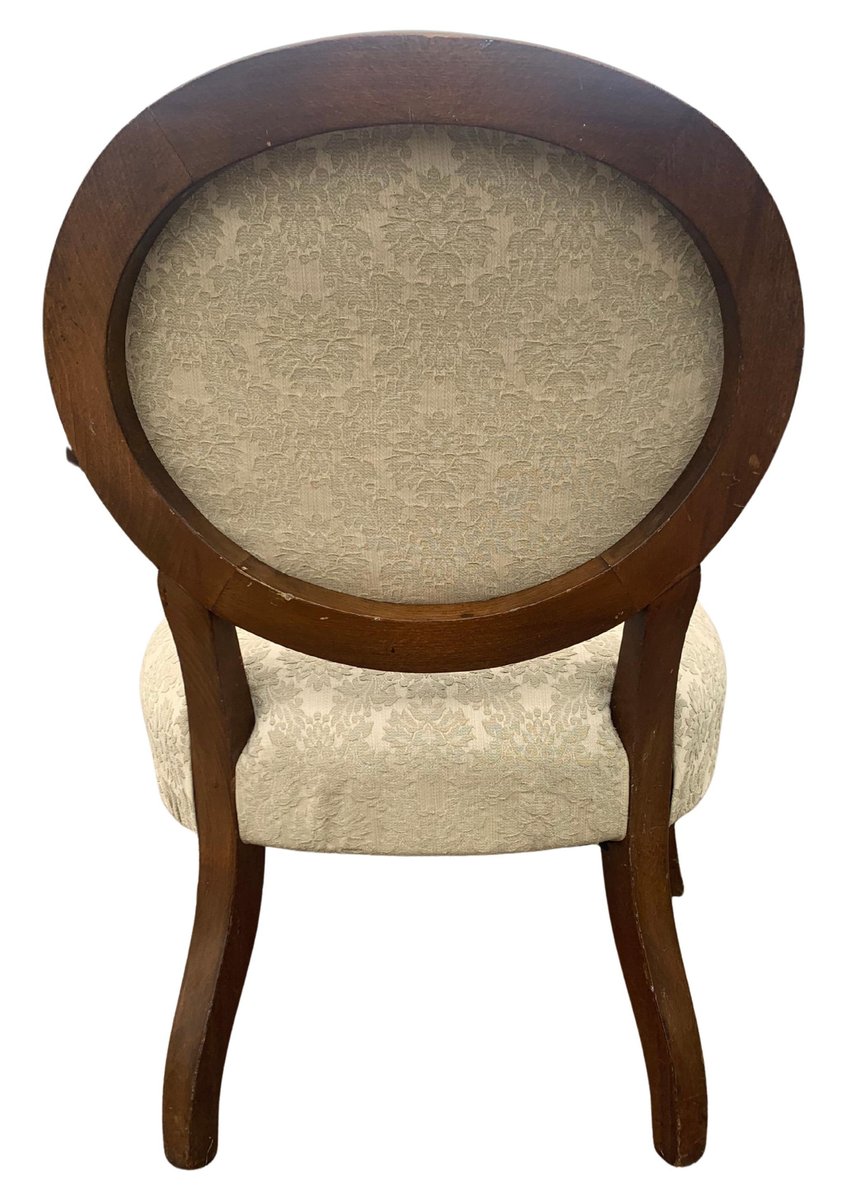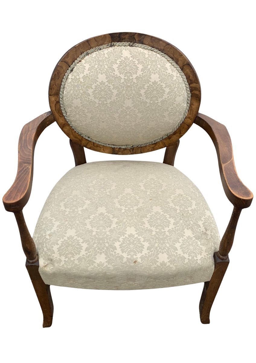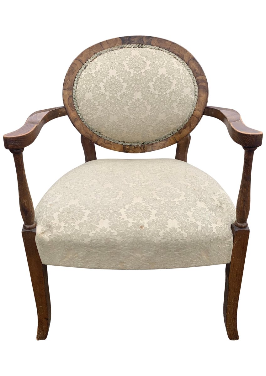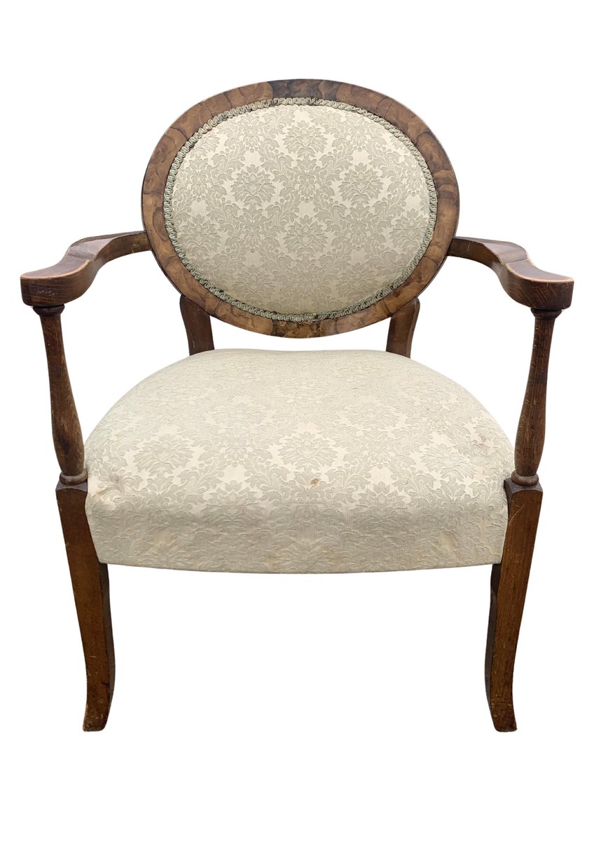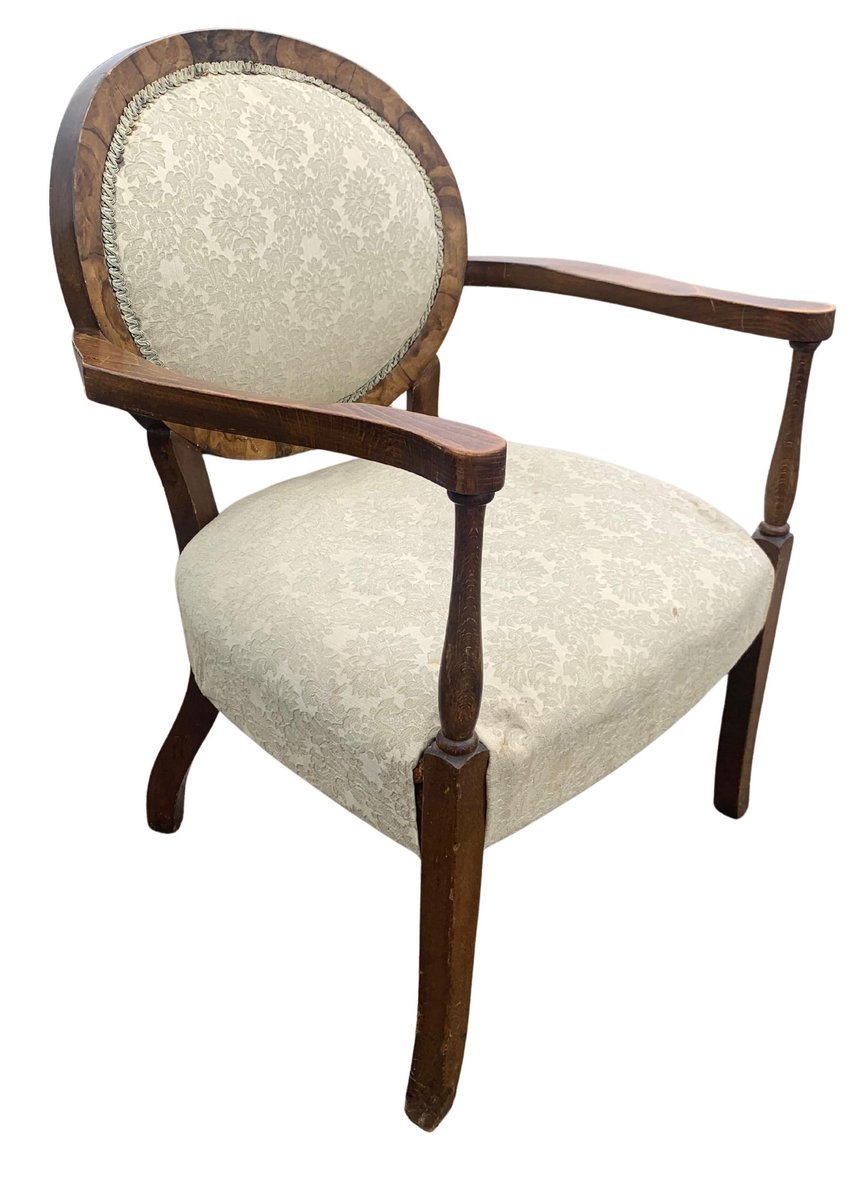 Art Deco Walnut Spoonback Open Frame Armchair with Cream Damask Upholstery