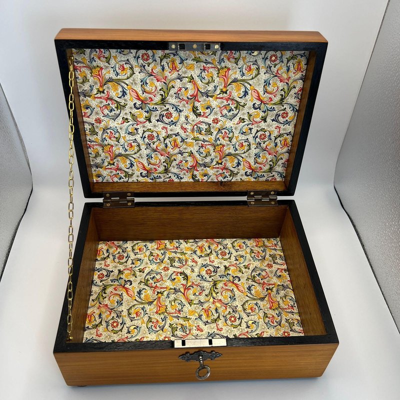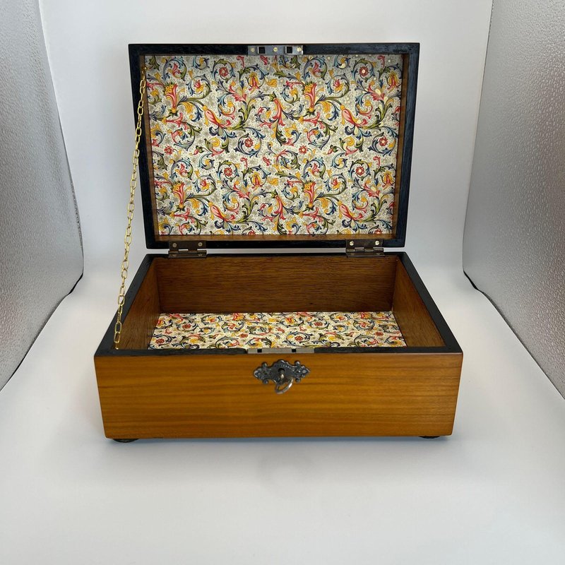 Beautiful, unadorned, early Biedermeier casket box from southern Germany, circa 1820. Cherry wood book-matched veneered on oak. Interior later lined with colorful wallpaper. Brass chain on the side. Lock, hinges, key, and pressed iron fitting.