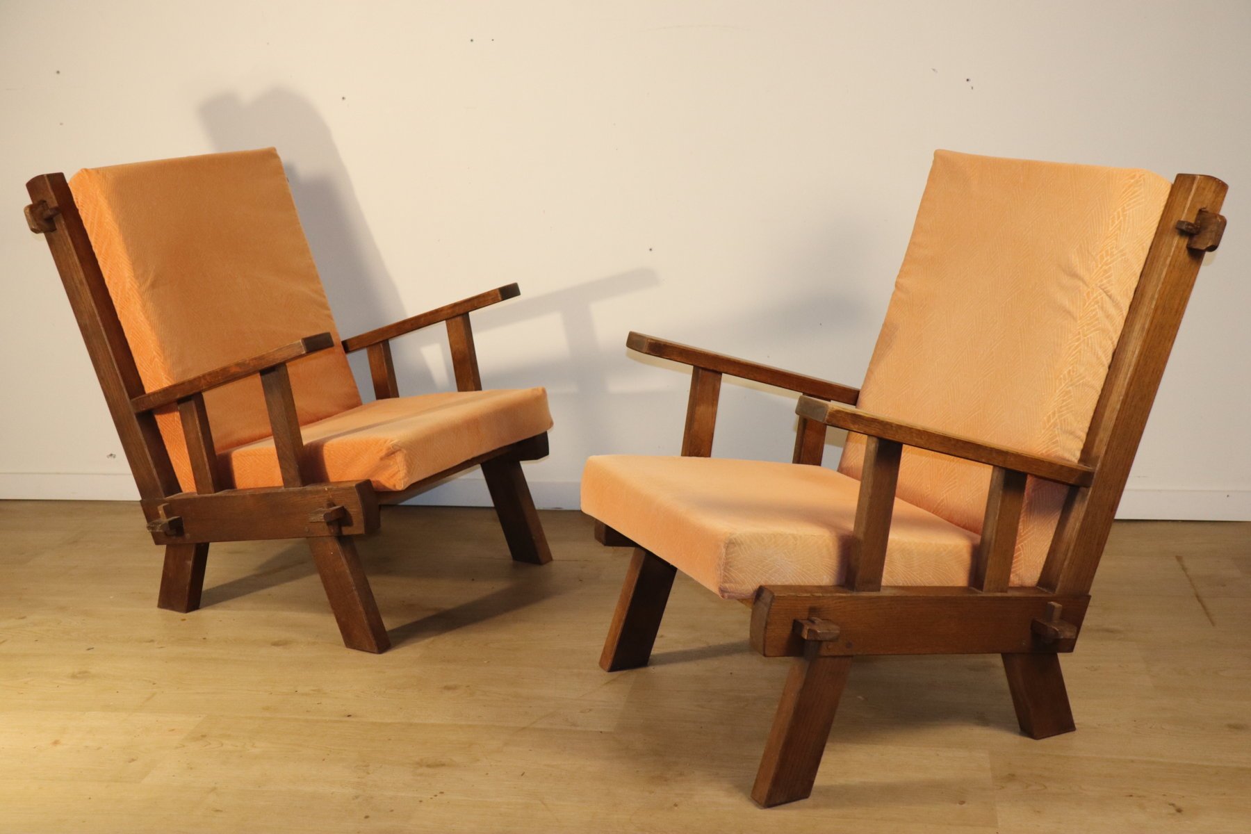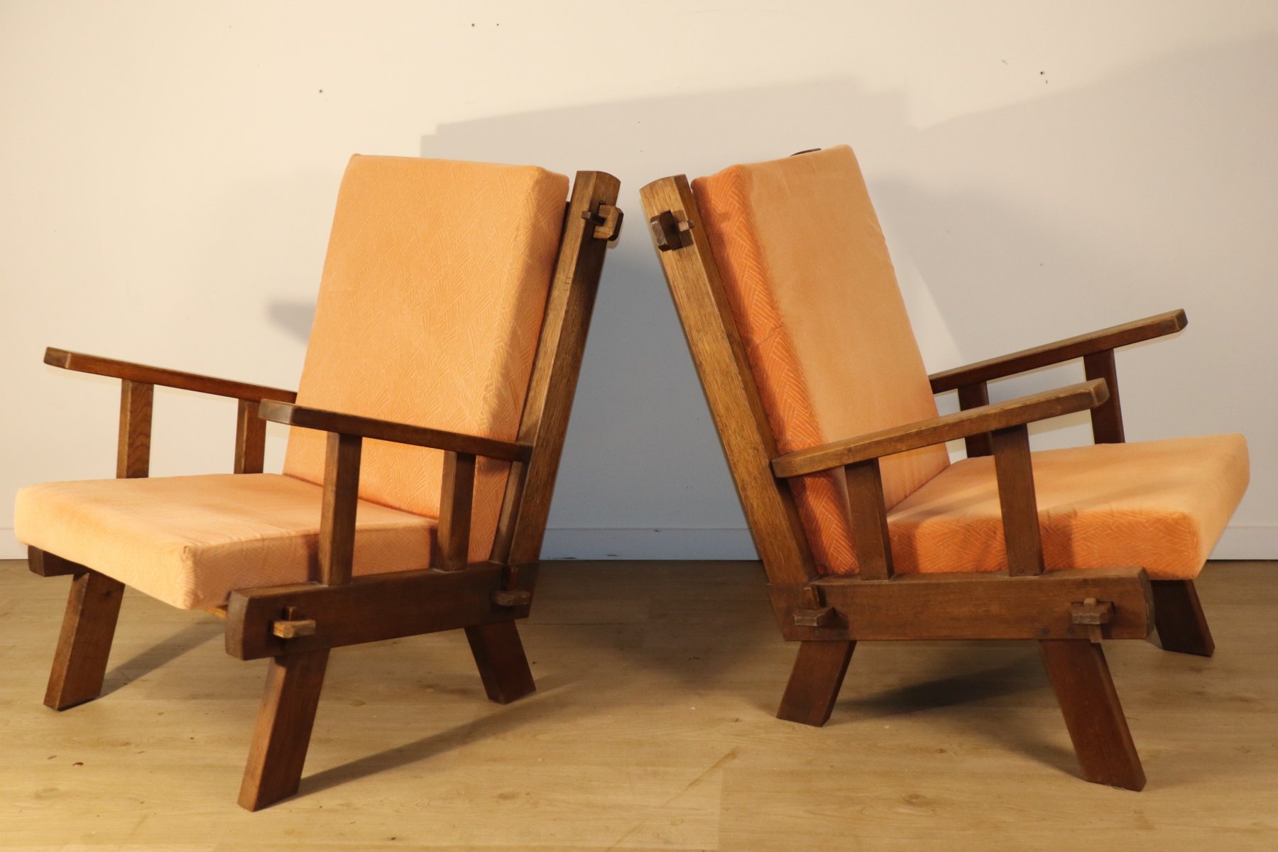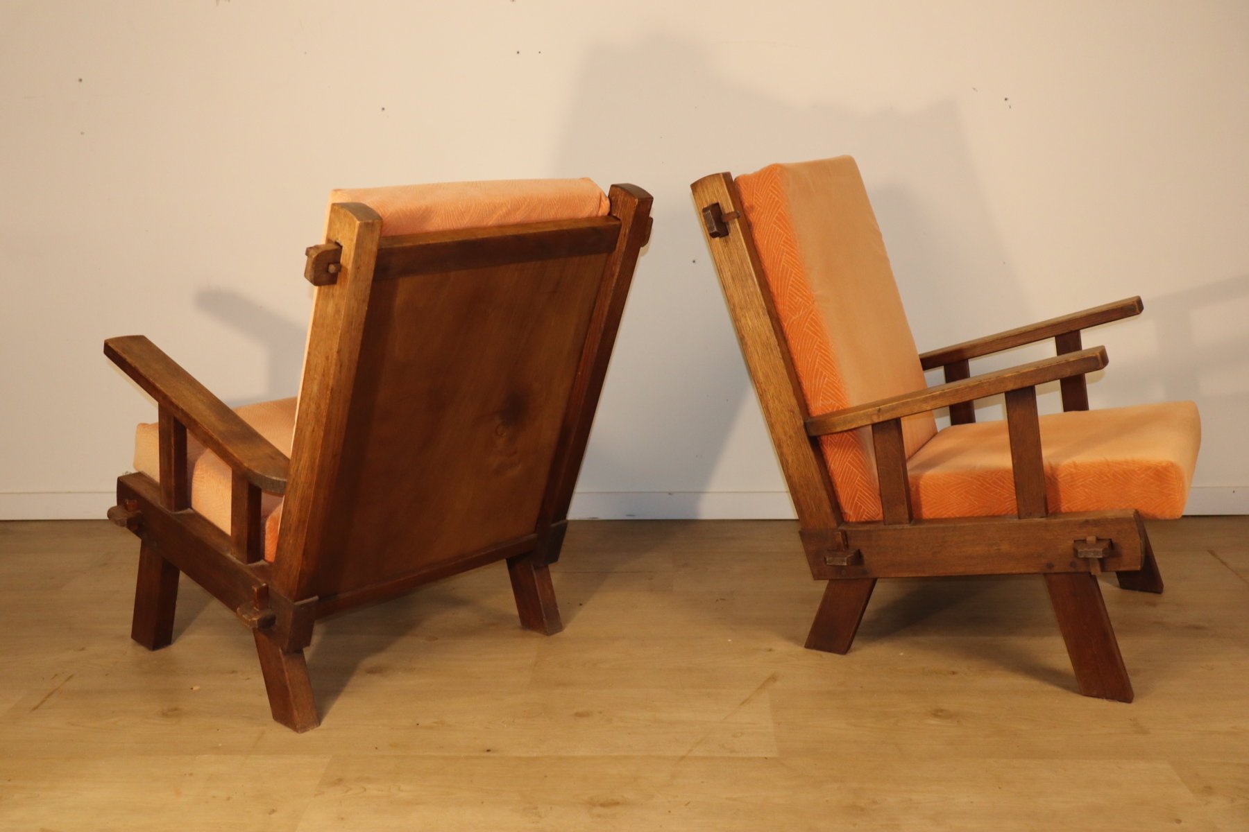 Brutalist Armchairs in Oak and Velvet, 1960s-1970s, Set of 2