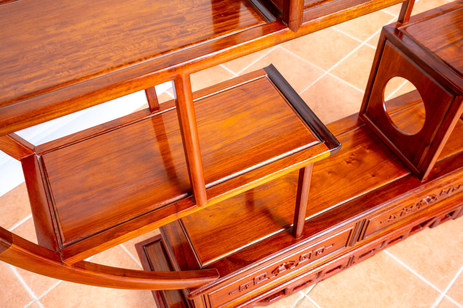 Likely originally purposed as a shrine and to display heirlooms, this versatile and jaw-dropping piece makes a great display unit, bookcase or even a room divider, having fine carvings to both sides of the drawers, which can be opened to either side.
