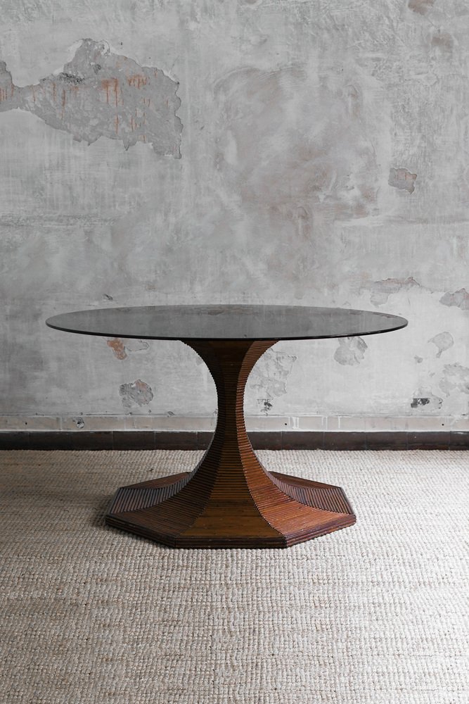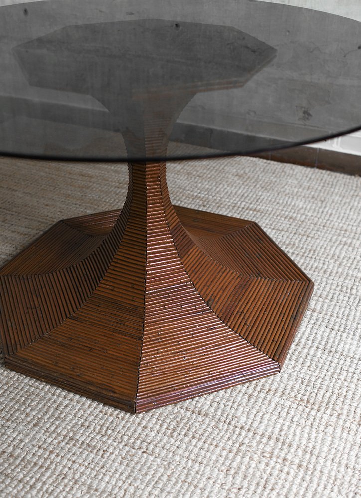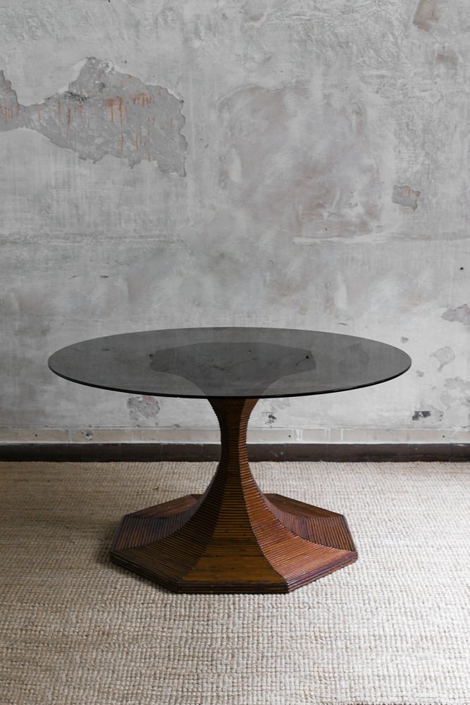 Dark-Finish Bamboo Table with Circular Smoked Glass Top from Vivai Del Sud, 1970s