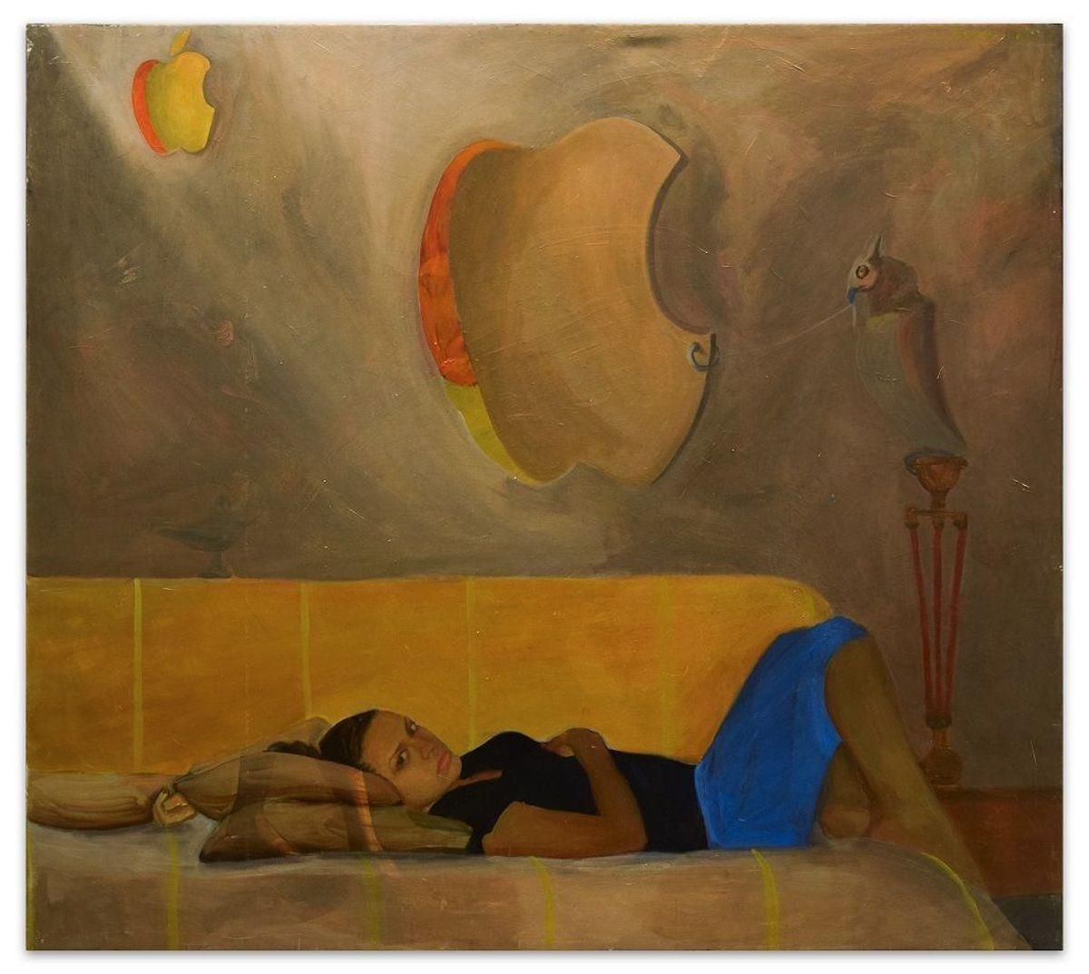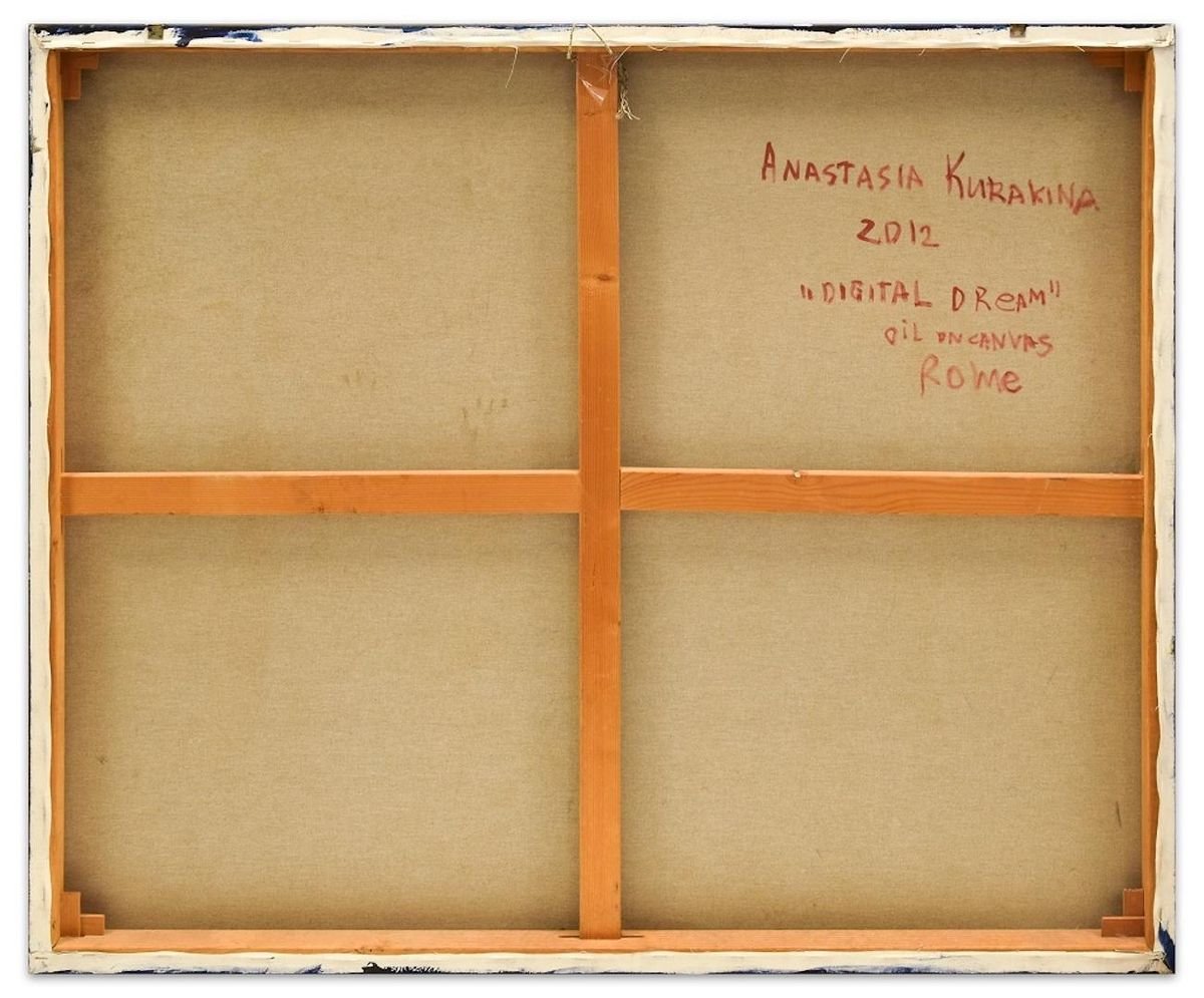 Digital Dream is an original oil painting on canvas, realized in 2012 by the emerging artist Anastasia Kurakina. Signature, title, technique, and date on the back. Realized in Rome in 2012 (as reported on the back). Very good conditions. This beautiful artwork represents a lying woman in a surreal composition. ANASTASIA KURAKINA was born in 1987 in Moscow (Russia). She studied in Moscow and in Rome. At present, she lives and works in Paris, London, Monte Carlo, Milan, Moscow, and Rome. Her psychologically analytical works are a kind of art fables. A simple image or object from life transforms into a metaphora of life itself in her paintings. Her portraits and graphic works are philosophical essence of visible and seeming reality. Art education: 2019 – Sorbonne University, Paris; 2012-2014 – MA Fine Art at the Academy of Fine Arts of Rome; 2007-2012 – Academy of Fine Arts of Rome; 1998-2005 – Moscow Academic Art Lyceum of the Academy of Fine Arts of Russia. Personal exhibitions: 2019 – Rome, Marino Gallery; 2018 –Milan, Zanuso Gallery; 2017 – London, Russian Cultu al Centre; 2017 –Luzern, Switzerland, International Comic Festival; 2017 – Rome, Russian Center of Culture and Science; 2016 – St.Petersburg, the Pushkinskaya 10 Art Center, Art League Gallery; 2016 – Porto Cervo, Sardinia, evening solo show at MDM Museum of Contemporary Art; 2016 – Rome, American Embassy; 2013 – Tolentino (MC), International Art Museum of Tolentino; 2006 – Moscow, Central House of Artist. Awards: 2017 – Rome, I prize of the national award “Arte &sport” of the AONI (National Italian Olympic Academy); 2015 – Rome, Adrenalina prize I prize; 2013 – Rome, Adrenalina prize under 35 and prize of the public, Museum of Contemporary Art MACRO; 2013 – Chieti, Milan, Golden Medal of «Illustrate Manzoni»award, Chieti-Milano Manzoni’s Museum, Italy; 2012 – Milan, Winner of the scholarship for the artistic research of Socetà Umanitaria of Milan; 2011 – Tolentino, I prize “City of Tolentino” of the 26th edition of the International Bienniale of Art Humor of Tolentino; 2008 – Modena, I prize “Under 25” of the national Competition of Contemporary Sacred Art “Familia Sancta“. Collective exhibitions: 2019 – London, UK Royal Watercolour Society’s Contemporary Watercolour Competition, Bankside gallery; 2018 – Sunderland, UK, Sunderland Museum un Winter Gardens; 2018 – Edinburgh, UK, Scottish National Portrait Gallery, BP Portrait Award; 2017 – Vatican, Vatican Museums, “Antico Presente” exhibition; 2017 – London, UK, Sunny Art Award exhibition, Sunny Art Center; 2017 – Exeter, UK, Royal Albert Memorial Museum and Art Gallery, BP Portrait Award; 2017 – London, UK, National Portrait Gallery, BP Portrait Award; 2017 – London, Works on paper Art Fair, Royal Geographic Society; 2016 – Sardinia, live painting at Il Novecento gallery; 2016 – Rome, live painting at Brasilian Embassy at Simone Ghera’s “Dance inside Brasil” exhibition; 2016 – Oxford, UK, Oxford International Art Fair; 2015 – Mexico, MUMEDI Mexican Museum of Design; 2015 – Cambridge, UK, Cambridge International Art Fair; 2015 – Rome, Museum of Contemporary art MACRO; 2013 – Los Angeles, La luz de Jesus Gallery; 2013 – Shanghai, International Art Fair of Contemporary Art; 2013 – Rome, Embassy of Iraq, Embassy of Egypt; 2013 – Venice, Arte Laguna Prize’s exhibition at Venice’s Arsenal; 2012 – Rome, «Green blood» at Dorothy Circus Gallery; 2011 – Museum of Roman Cilvilization in Rome; 2010 – Naples, “Biennial of the artist’s book”; 2009 – La Paz, Bolivia, 4° Bienal Internacional Siart; 2008 – Bari, 28th International Fair of modern and contemporary Art; 2008 – Moscow, “Art Manezh 2008”, Central Exhibitions Hall Manege. Collections: Vatican Museums; Nina lobanova-Rostovskaya (London); National Museum of Sacred Art of Nonantola (Italy); Marchese Sacchetti (Rome); National Centre for Manzoni’s Studies (Milan). (private collections in Italy, UK, Russia, Germany)