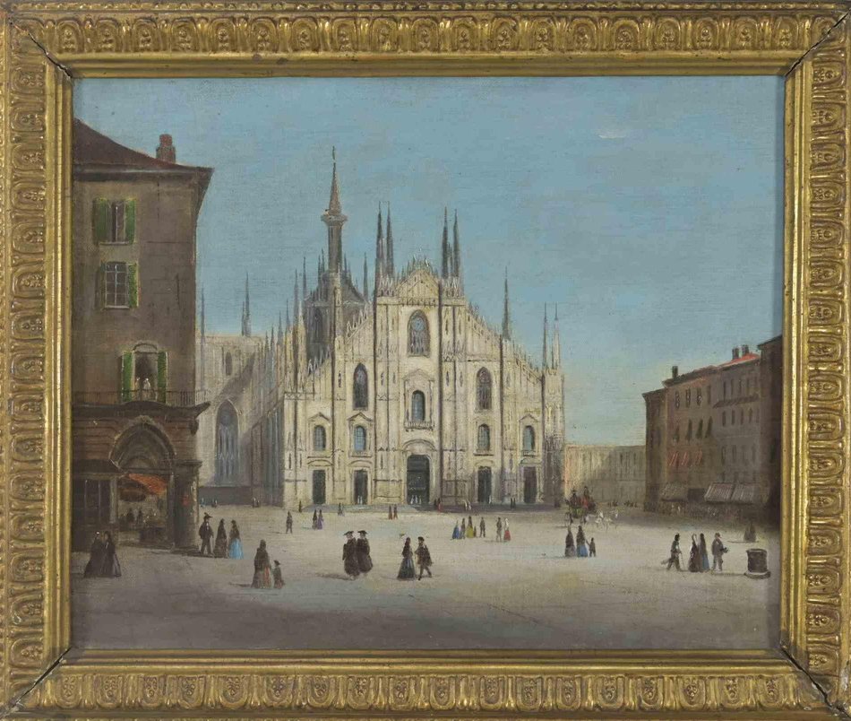 Duomo of Milan with Peasants, Oil Painting, 18th Century, Framed