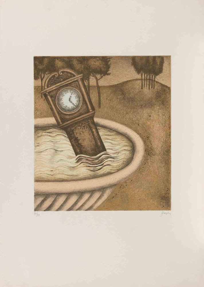 Enrico Benaglia, The Clock in the Fountain, Etching, 1990s