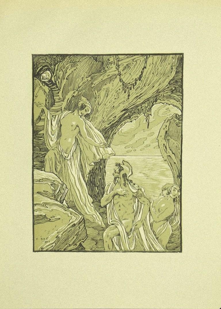 Ulysses and the Sorceress is an original modern artwork realized by Ferdinand Bac (1859 - 1952) in 1922. Signed and dated on plate on the lower left corner: F. Bac 1922. Original Lithograph on ivory paper. Perfect conditions. Ulysses and the Sorceress is an excellent Liberty artwork realized by Ferdinand Bac in the second decade of the XX Century. The work is in full Liberty style and depicts a man, Ulysses surrounded by two figures. The famous sorceress Circe appears on the upper left corner and a second female figure is going to stop him. They are into a sea cave and, on the background, we can see the surface of the sea. This work has been realized the French artist Ferdinand Bac (1859 - 1952). Ferdinand-Sigismond Bach, known as Ferdinand Bac was a French cartoonist, artist and writer, son of an illegitimate nephew of the Emperor Napoleon. As a young man, he mixed in the fashionable world of Paris of the Belle Époque, and was known for his caricatures, which appeared in popular journals. He also traveled widely in Europe and the Mediterranean. In his fifties, he began a career as a landscape gardener. He attended Adolphe Thiers, Gambetta, Richard Wagner, Victor Hugo, Taine, Villiers de L'Isle-Adam, Paul Verlaine, Maurice Barrès, Barbey d'Aurevilly, Alphonse Daudet, Guy de Maupassant, Verdi, Gounod, Pierre de Nolhac, and many more other famous people of the time. He established himself as one of the first cartoonists and caricaturists of his time, as famous as Albert Robida, Job, Sem, Jean-Louis Forain or Caran d'Ache. Ferdinand alternated between Colombières and a beautiful mansion in Compiègne that also belonged to the Ladan-Bockairys. There he met Marcel Proust, Jean Cocteau, Gabriele D'Annunzio and Anna de Noailles. Until the end of his life, Ferdinand Bac continued to travel, write and draw, reflecting on the political and historical development of the world.