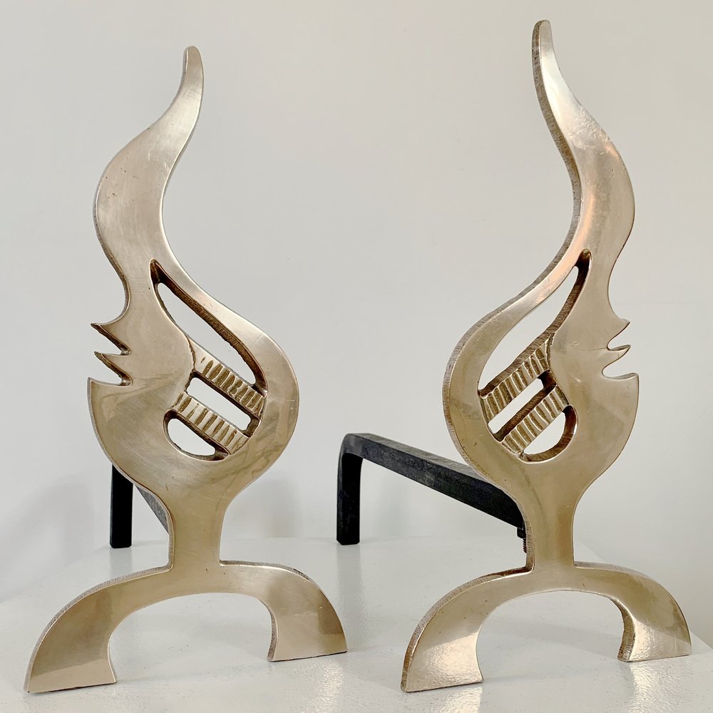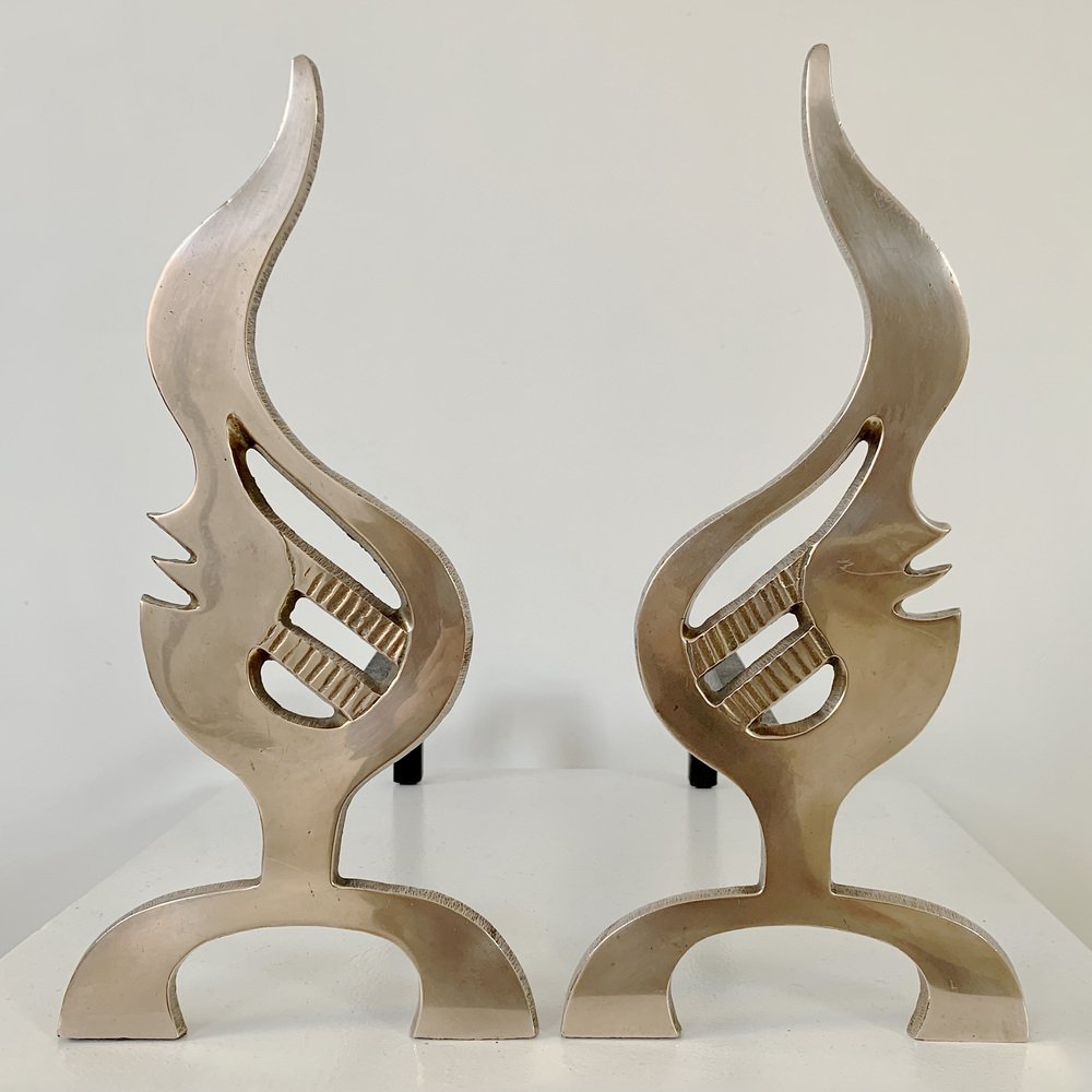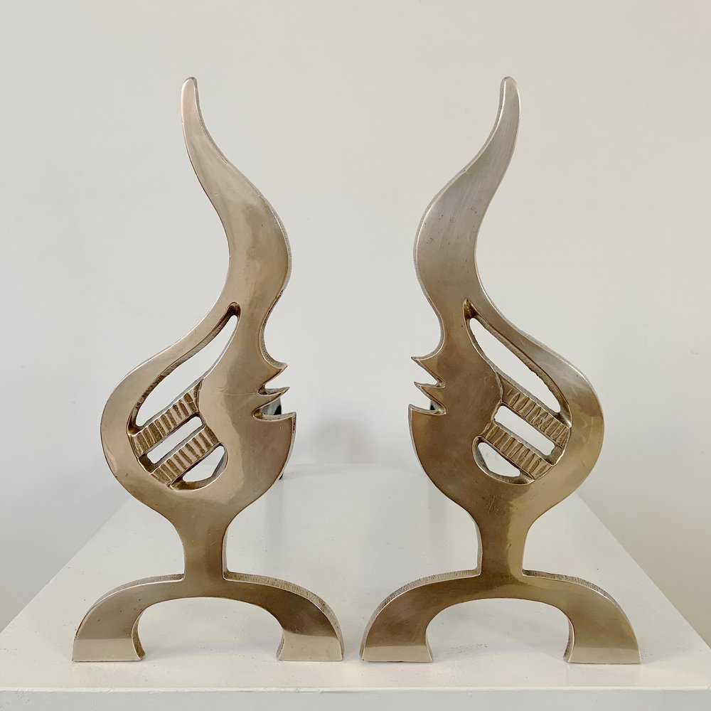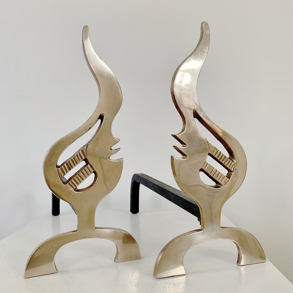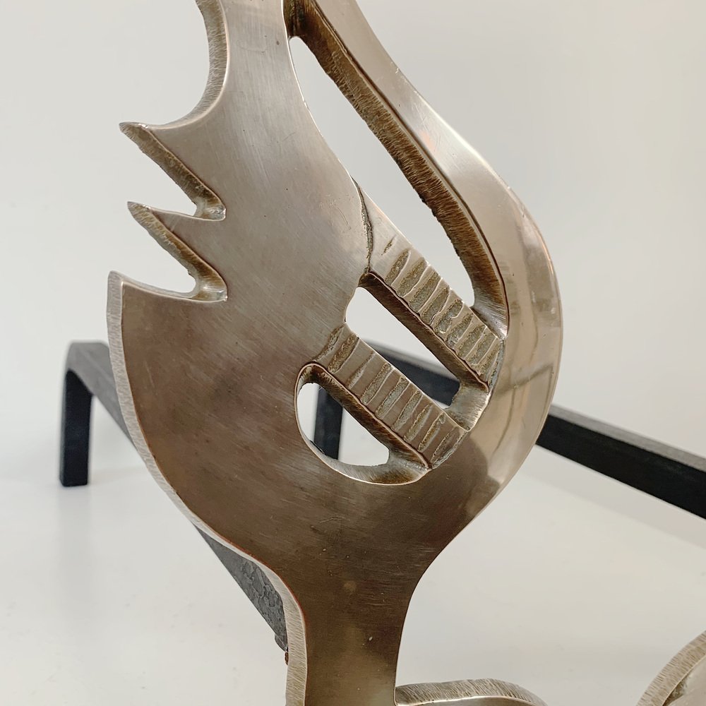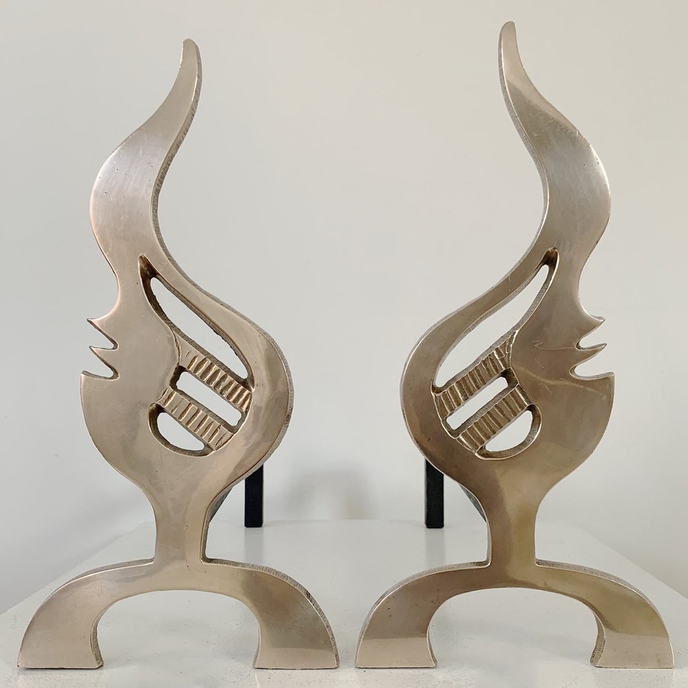 Flame Brass Andirons, France, 1960s, Set of 2