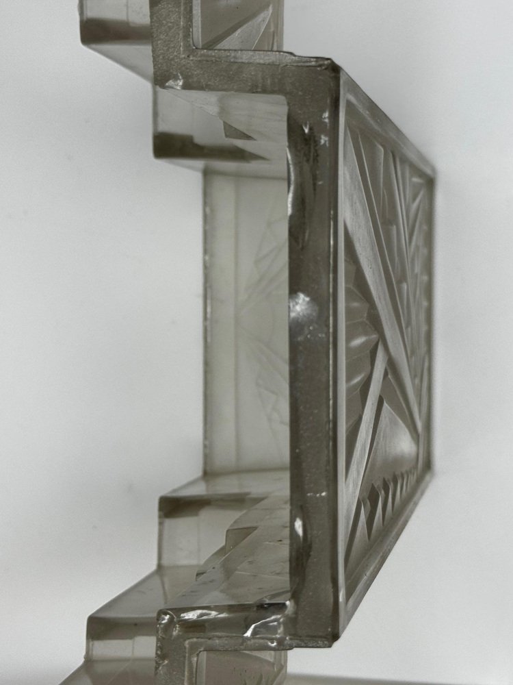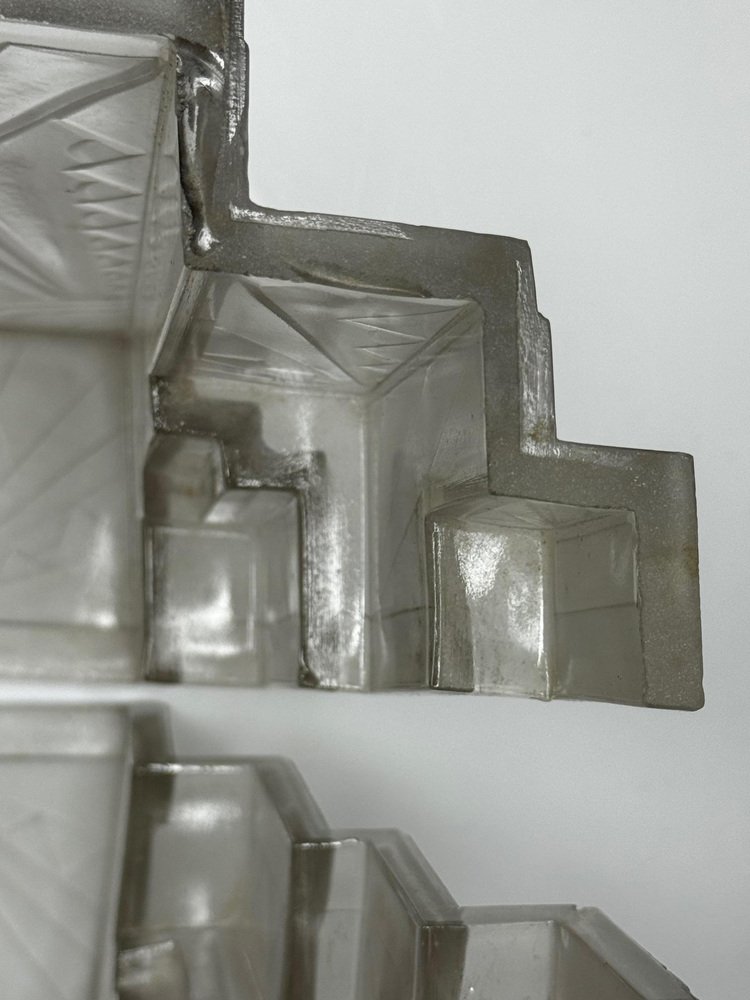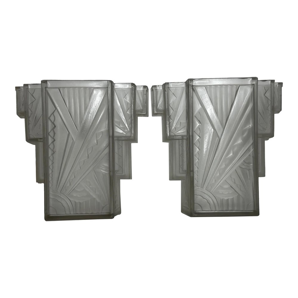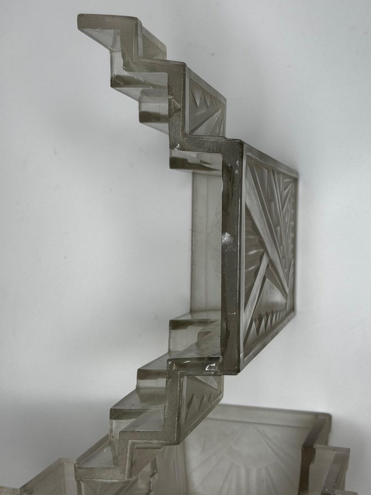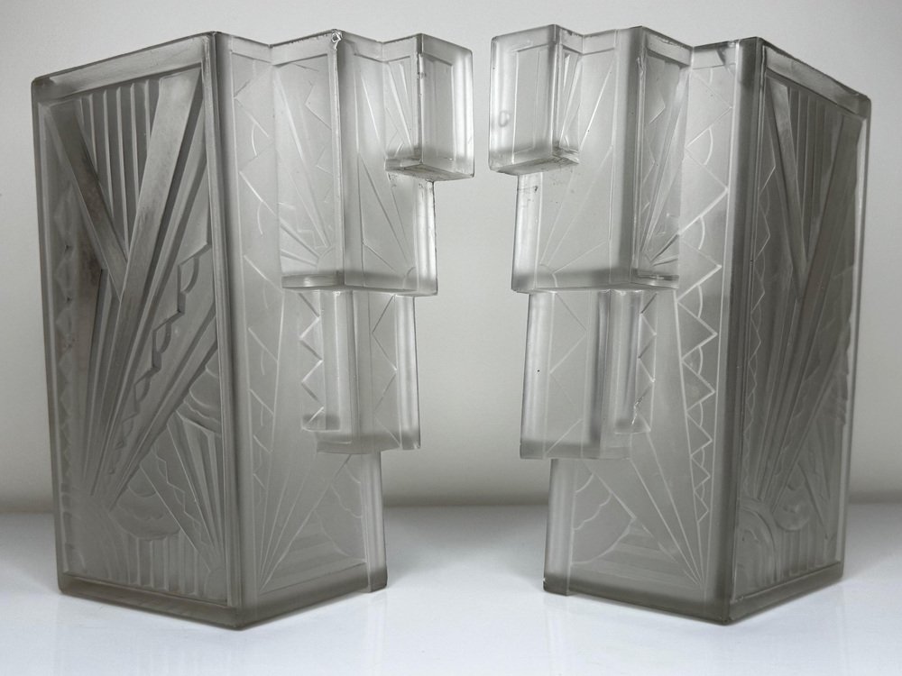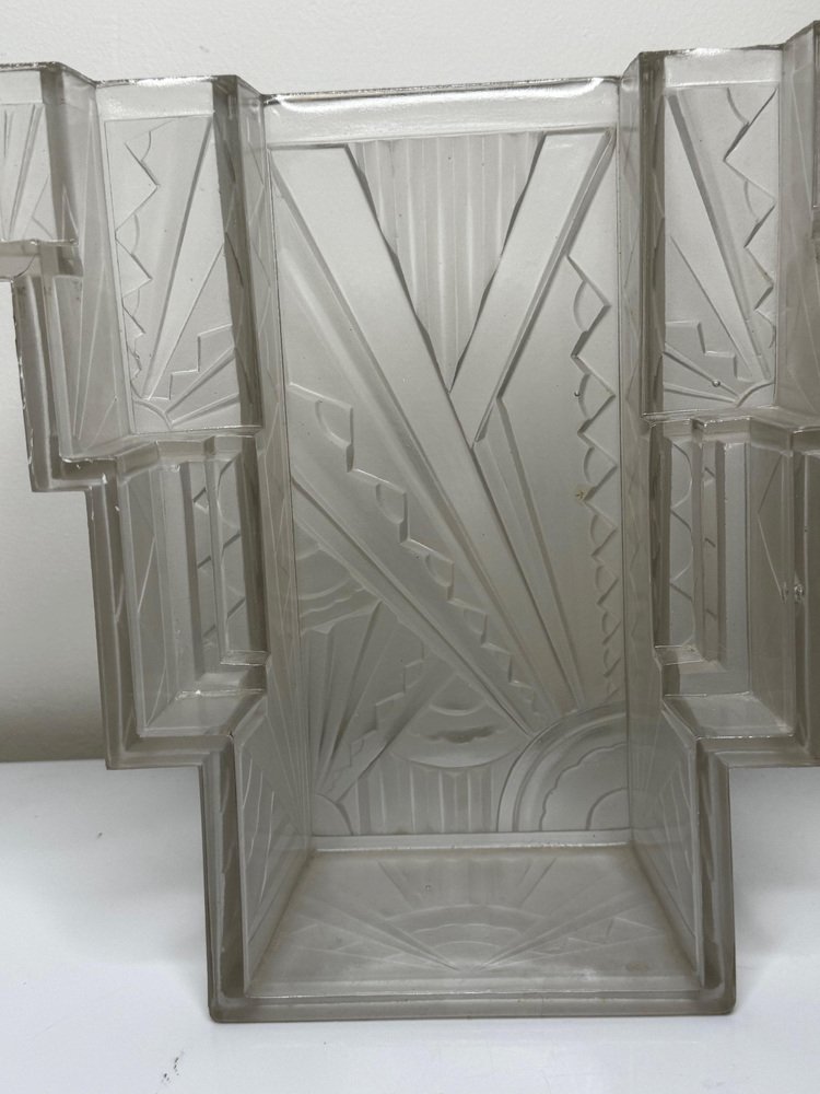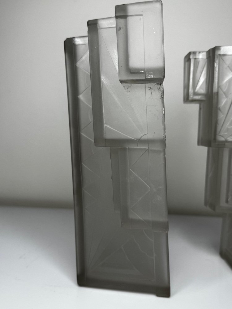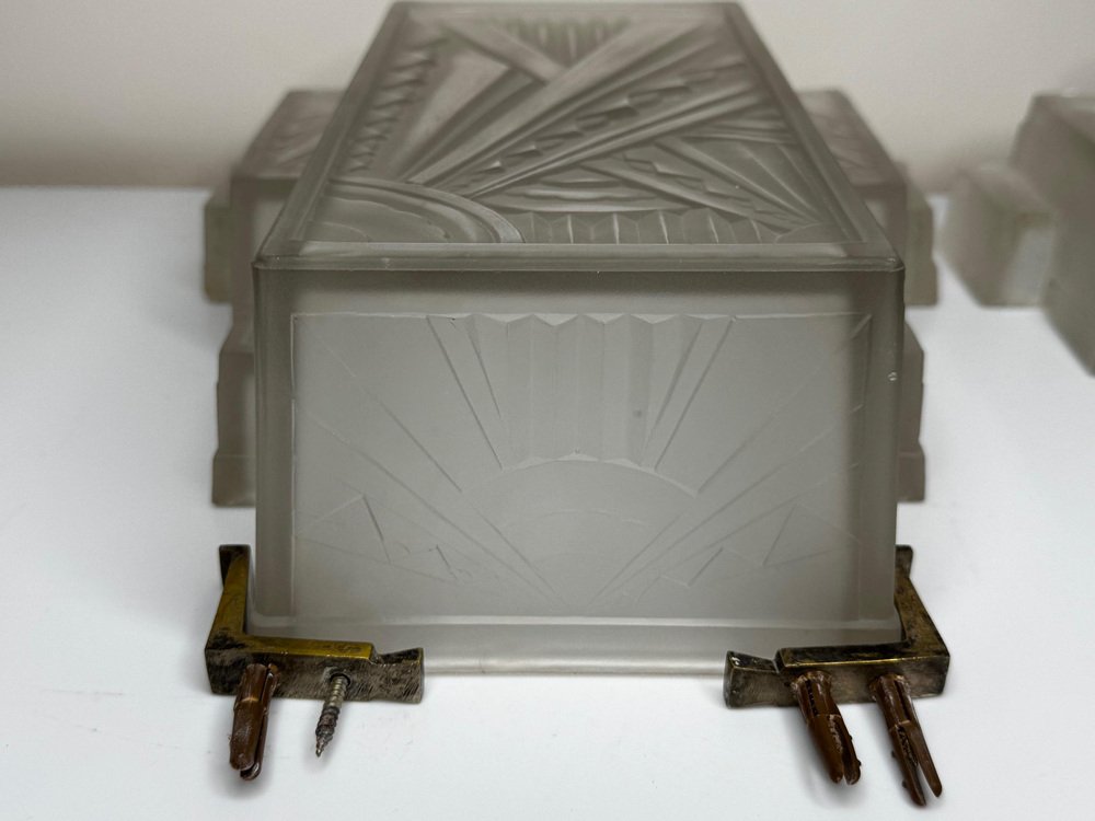 Pair of Rare Exquisite French Art Deco Moulded & Frosted “Skyscraper” Glass Wall Appliqués / Light Sconces in the Manner of Marius-Ernest Sabino, c.1930 A striking pair of French Art Deco moulded and frosted glass wall light shades, circa 1930. Each shade is conceived as a miniature architectural façade: a tall central panel flanked by stepped, tiered “wings” which create a strong, three-dimensional skyscraper profile. They are crafted from heavy, moulded (pressed) glass, giving real substance and crisp definition to the relief work. The surface has a frosted, almost satin finish, achieved by acid-etching or sandblasting. This treatment gently softens the planes of the design, diffusing the light emitted from within and throwing a smooth, even glow across the wall, while the raised motifs remain slightly clearer. When lit, those clearer high points act almost like facets, catching and refracting the light to emphasise the sculptural modelling of the glass. from the front, the design reads as a series of overlapping rectilinear planes, rising and falling in shallow terraces like a ziggurat. from the side, the staggered blocks and cantilevered upper section give a crisp, layered silhouette that projects elegantly from the wall. Within this framework, bold radiating sunburst rays slice diagonally across the surface, intersected by zig-zag and fan motifs in high relief. The shades retain their four original brass support fixings – simple period bent brass wall brackets – which hold each piece slightly off the wall so they read as small illuminated architectural panels rather than conventional sconces. The powerful geometry, stepped “skyscraper” outline and dynamic rays are very much in the manner of Marius-Ernest Sabino’s moulded-glass lighting, and closely comparable in idiom to designs by Établissements Jean Gauthier (EJG / Ezan) and Verreries des Hanots. Although unsigned, the quality, weight and design vocabulary are entirely consistent with French Art Deco glass of the interwar years. About Sabino Marius-Ernest Sabino (1878–1961) was one of the leading French Art Deco glassmakers. Sicilian-born and Paris-trained, he studied at the École des Arts Décoratifs and the Beaux-Arts before founding his own glassworks in Paris, specialising in thick press-moulded and often opalescent glass for lighting, vases and figural pieces. Sabino’s output is characterised by rich relief work, strong geometric silhouettes and dramatic rays or radiating motifs, especially in wall lights, plafonniers and chandeliers. Many designs use heavy moulded glass with satin or opalescent finishes that come alive when lit, making his pieces highly sought after by collectors today. While this pair is not signed and cannot be attributed to his workshop, the stepped skyscraper form, radiating sunbursts and use of heavy moulded glass with a satin finish place them firmly in the same design language – hence the “in the manner of Sabino”. Provenance from the collection of the late Philip Clarkson (1949–2025), graphic designer, photographer and noted collector of 20th-century design and popular culture. Previously sold through a notable auction house near Chester and curated by Cheshire Antiques Consultant LTD. Historical context By the late 1920s and early 1930s, Art Deco had become the dominant modern style in architecture, interiors and decorative arts, with Paris as one of its key centres. The 1925 Exposition Internationale des Arts Décoratifs et Industriels Modernes in Paris helped launch the new look internationally: streamlined forms, bold geometry, stylised rays and zig-zags, often combined with luxurious materials and dramatic lighting. Advances in pressed- and moulded-glass technology during the interwar years allowed French factories to produce thick, sculptural shades at scale. These new techniques aligned perfectly with the “machine-age” aesthetic of Deco and made high-impact glass lighting more affordable, so pieces in this idiom found their way into cinemas, department stores, shopfronts and modern flats across Europe. Wall lights like this pair, with their radiating sunbursts and stepped “skyscraper” profiles, echoed the silhouettes of contemporary high-rise architecture and cinema façades. They were designed not just to illuminate, but to act as architectural features in their own right – casting a soft, diffused glow while their raised, clearer details sparkle and catch the eye. Today, authentic interwar moulded-glass shades of this quality are increasingly prized as surviving fragments of that glamorous early-electric age. Why you’ll love them Serious Deco impact: The strong skyscraper silhouette and bold sunburst relief deliver instant 1930s cinema-lobby glamour on any wall. Beautifully lit atmosphere: The satin-frosted glass throws a soft, flattering glow, while the clearer raised motifs sparkle subtly when lit. Architectural presence: More like illuminated glass panels than ordinary sconces – they read as sculptural objects even when switched off. Authentic interwar quality: Heavy, well-made moulded glass and original brass brackets give reassuring weight and character you don’t get with modern reproductions. Versatile placement: Perfect flanking a mirror, doorway or fireplace, or as statement lighting in a hallway, stairwell or home cinema room. Details Date: c.1930 Origin: France, Continental Europe Materials: Heavy moulded/pressed clear glass with frosted “satin” finish; brass support fixings Dimensions (each): Height: approx. 26 cm (c. 10¼ in) Width: approx. 26.3 cm (c. 10⅜ in) Depth: just under 10 cm (c. 4 in) Weight (each): approx. 2.2 kg