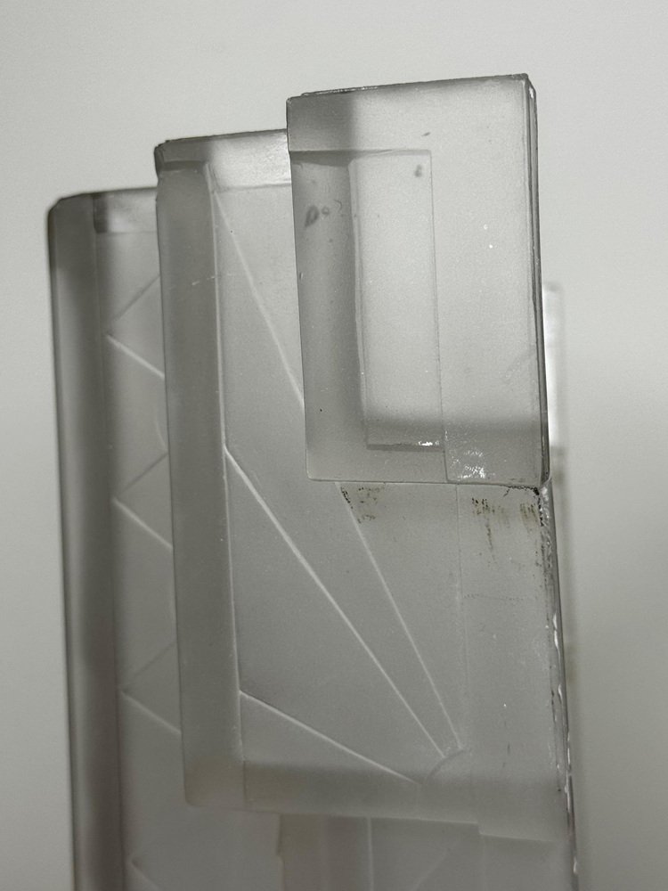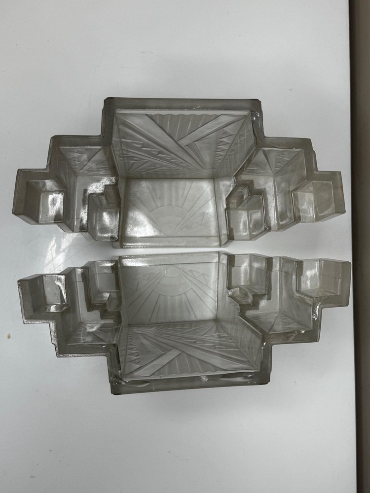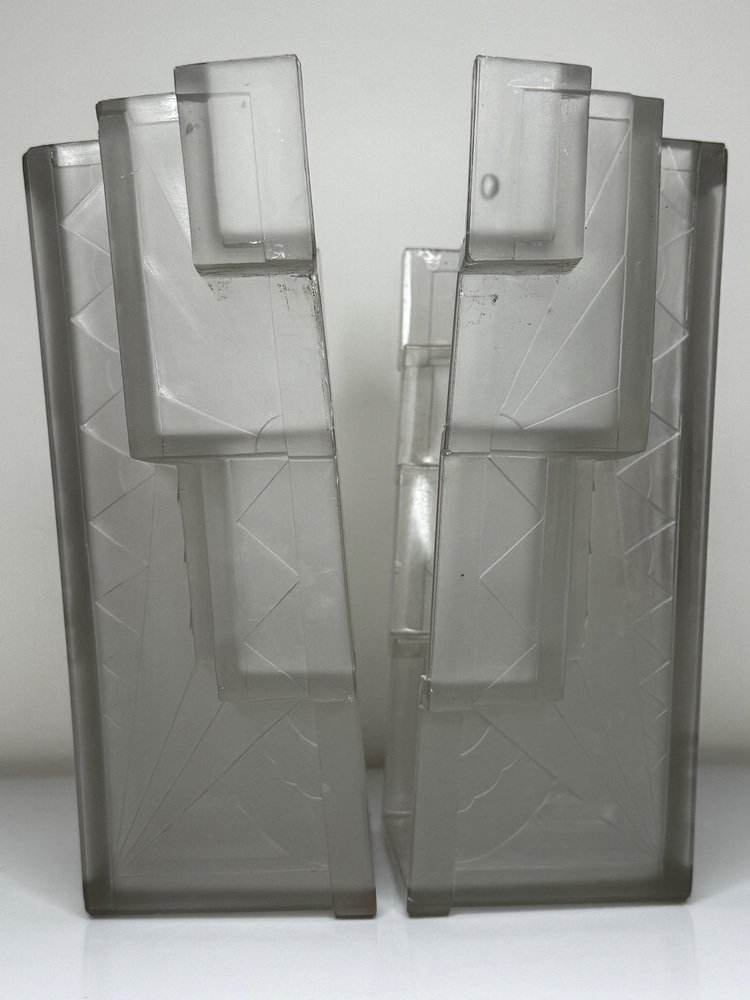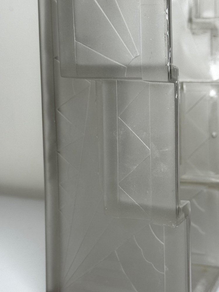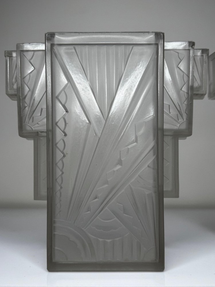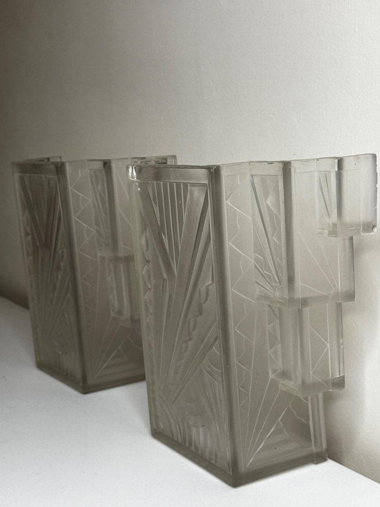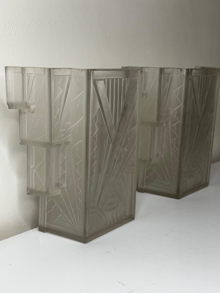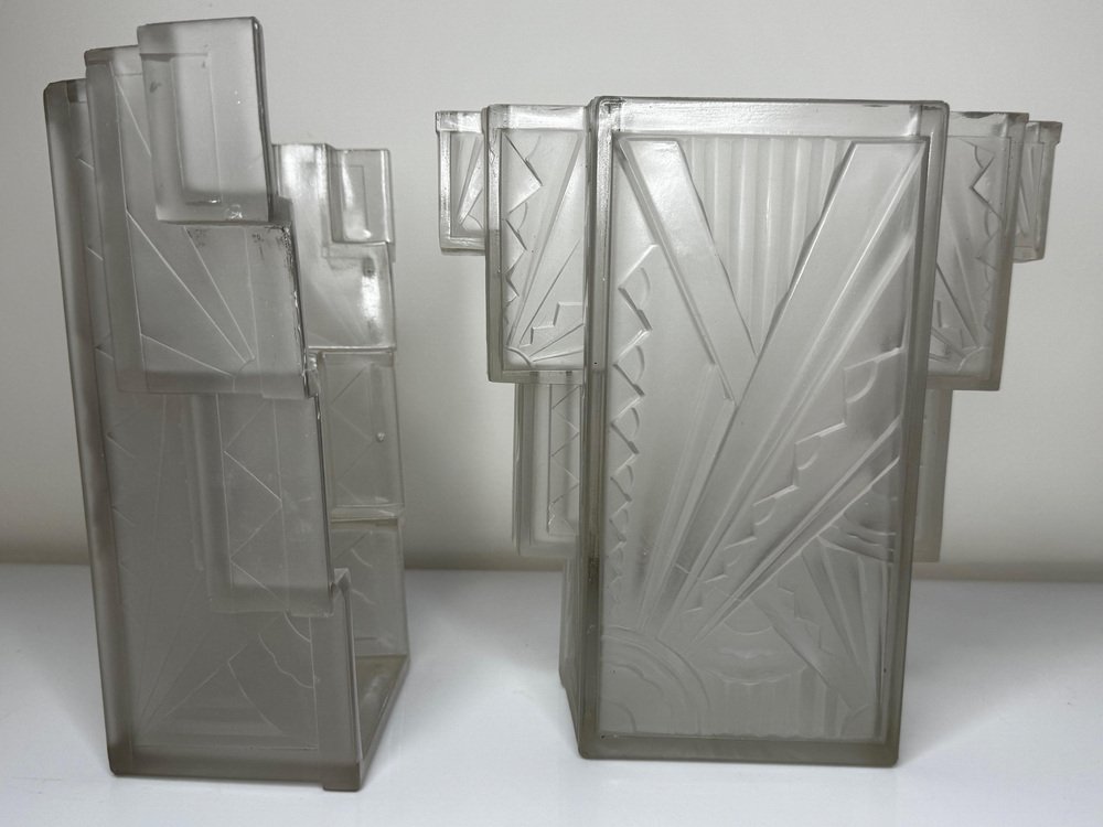 Pair of Rare Exquisite French Art Deco Moulded & Frosted “Skyscraper” Glass Wall Appliqués / Light Sconces in the Manner of Marius-Ernest Sabino, c.1930 A striking pair of French Art Deco moulded and frosted glass wall light shades, circa 1930. Each shade is conceived as a miniature architectural façade: a tall central panel flanked by stepped, tiered “wings” which create a strong, three-dimensional skyscraper profile. They are crafted from heavy, moulded (pressed) glass, giving real substance and crisp definition to the relief work. The surface has a frosted, almost satin finish, achieved by acid-etching or sandblasting. This treatment gently softens the planes of the design, diffusing the light emitted from within and throwing a smooth, even glow across the wall, while the raised motifs remain slightly clearer. When lit, those clearer high points act almost like facets, catching and refracting the light to emphasise the sculptural modelling of the glass. from the front, the design reads as a series of overlapping rectilinear planes, rising and falling in shallow terraces like a ziggurat. from the side, the staggered blocks and cantilevered upper section give a crisp, layered silhouette that projects elegantly from the wall. Within this framework, bold radiating sunburst rays slice diagonally across the surface, intersected by zig-zag and fan motifs in high relief. The shades retain their four original brass support fixings – simple period bent brass wall brackets – which hold each piece slightly off the wall so they read as small illuminated architectural panels rather than conventional sconces. The powerful geometry, stepped “skyscraper” outline and dynamic rays are very much in the manner of Marius-Ernest Sabino’s moulded-glass lighting, and closely comparable in idiom to designs by Établissements Jean Gauthier (EJG / Ezan) and Verreries des Hanots. Although unsigned, the quality, weight and design vocabulary are entirely consistent with French Art Deco glass of the interwar years. About Sabino Marius-Ernest Sabino (1878–1961) was one of the leading French Art Deco glassmakers. Sicilian-born and Paris-trained, he studied at the École des Arts Décoratifs and the Beaux-Arts before founding his own glassworks in Paris, specialising in thick press-moulded and often opalescent glass for lighting, vases and figural pieces. Sabino’s output is characterised by rich relief work, strong geometric silhouettes and dramatic rays or radiating motifs, especially in wall lights, plafonniers and chandeliers. Many designs use heavy moulded glass with satin or opalescent finishes that come alive when lit, making his pieces highly sought after by collectors today. While this pair is not signed and cannot be attributed to his workshop, the stepped skyscraper form, radiating sunbursts and use of heavy moulded glass with a satin finish place them firmly in the same design language – hence the “in the manner of Sabino”. Provenance from the collection of the late Philip Clarkson (1949–2025), graphic designer, photographer and noted collector of 20th-century design and popular culture. Previously sold through a notable auction house near Chester and curated by Cheshire Antiques Consultant LTD. Historical context By the late 1920s and early 1930s, Art Deco had become the dominant modern style in architecture, interiors and decorative arts, with Paris as one of its key centres. The 1925 Exposition Internationale des Arts Décoratifs et Industriels Modernes in Paris helped launch the new look internationally: streamlined forms, bold geometry, stylised rays and zig-zags, often combined with luxurious materials and dramatic lighting. Advances in pressed- and moulded-glass technology during the interwar years allowed French factories to produce thick, sculptural shades at scale. These new techniques aligned perfectly with the “machine-age” aesthetic of Deco and made high-impact glass lighting more affordable, so pieces in this idiom found their way into cinemas, department stores, shopfronts and modern flats across Europe. Wall lights like this pair, with their radiating sunbursts and stepped “skyscraper” profiles, echoed the silhouettes of contemporary high-rise architecture and cinema façades. They were designed not just to illuminate, but to act as architectural features in their own right – casting a soft, diffused glow while their raised, clearer details sparkle and catch the eye. Today, authentic interwar moulded-glass shades of this quality are increasingly prized as surviving fragments of that glamorous early-electric age. Why you’ll love them Serious Deco impact: The strong skyscraper silhouette and bold sunburst relief deliver instant 1930s cinema-lobby glamour on any wall. Beautifully lit atmosphere: The satin-frosted glass throws a soft, flattering glow, while the clearer raised motifs sparkle subtly when lit. Architectural presence: More like illuminated glass panels than ordinary sconces – they read as sculptural objects even when switched off. Authentic interwar quality: Heavy, well-made moulded glass and original brass brackets give reassuring weight and character you don’t get with modern reproductions. Versatile placement: Perfect flanking a mirror, doorway or fireplace, or as statement lighting in a hallway, stairwell or home cinema room. Details Date: c.1930 Origin: France, Continental Europe Materials: Heavy moulded/pressed clear glass with frosted “satin” finish; brass support fixings Dimensions (each): Height: approx. 26 cm (c. 10¼ in) Width: approx. 26.3 cm (c. 10⅜ in) Depth: just under 10 cm (c. 4 in) Weight (each): approx. 2.2 kg