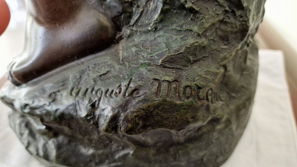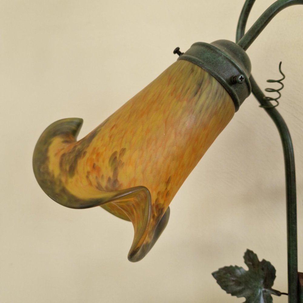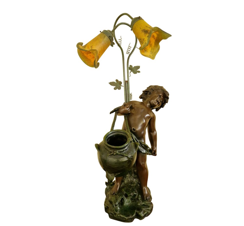 French Art Nouveau Table Lamp with Bronze Figure of Auguste Moreau and Glass Lampshades