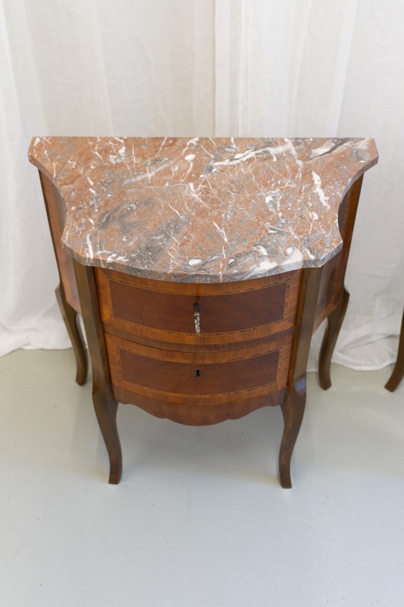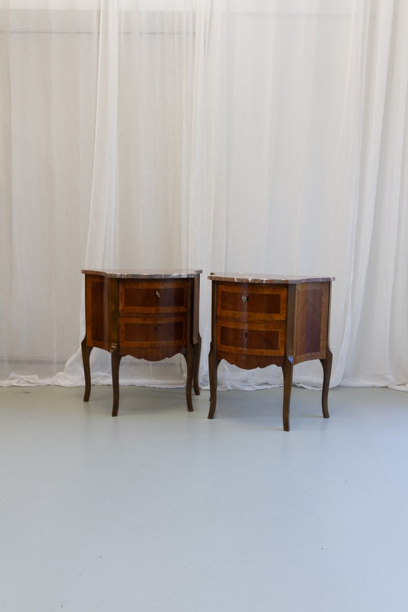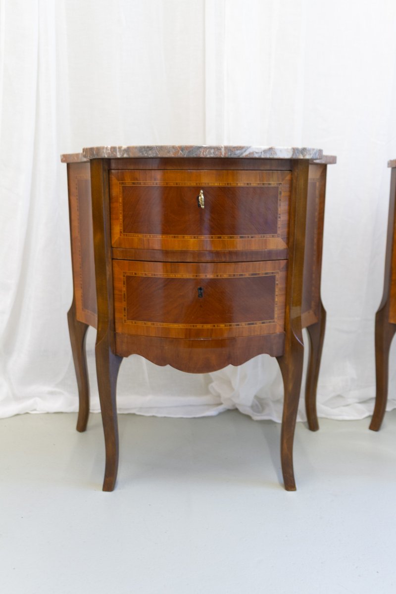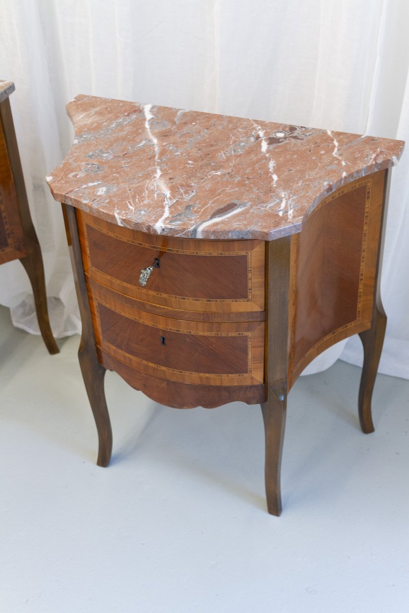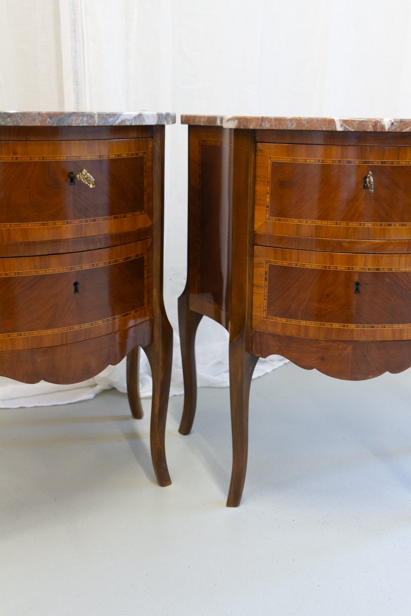 French Louis XV Marquetry Nightstands with Marble Tops, 1910s, Set of 2