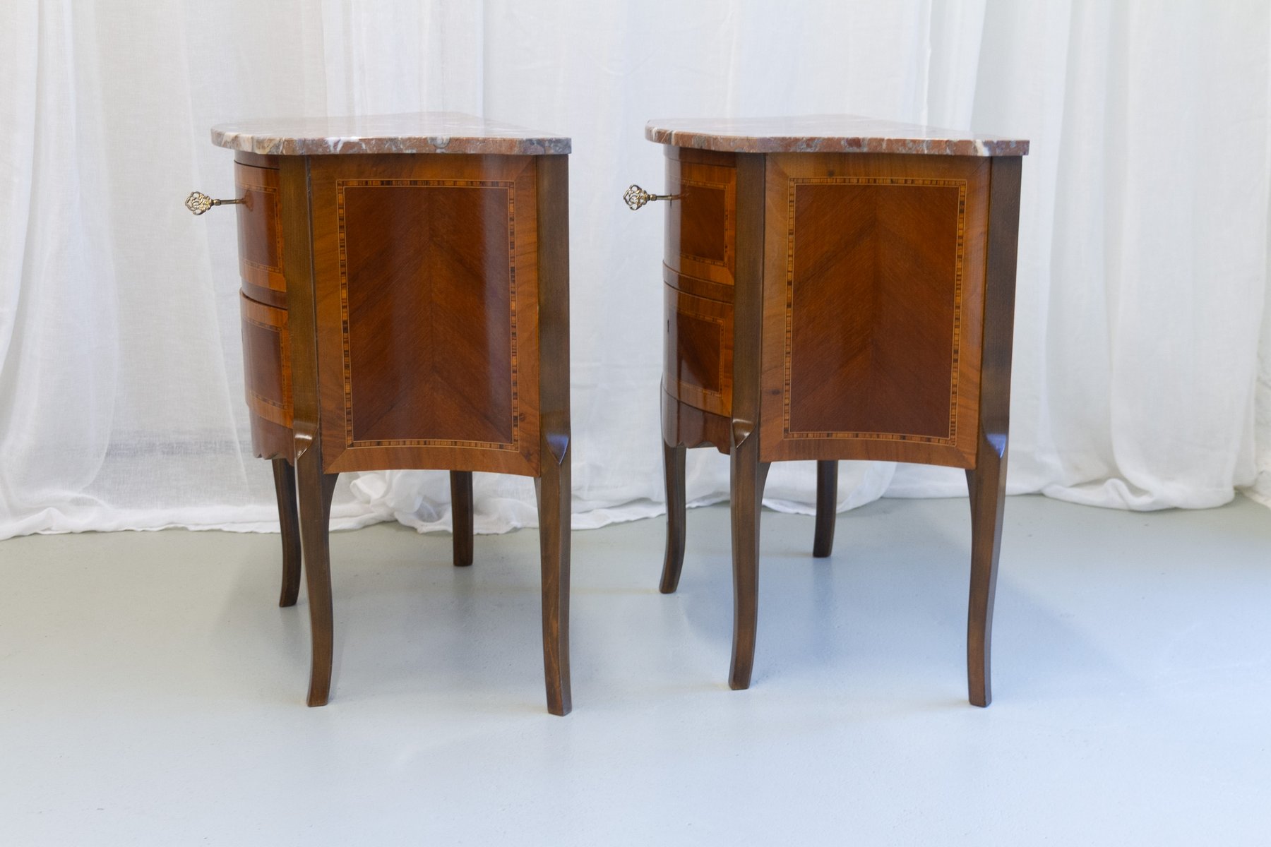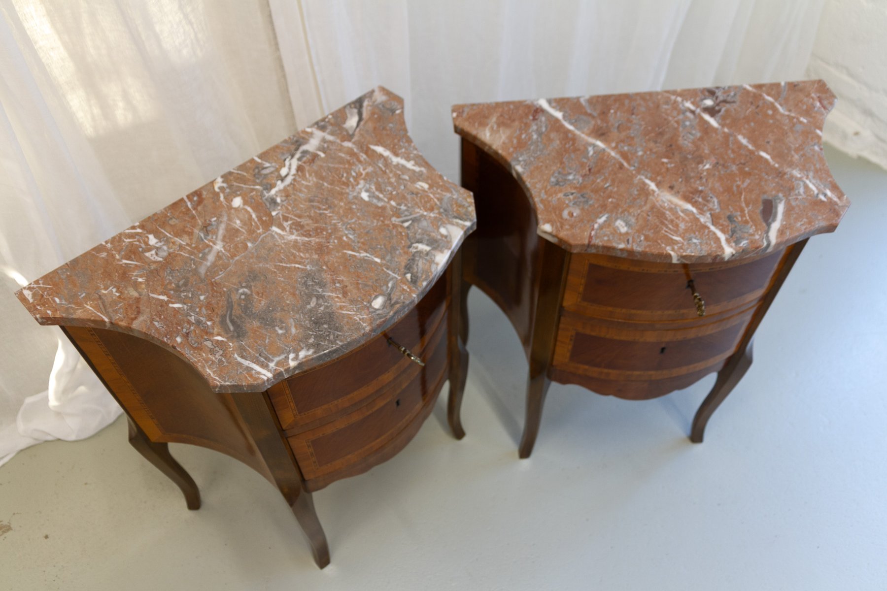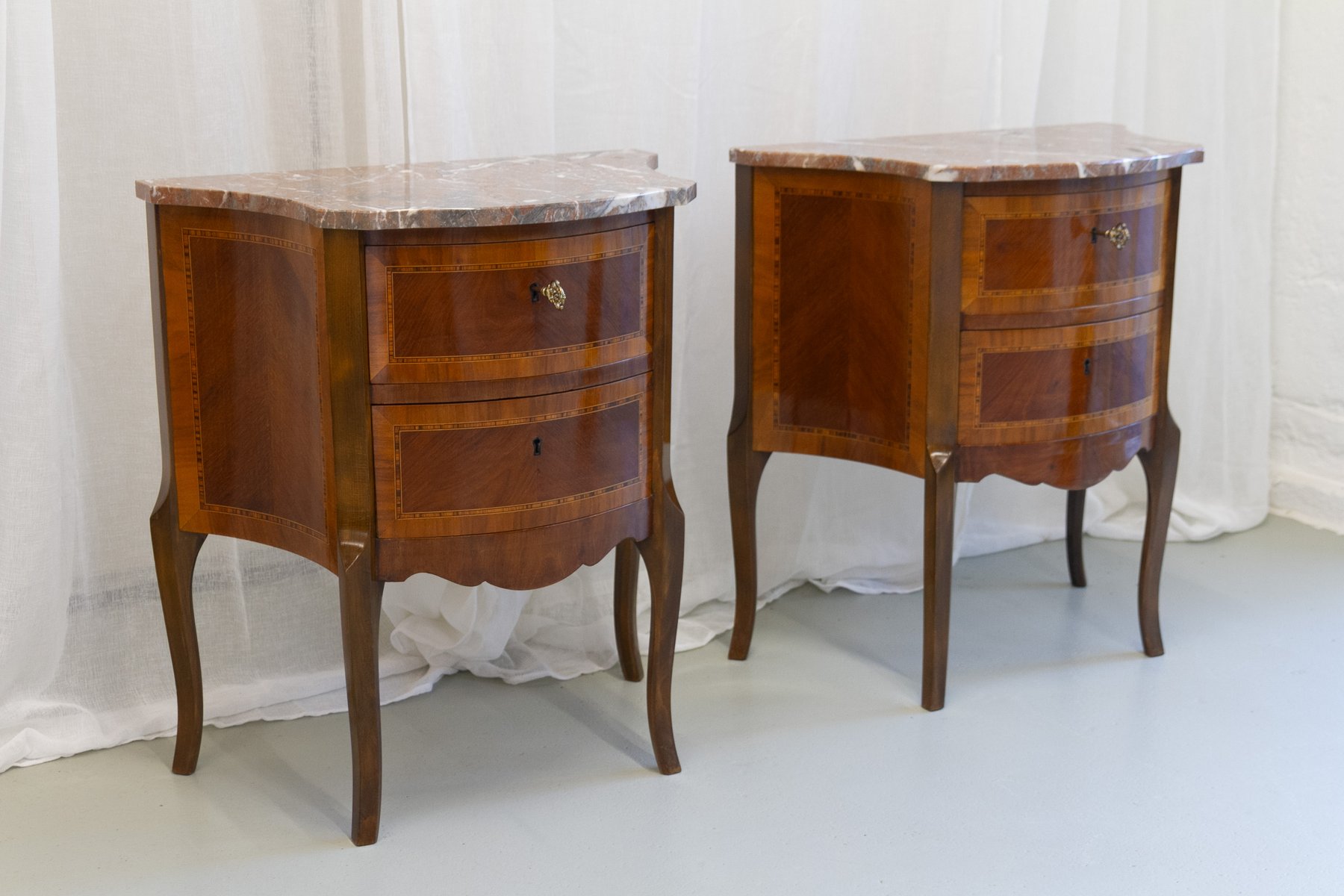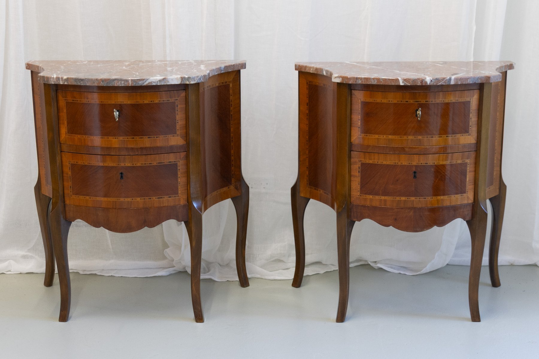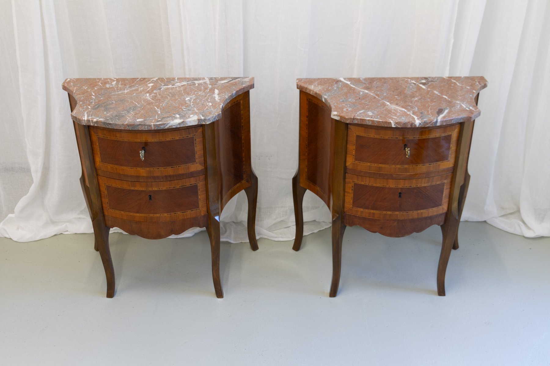 French Louis XV Marquetry Nightstands with Marble Tops, 1910s, Set of 2