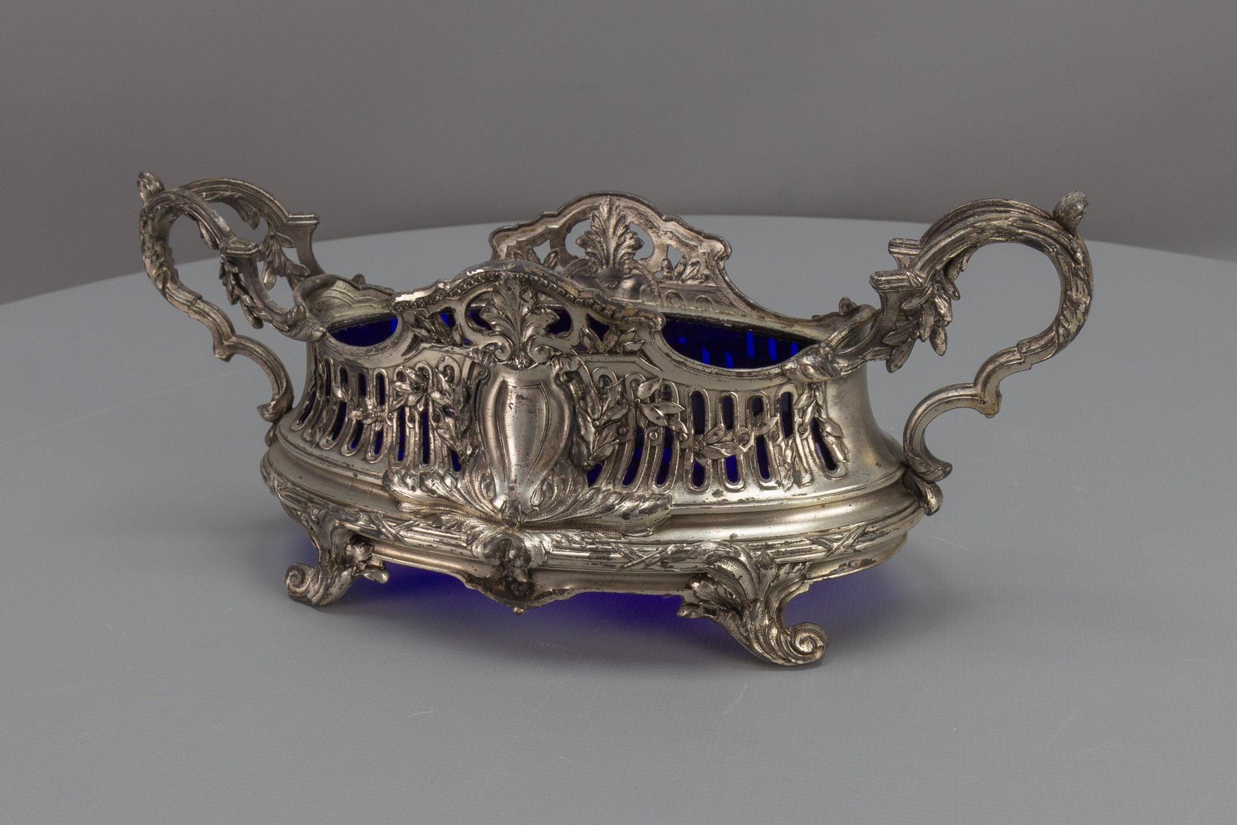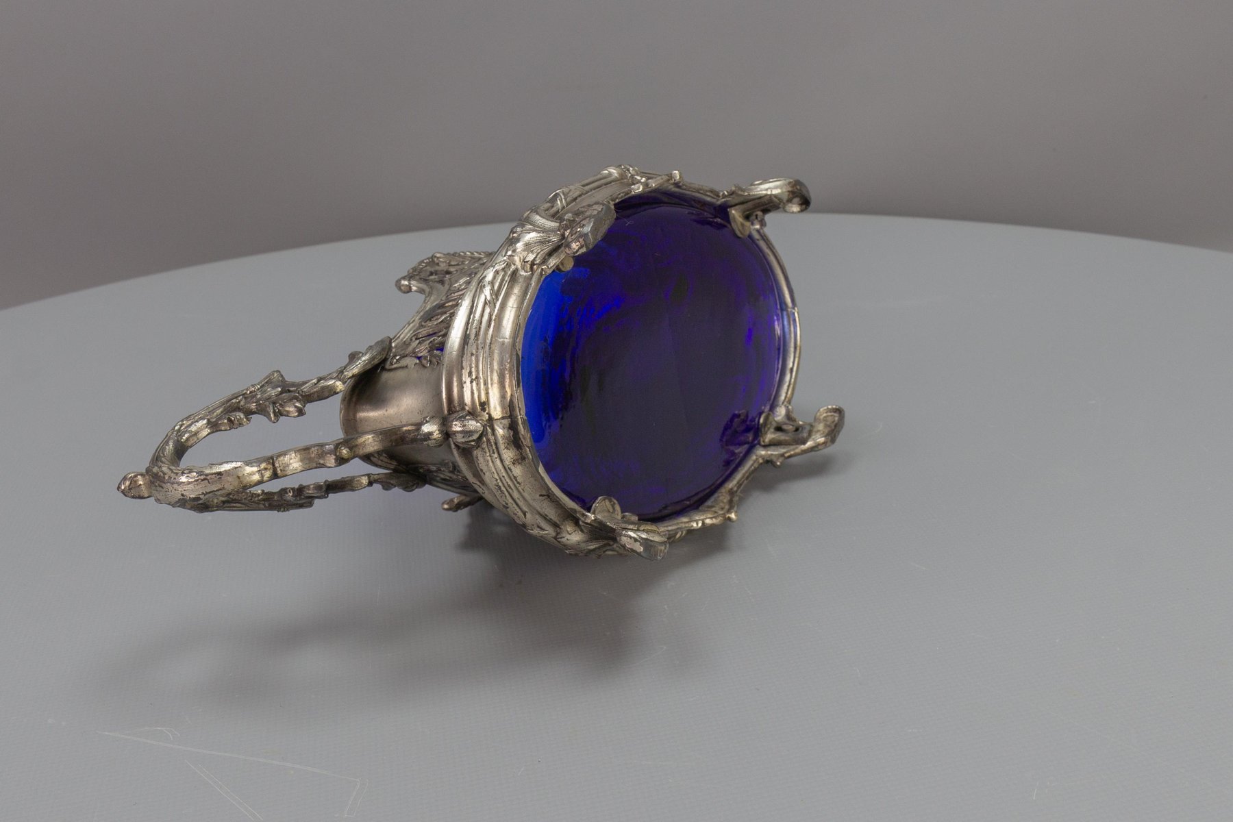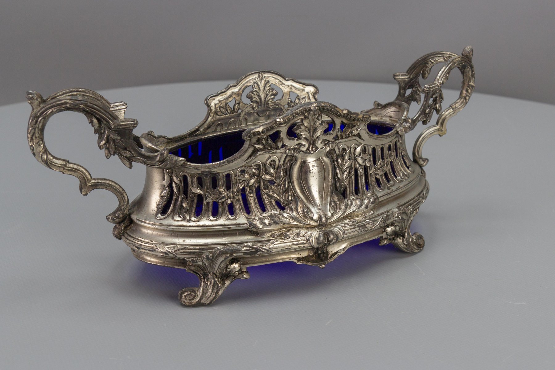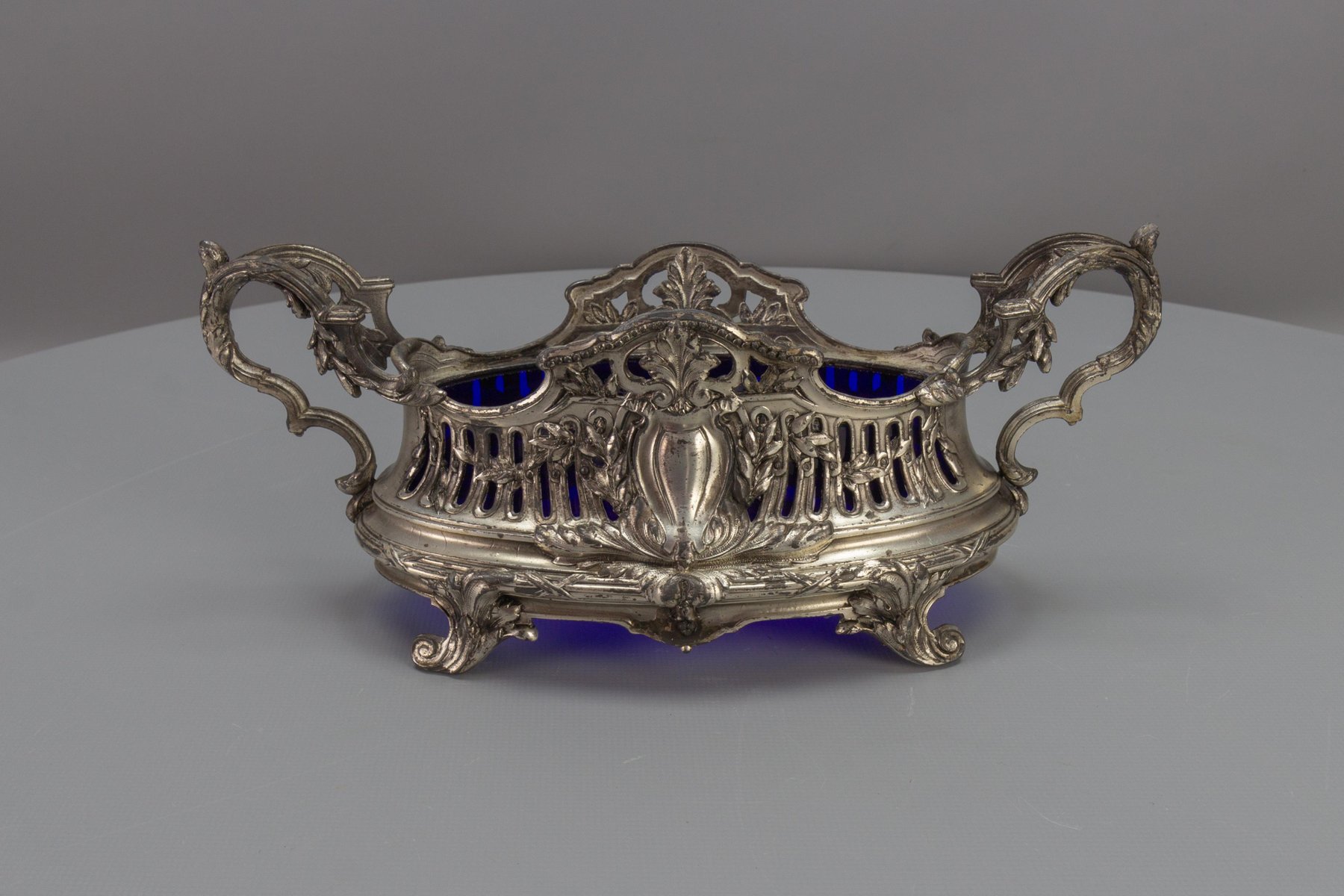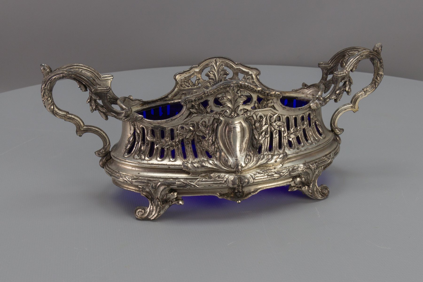 French Neoclassical Style Pewter and Indigo Blue Glass Centerpiece, Jardiniere, 1920s