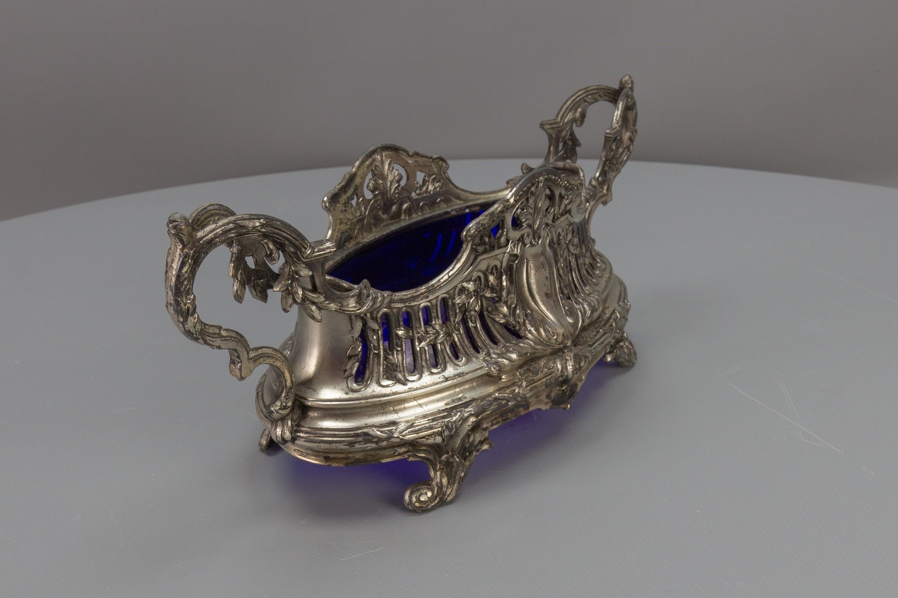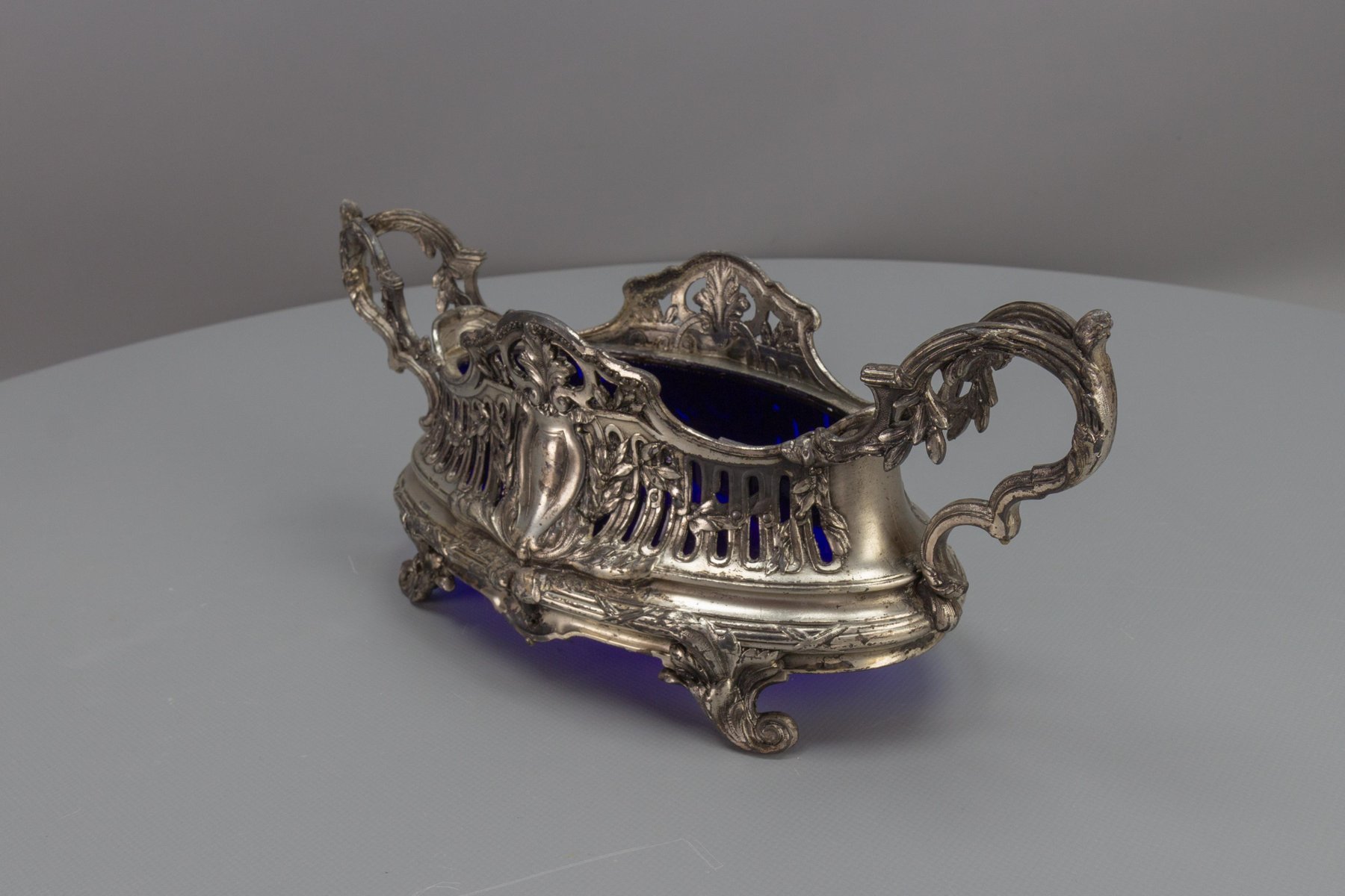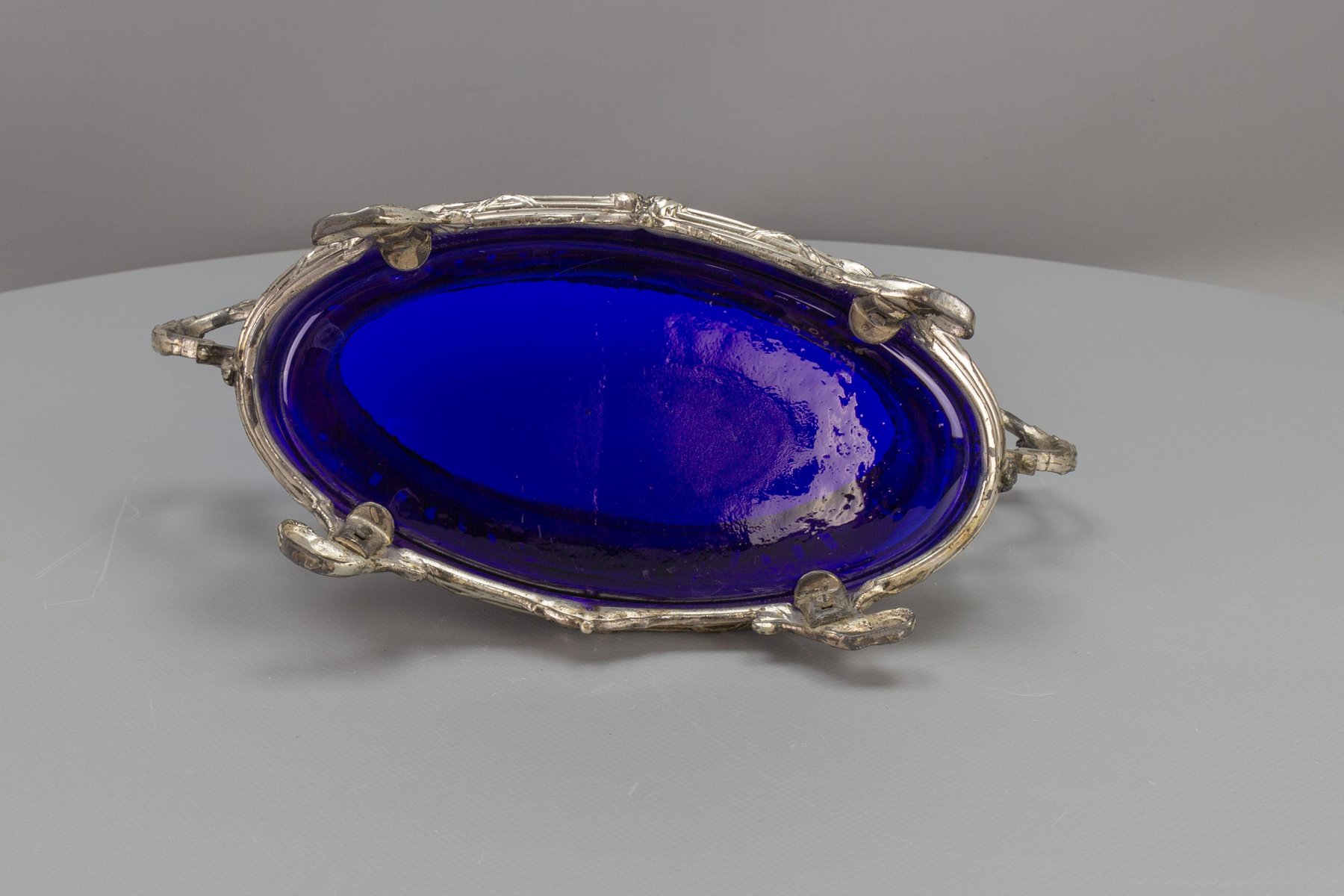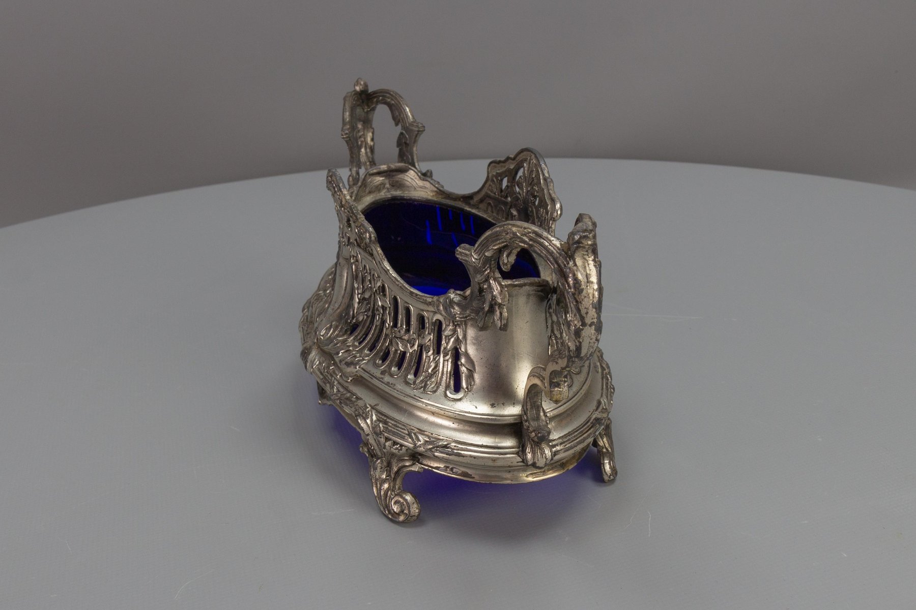 French Neoclassical Style Pewter and Indigo Blue Glass Centerpiece, Jardiniere, 1920s