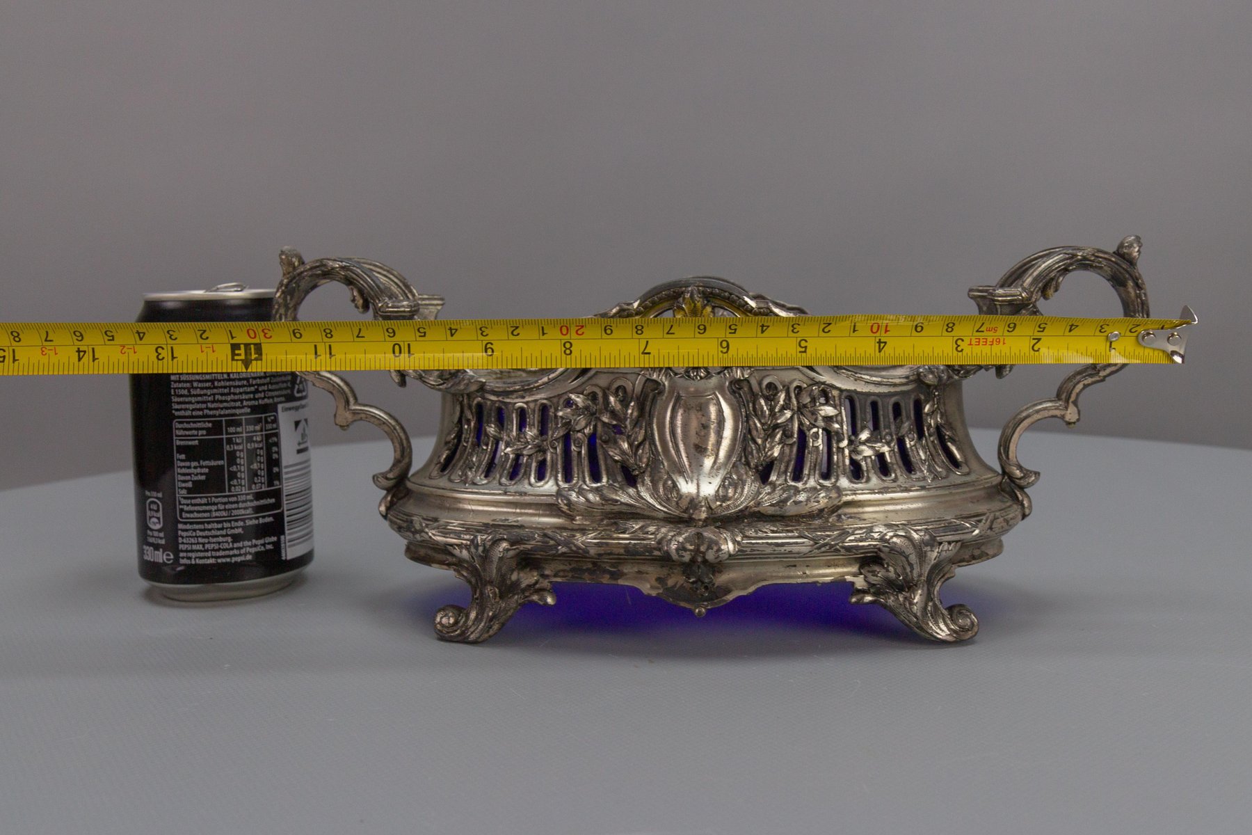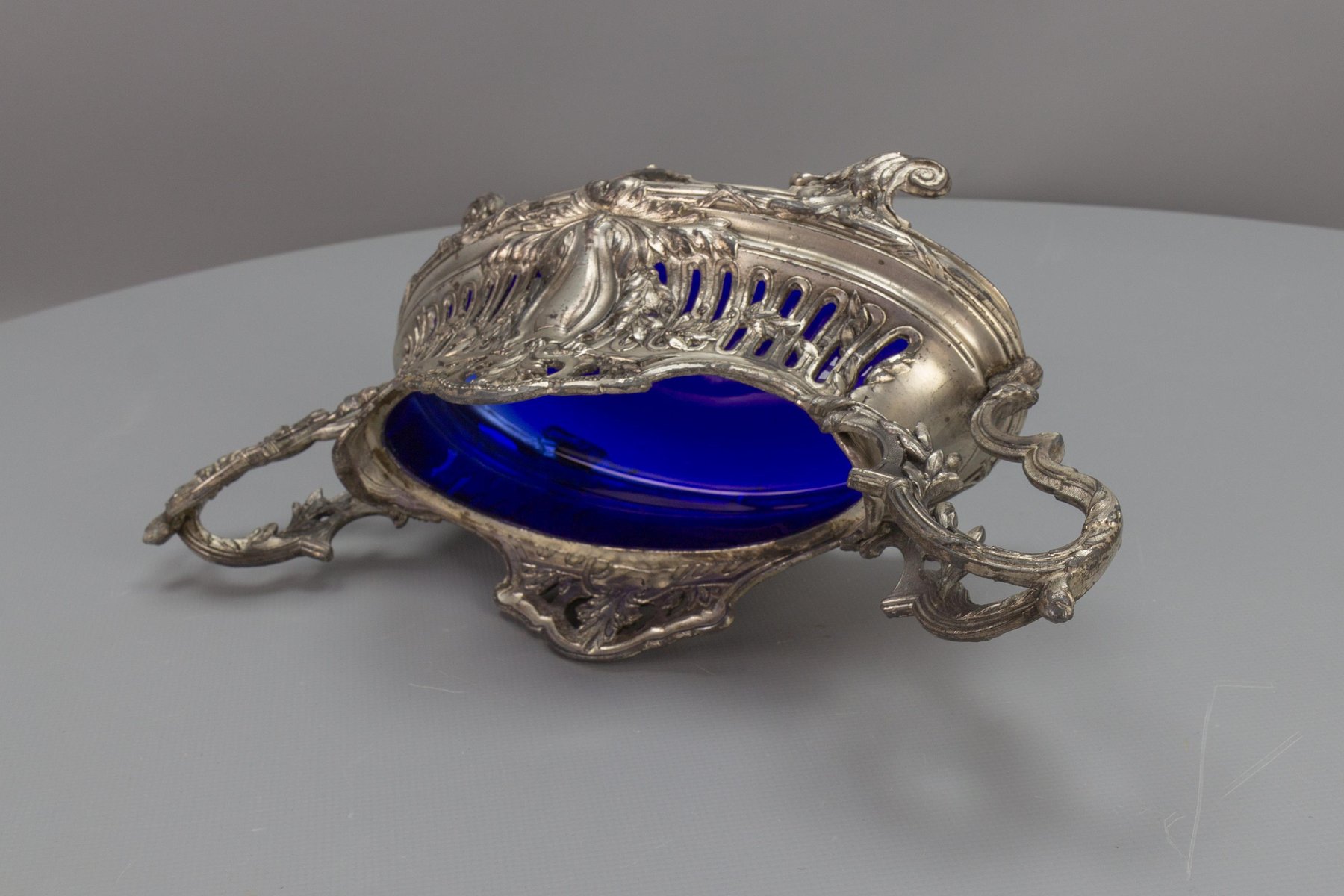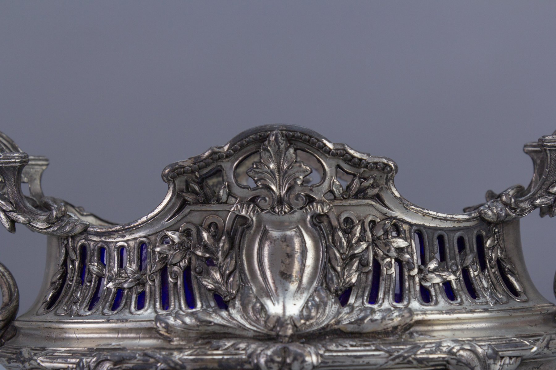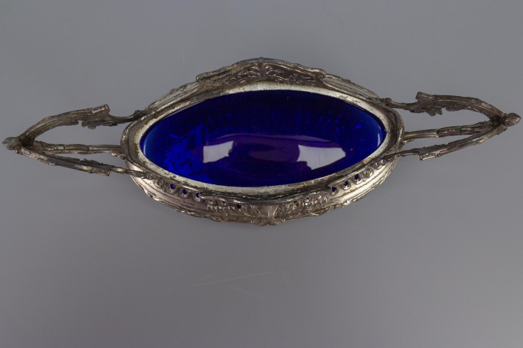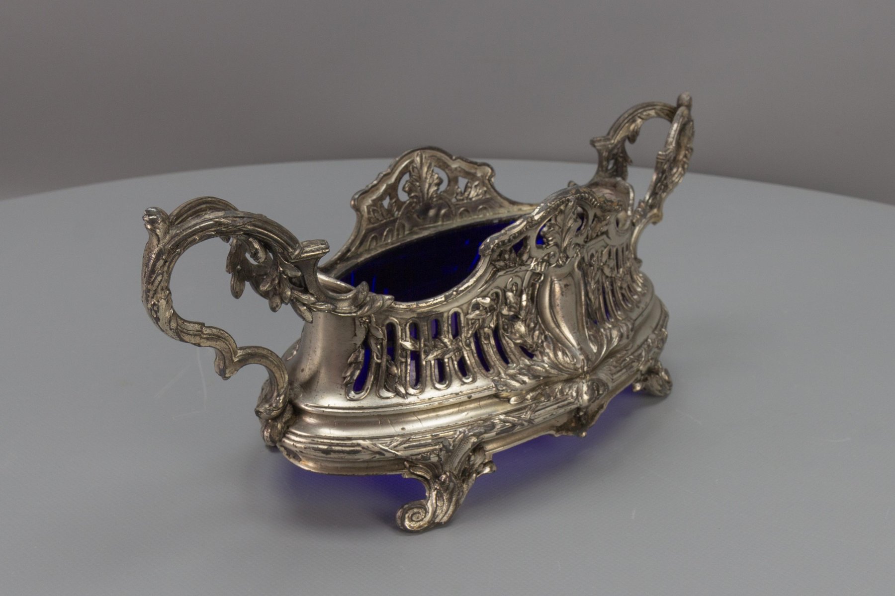 French Neoclassical Style Pewter and Indigo Blue Glass Centerpiece, Jardiniere, 1920s