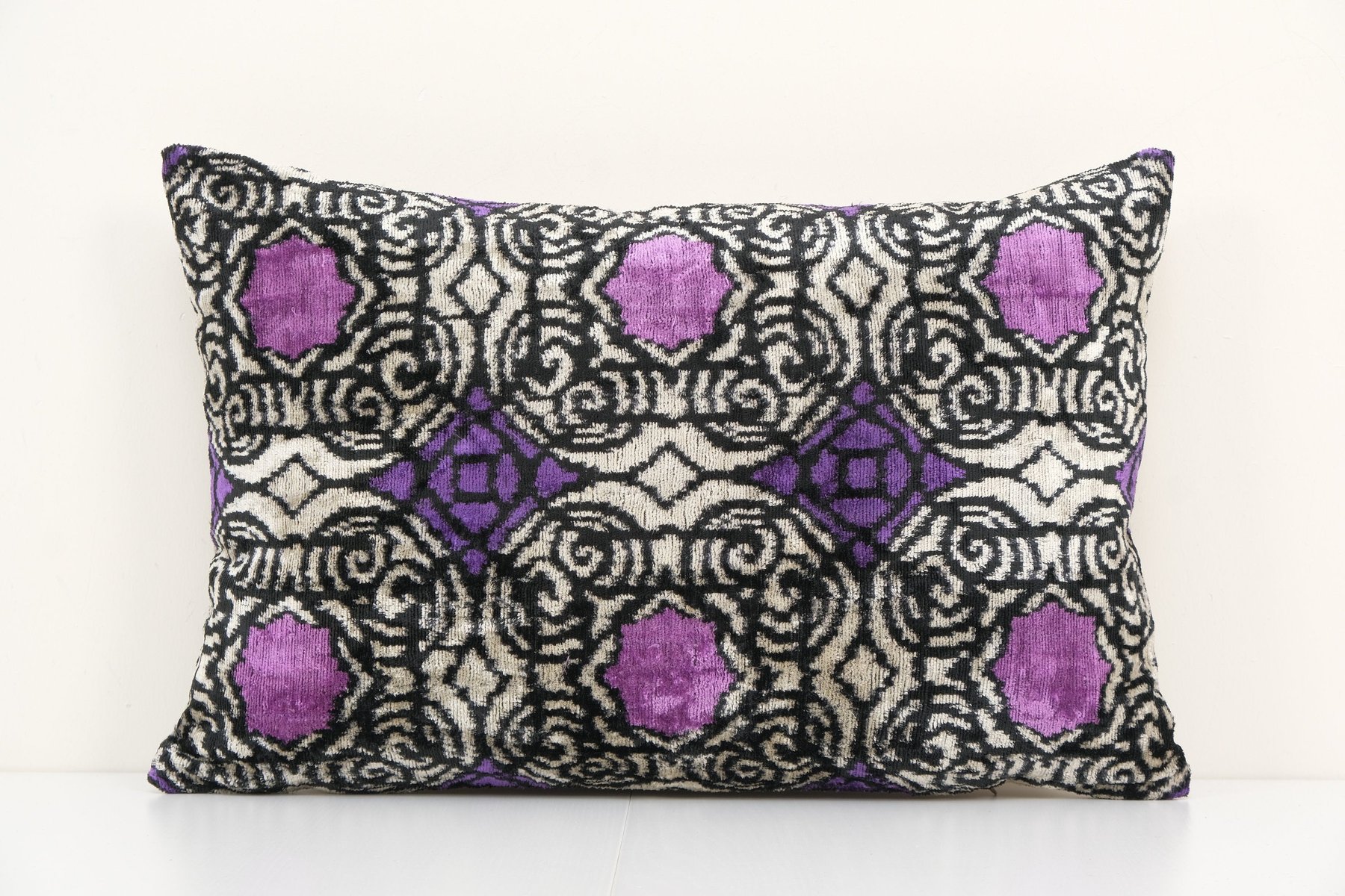 Geometric Blue & Pink Velvet & Silk Ikat Lumbar Cushion Cover