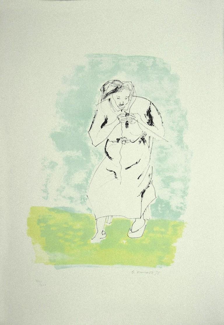 The Woman is an original lithograph realized by the Italian artist Giovanni Omiccioli (Rome, 1901-1975) in 1975. Hand-signed on the lower right. Edition XXIII/XXX In good conditions. The artwork represents a woman, depicted by strong expression through vivid and bright colors, in a harmonious manner, The artist's efforts indicate the perfect applying of aesthetic features. Giovanni Omiccioli was an Italian painter belonging to the modern movement of the Scuola romana with a dynamic paintwork representing soccer games and sports scenes. Having joined the Scuola Romana movement, in 1928, Omiccioli collaborated especially with Mario Mafai and Antonietta Raphael, as well as with Scipione and Raffaele Frumenti. His pictorial activity started in 1934 and a few years afterwards, he exhibited work at the IV Mostra del Sindacato Fascista (1937) within the Fine Art circle. In the same period he held his personal expo at Apollo Gallery in Rome. Omiccioli was also active in politics and, with Mario Mafai, Guttuso and Afro, he created the first header of the Italian communist newspaper L’Unità in 1945, immediately after the Italian Liberazione. During the same year he exhibited at the I Mostra dell’Arte against barbarism, promoted by this newspaper at the Gallery of Rome with catalogue by Antonello Trombadori, presenting a dramatic political painting by the title “La fucilazione di Bruno Buozzi”. After winning an award at the Marzotto Prize Convention, with “Il Pastore con la capretta”, Omiccioli exhibited at many important arts centres: especially noticeable are his anthologic displays at the Hermitage of Leningrad, his personal at the La Medusa Modern Gallery of Naples, and in the 1950s his participation in exhibitions at Pittsburgh, Boston, and Tokyo. He also took part in a travelling exhibition around the Scandinavian countries organised by the Italian Art Club, as well as displaying some paintings at the various Rome Quadriennale of 1955, 1959 e poi del 1966, and at the Venetian Biennale of 1952, 1954, 1956. In 1959 he also presented a religious painting on hardboard, Cristo crocifisso (Crucified Christ), at the VIII Biennale d’Arte Sacra in Bologna. During the 1960s, Omiccioli exhibits at three Figurative Arts Reviews in Rome and Lazio (1961, 1963, 1965) and at the VI Biennale of Rome in 1968.[3] Vaporous and tender, and yet always springing from an unchangeably intense love for nature and man, his palette of colours give a soft breath of light and a suggestive atmosphere to his whole artistic production.