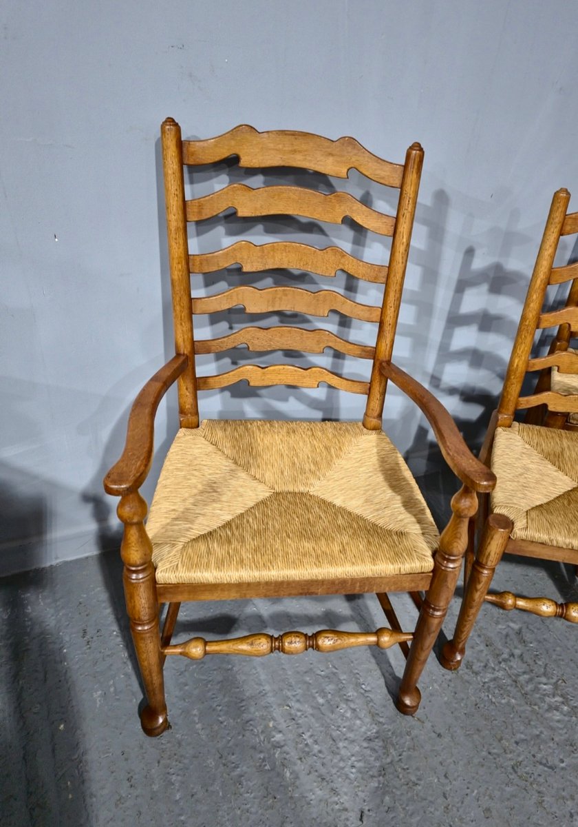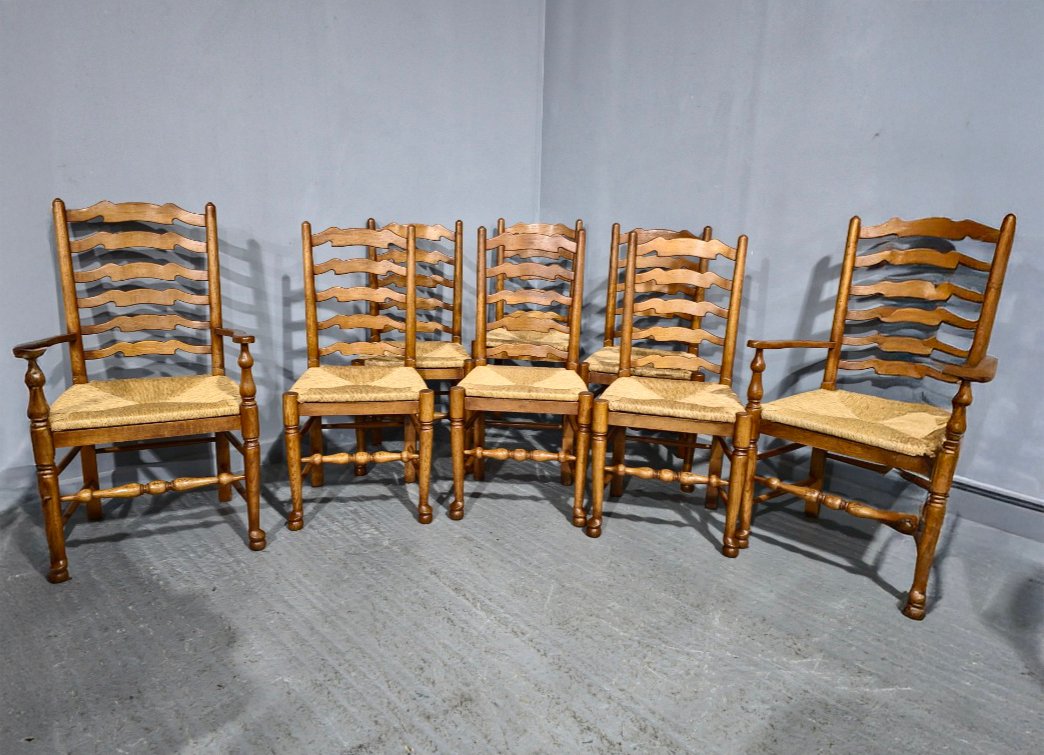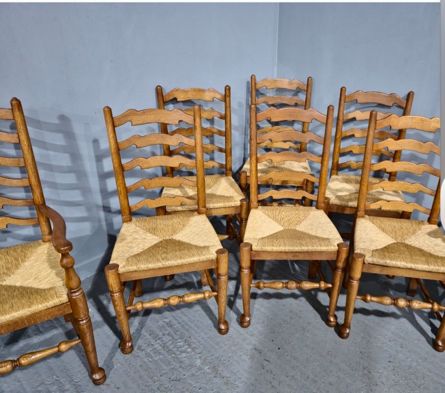 Golden Oak Ladder Back Dining Chairs, 1920, Set of 8