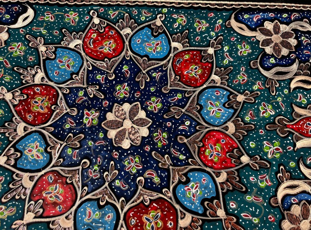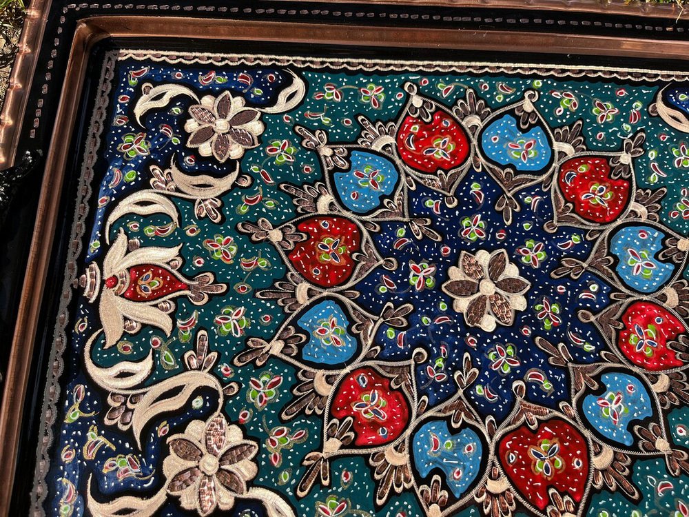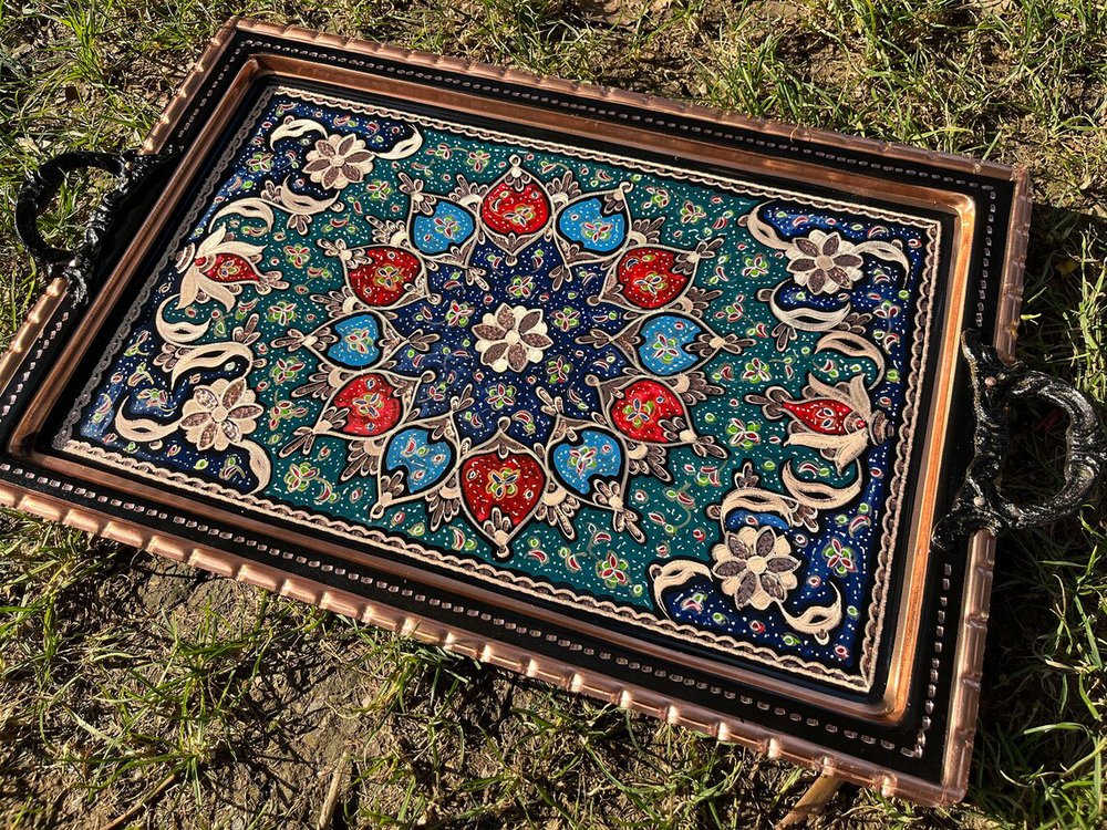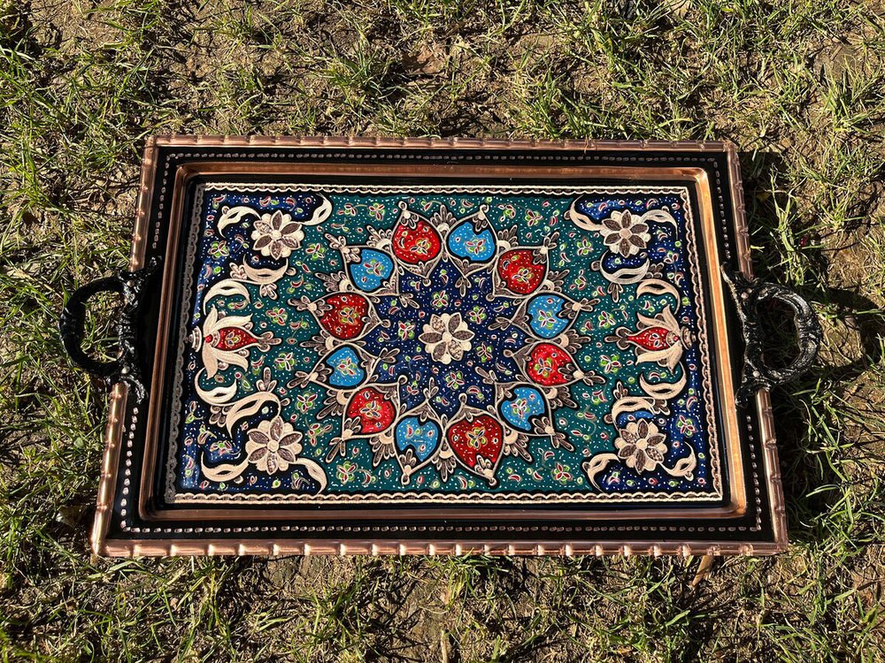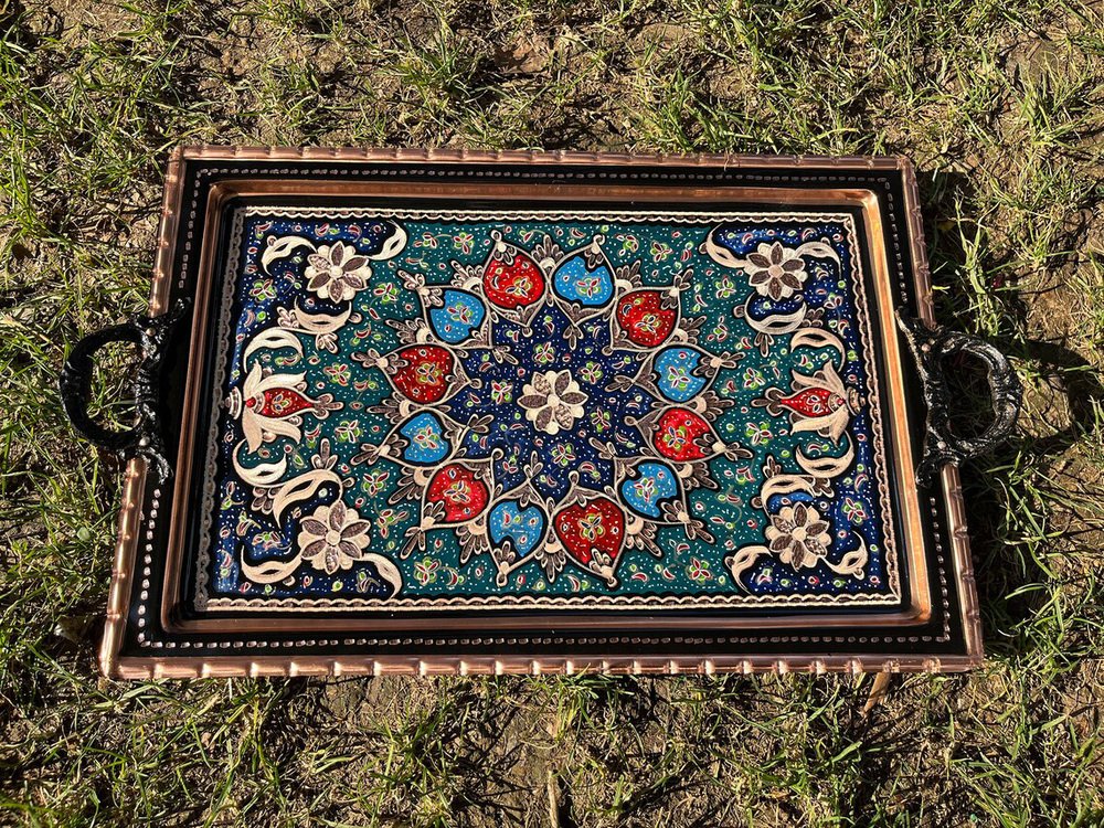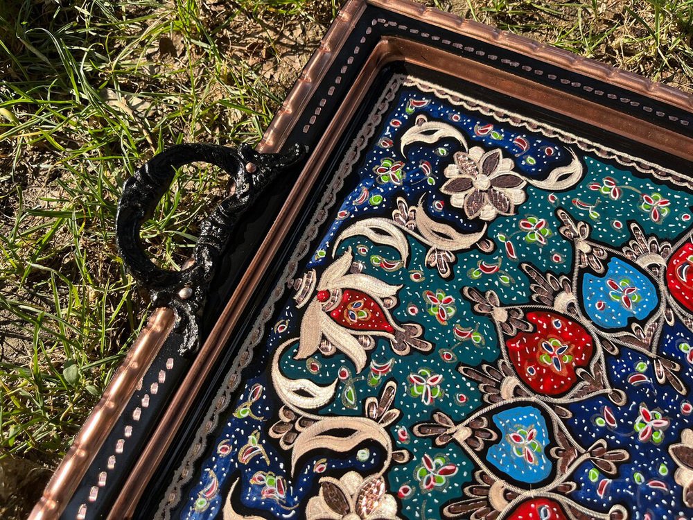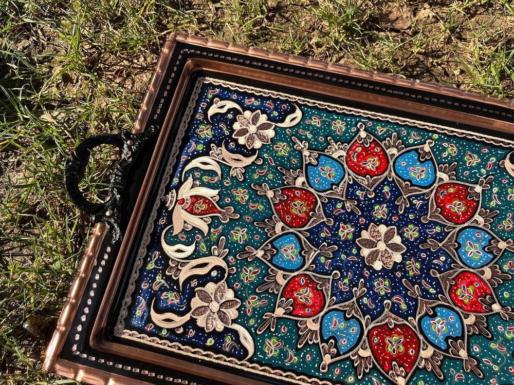 Hand Made Colorful Floral Boho Carved Copper Tray with Handles