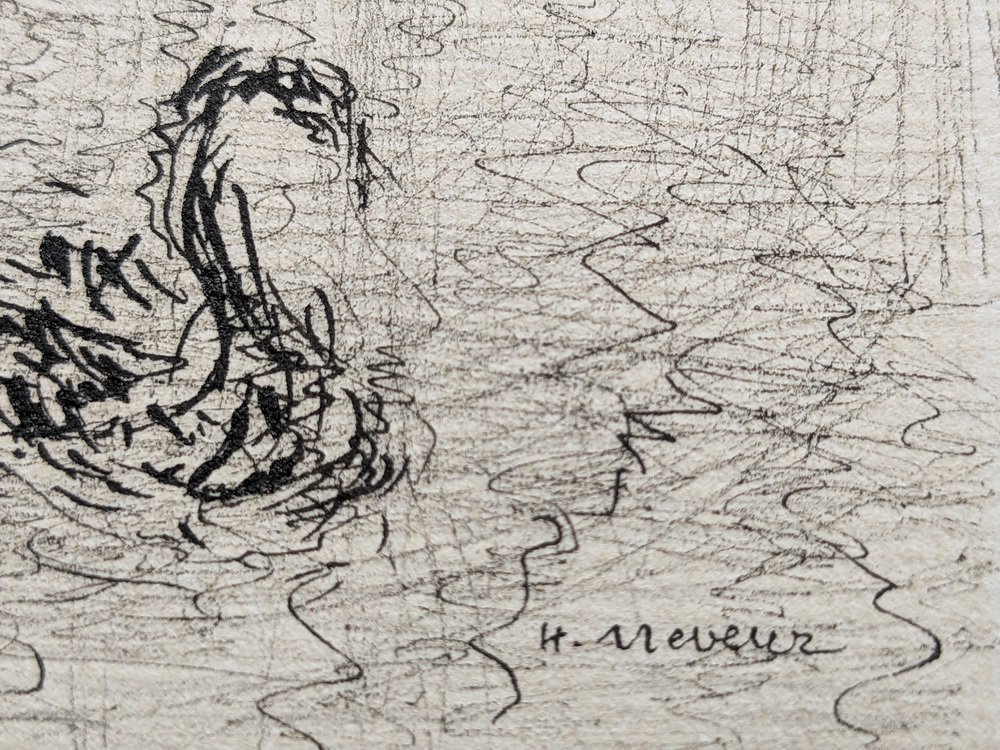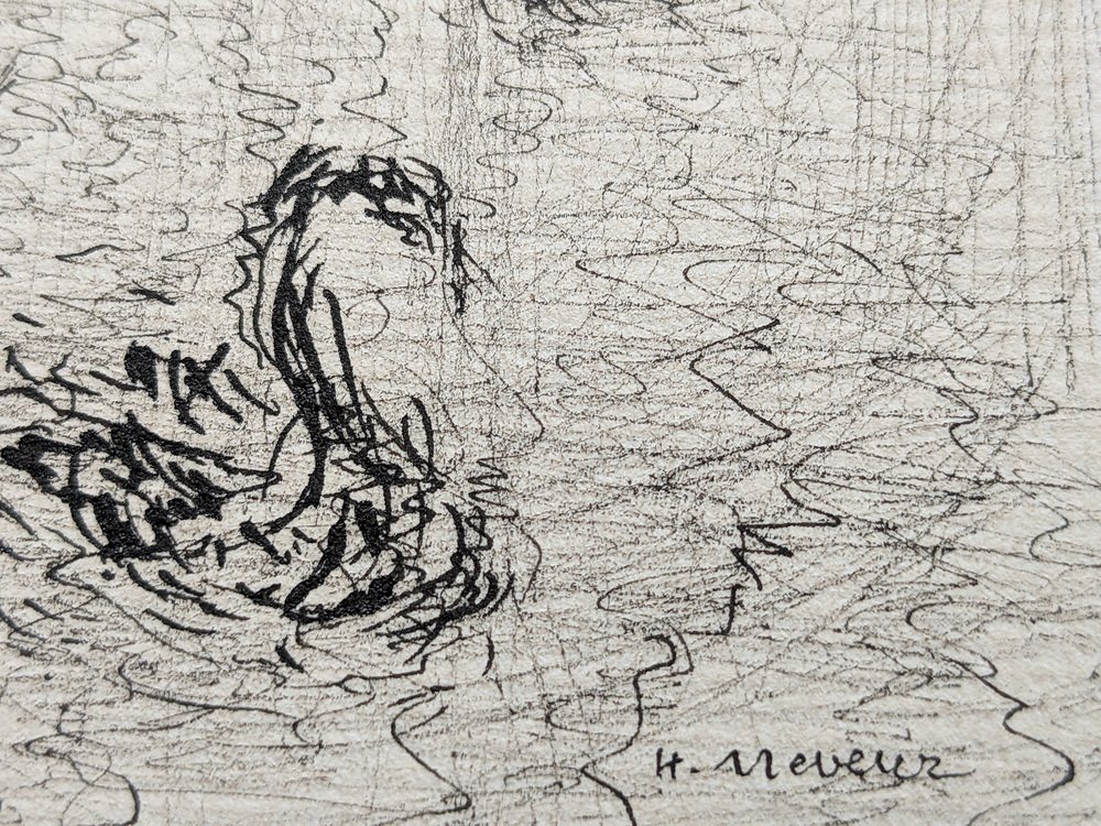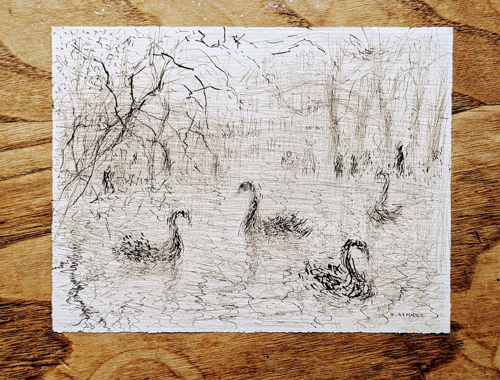 Helène Neveur, Swans on Lake, Original Hand-Signed Drawing in China Ink, Mid-20th Century