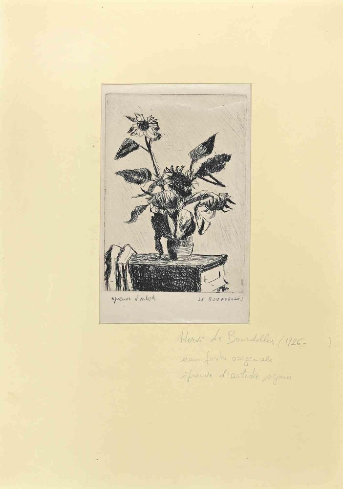 Hervé Le Bourdelles, Flowerpot, Original Etching, 1960s