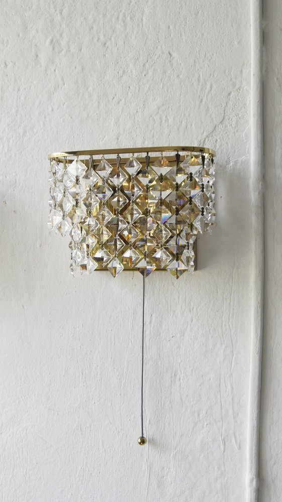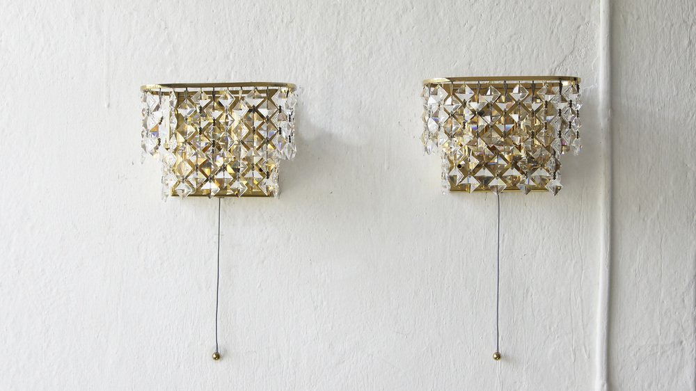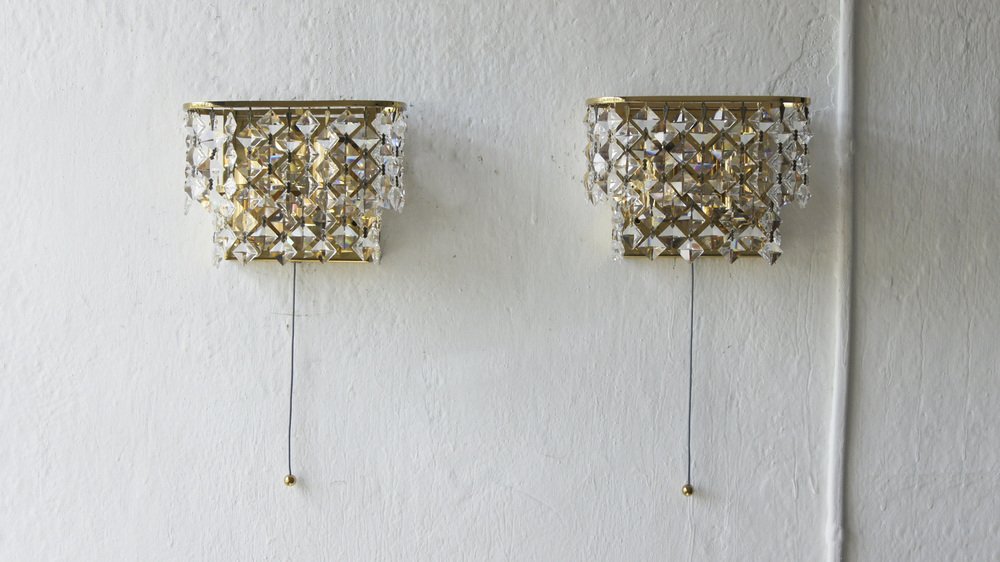 Hollywood Regency Brass and Crystal Glass Wall Lamps from Palwa, Set of 2