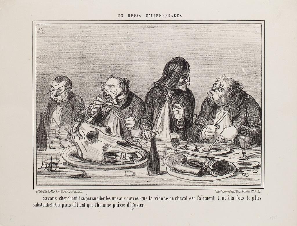 Un Repas D’hippophaes is the title of this b/w lithographed plate, realized by Honoré Daumier (France, 1808-1879), that appeared on February 20th, 1856 in the French periodical, Le Charivari. Published by the Maison Martinet, Paris and lithographed by Destouches. Reference: H. Delteil, Catalogue Raisonnée, 2776. This is a very rare and precious specimen, Second State/III, before the changes in the letter. Provenance: Ex. Coll. G. Cognac Inscriptions: Monogrammed on stone, h.D, 883. Complete Caption: Savans cherchant à persuader les uns auxautres que la viande de cheval est l’aliment tout à la fois le plus substantiel et le plus délicat que l’homme puisse déguster. Excellent condition, with imperceptible aging signs. On the back, two stamps “H.M.P” and “GC” of the previous collection. Background: The Veterinary Institute at Alfort, a suburb of Paris, supported the thesis of the consumption of horsemeat. The horsemeat was served at the official receptions organized for this reason. During the Fifties of XIX century, fashionable restaurants between Toulouse and the French capital, served the horsemeat as a delicacy. After the demonstration of this scientific thesis and after this new fine “palate training”, butcheries specialized in horsemeat opened up in France. Les hippophaes was the satirical series, composed of 10 plates of caricatures “de mœurs” (of behaviours), realized by Honoré Daumier (France, 1808-1879) and published by the Maison Martinet, on Le Charivari between 1856-58. Honoré-Victorin Daumier (Marseille,1808 – Valmondois, 1879) The French painter, sculptor, and printmaker, through his artworks, Honoré Daumier, offers us commentary on the social and political life in France, from the Revolution of 1830 to the fall of the second Napoleonic Empire in 1870. Caricatures and cartoons of political figures, satirizing the behavior of his countrymen in newspapers and periodicals was his main activity, for which he became popular in his lifetime and is remembered and appreciate still today. He was a republican democrat whose targets were the bourgeoisie, the church, lawyers and the judiciary, politicians, and the monarchy. His talented and satiric pencil had a very high cost on his life: he was jailed for several months in 1832 after the publication of Gargantua because of a offensive depiction of King Louis-Philippe. Charles Baudelaire noticed the Daumier's production and greatly admired his paintings, which were to have an influence on a younger generation of impressionist and post-impressionist painters. Later generations have come to recognize Daumier as one of the great French artists of the 19th century. Daumier was prolific artist that produced more than 100 sculptures, 500 paintings, 1000 drawings, 1000 wood engravings, and 4000 lithographs.
