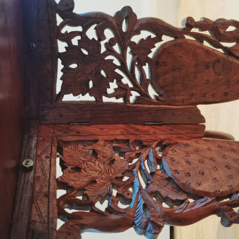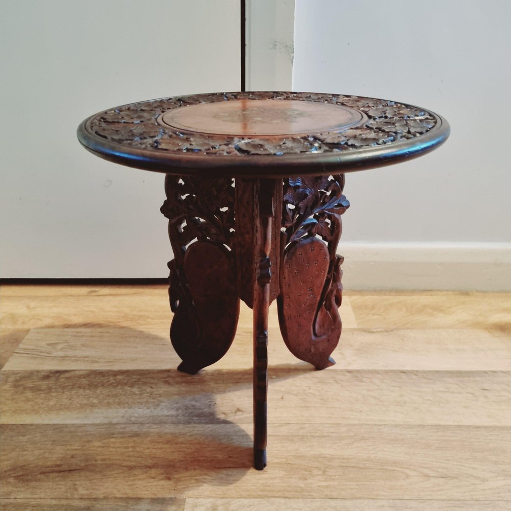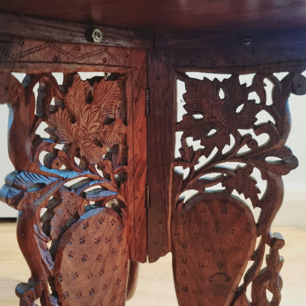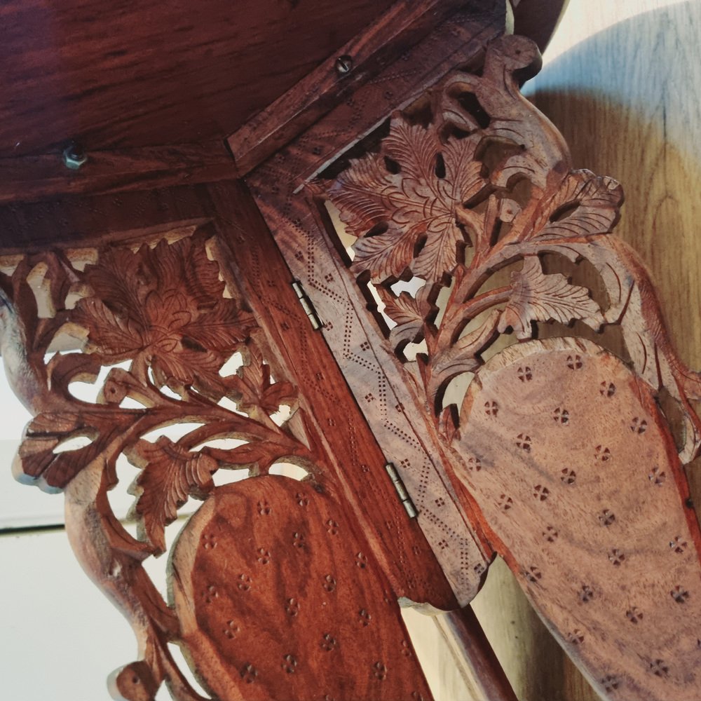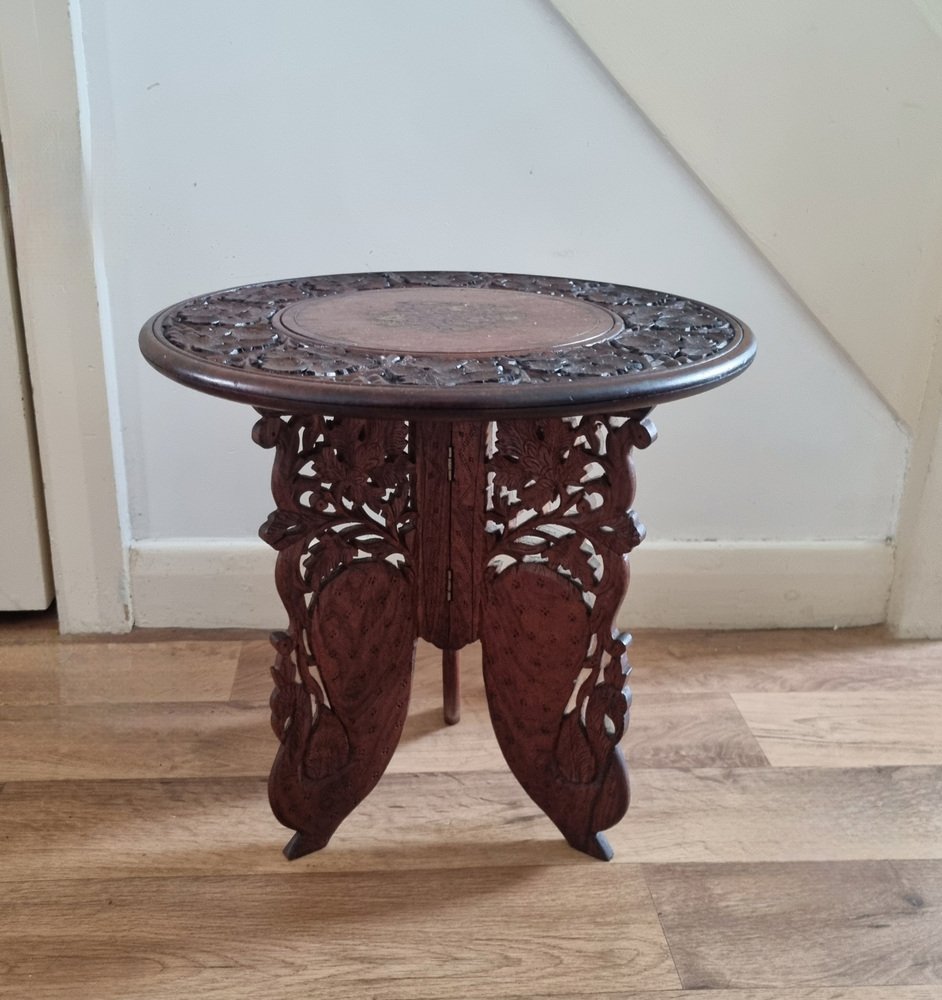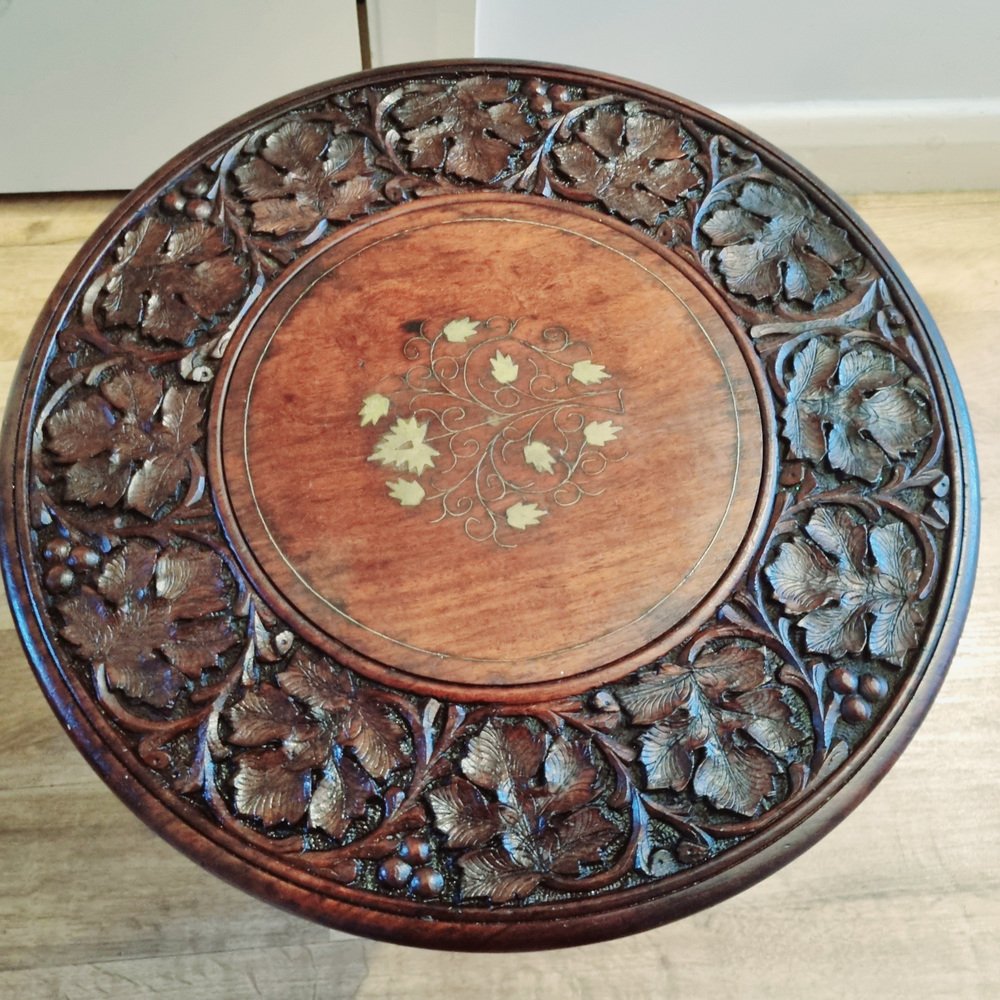Indian Handcarved Wooden Side Table with Inlaid Brass Detail