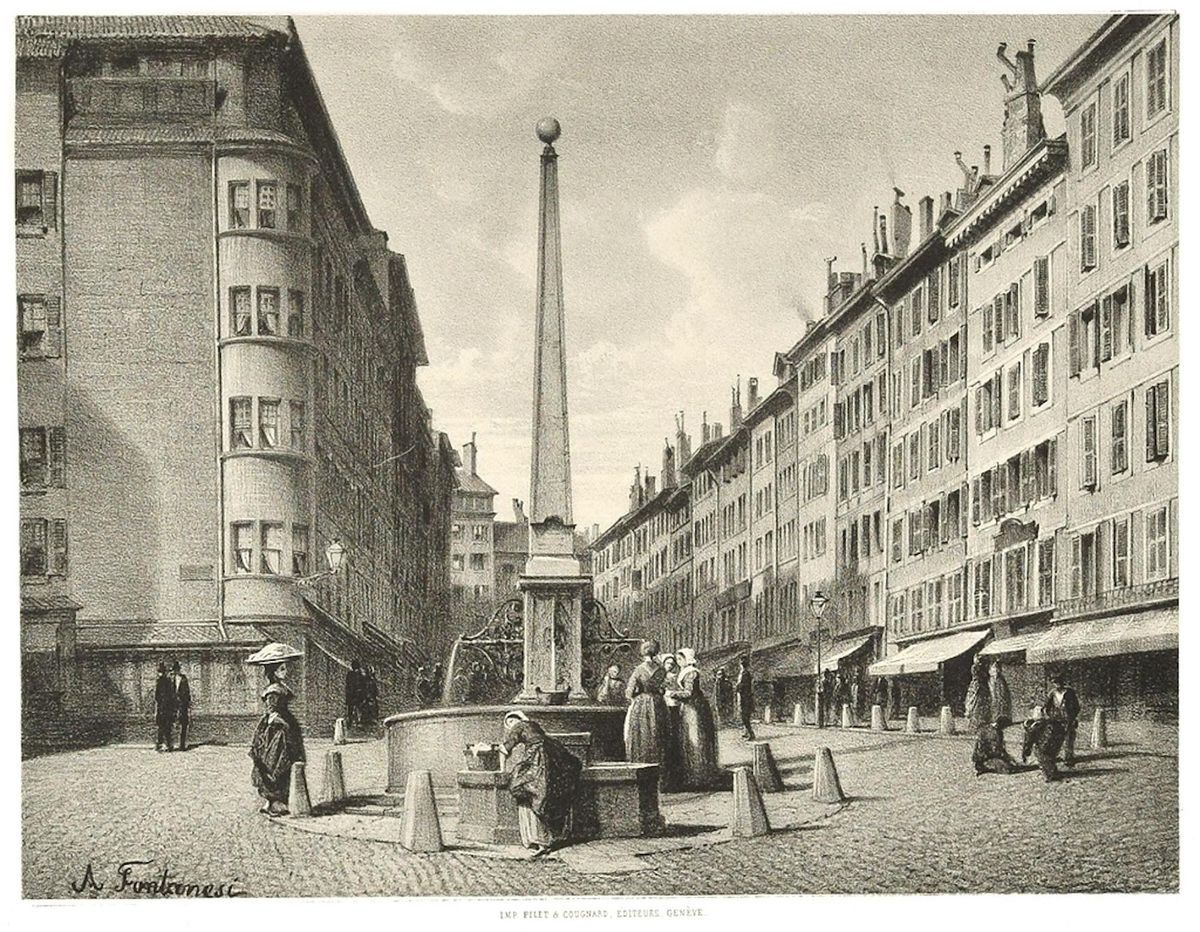 Image dimensions: 15.7 x 20.6 cm. This splendid lithograph Interieur de Geneve. Fontaine et Rue de Coutance is part of the series of 20 prints dedicated to views of the city of Geneva, engraved by the Italian artist Antonio Fontanesi in 1854. The lithograph is applied on a cardboard. The state of preservation of the artwork is excellent, except for a tiny fold of the paper on the right of the image. The signature is engraved on stone on the lower left. At the top of the paper, the inscription “Interieur de Geneve”, whilst at the bottom, right below the image, the inscription “JMP Pilet & Cougnard Editeurs Geneve”. Below, the writing “Fontaine et Rue de Coutance” is printed. Antonio Fontanesi (Reggio Emilia, 1818 - Turin, 1882) was an Italian painter, engraver, teacher, and soldier. He was one of the most important 19th-century Italian painters, though somewhat unknown. After fighting in the I Independence War, he moved to Geneva, where he met local painters that encouraged him to paint landscapes and to open to European artistic novelties. In Paris, he met Corot and Barbizon painters, whilst in London he was influenced by Turner’s and Constable’s works. He taught in Lucca, Turin, and then in Tokyo. His artworks are very suggestive, rich in lyricism and in melancholic, Romantic and, according to some scholars, Pre-Symbolist atmospheres. Fontanesi observed and studied natural reality to reach a deeper and more universal motive and to find, reflected, human feelings: for this reason, he is considered one of the most emblematic Italian Romantic painters of the European Romantic movement. He was also a fine draftsman and expert etcher: his etchings and lithographs, like in this case, are characterized by the same research on atmospheric values as in painting, with synthetic and essential light effects. This is a beautiful artwork, an excellent engraving, depicting a Romantic view on a peculiar place in Geneva. This artwork is shipped from Italy. Under existing legislation, any artwork in Italy created over 70 years ago by an artist who has died requires a licence for export regardless of the work’s market price. The shipping may require additional handling days to require the licence according to the final destination of the artwork.