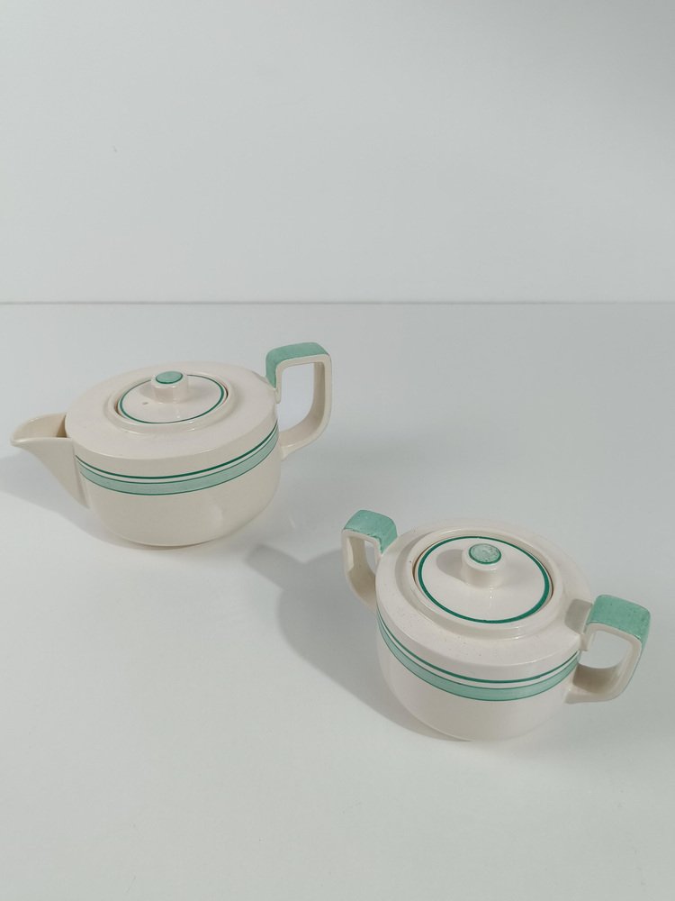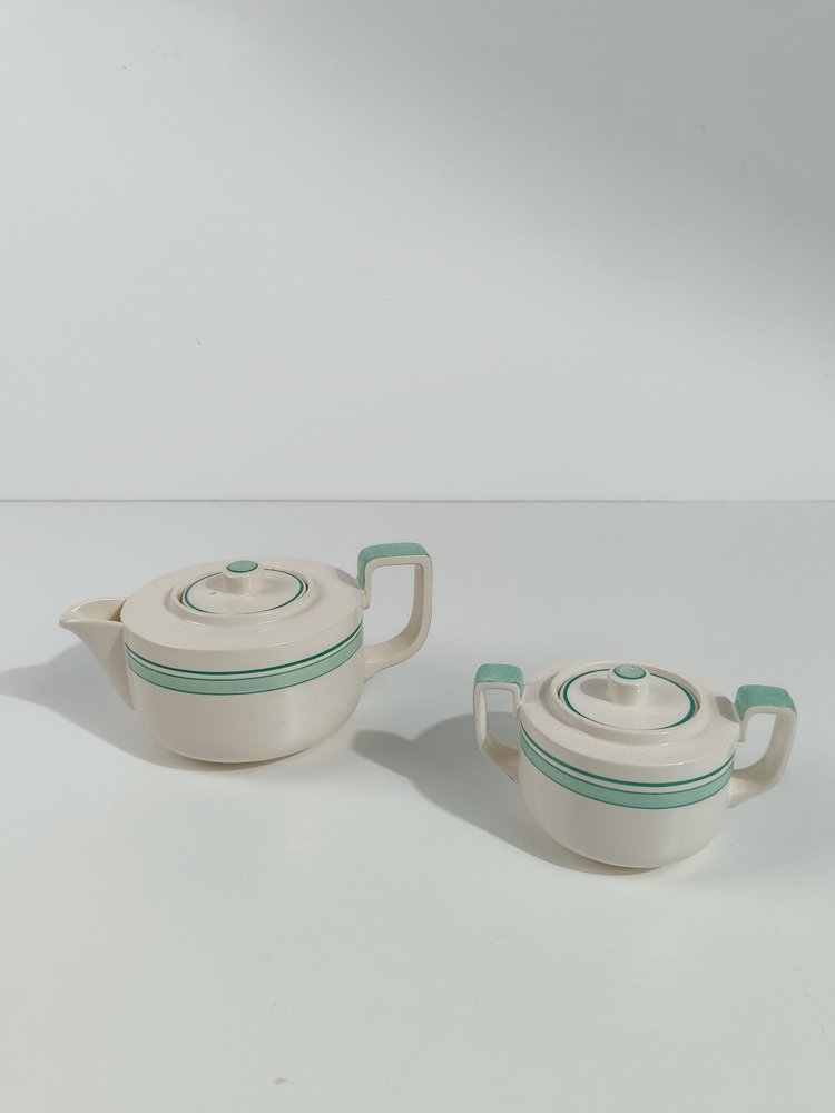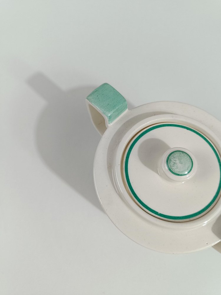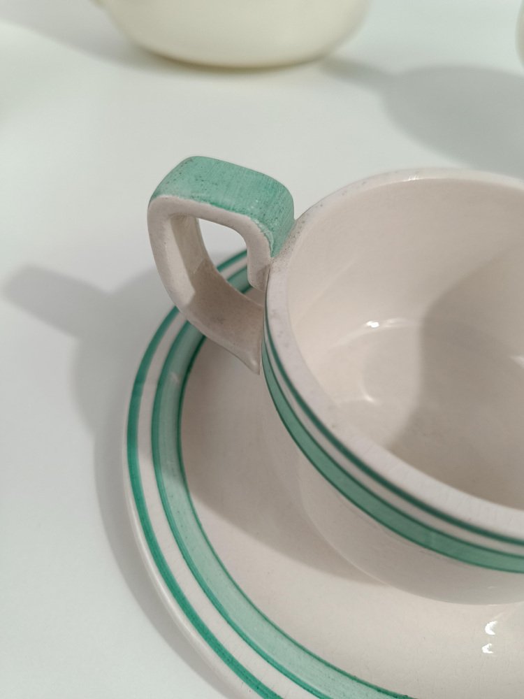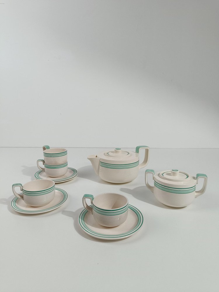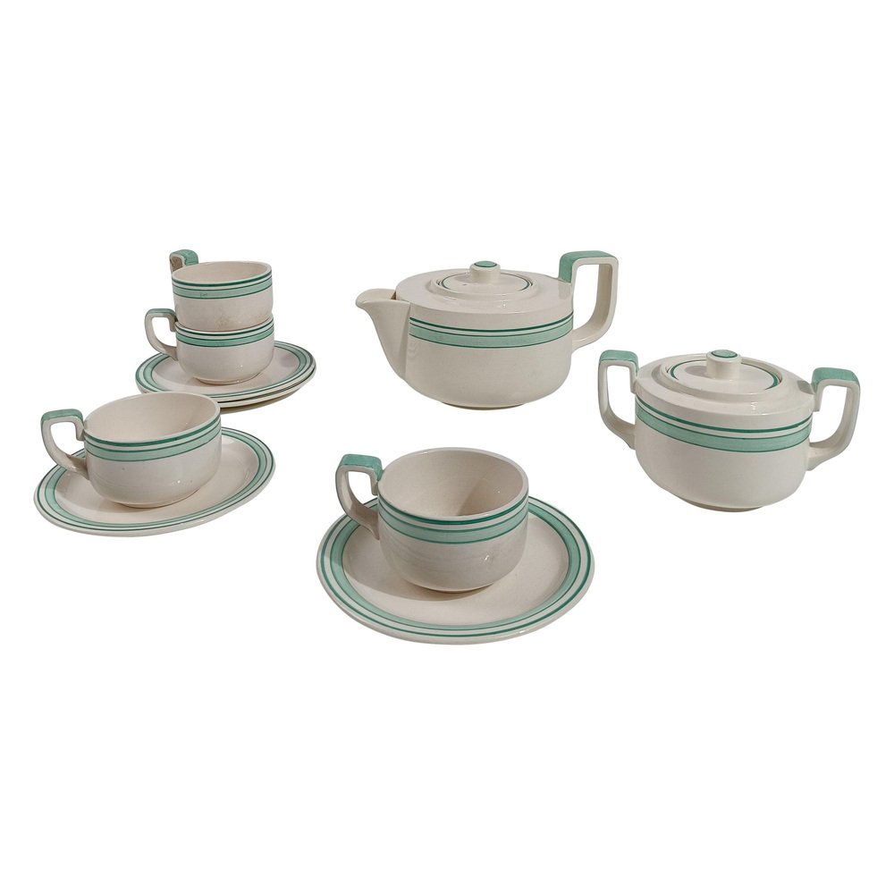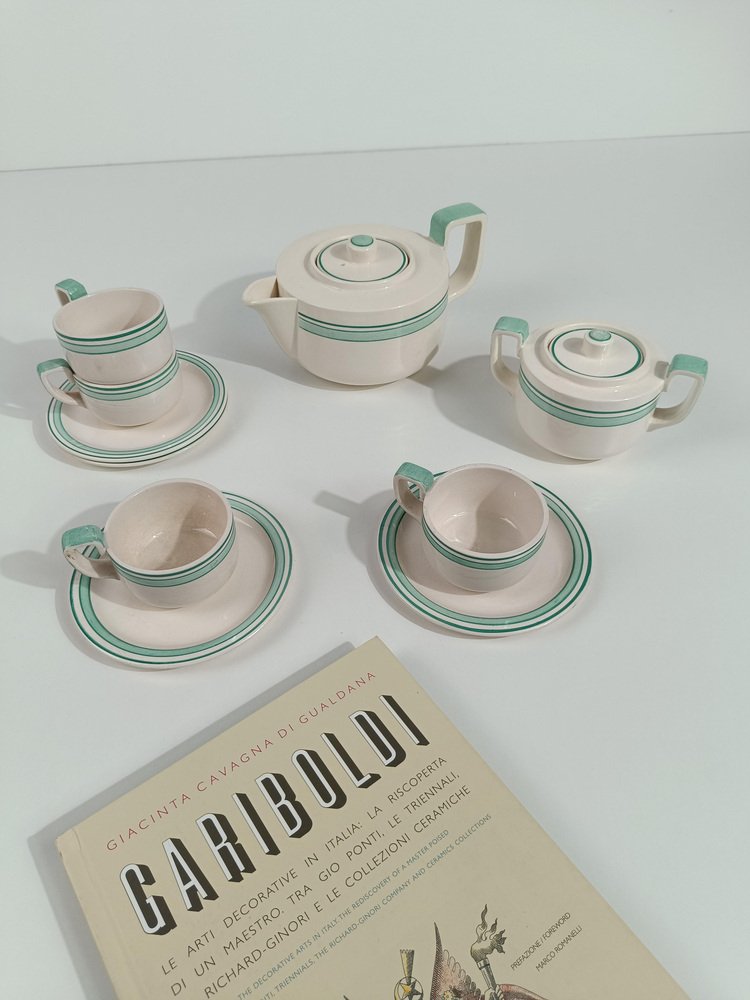 Italian Art Deco Tea Set attributed to Richard Ginori in White and Tiffany Green Majolica, 1930s, Set of 10