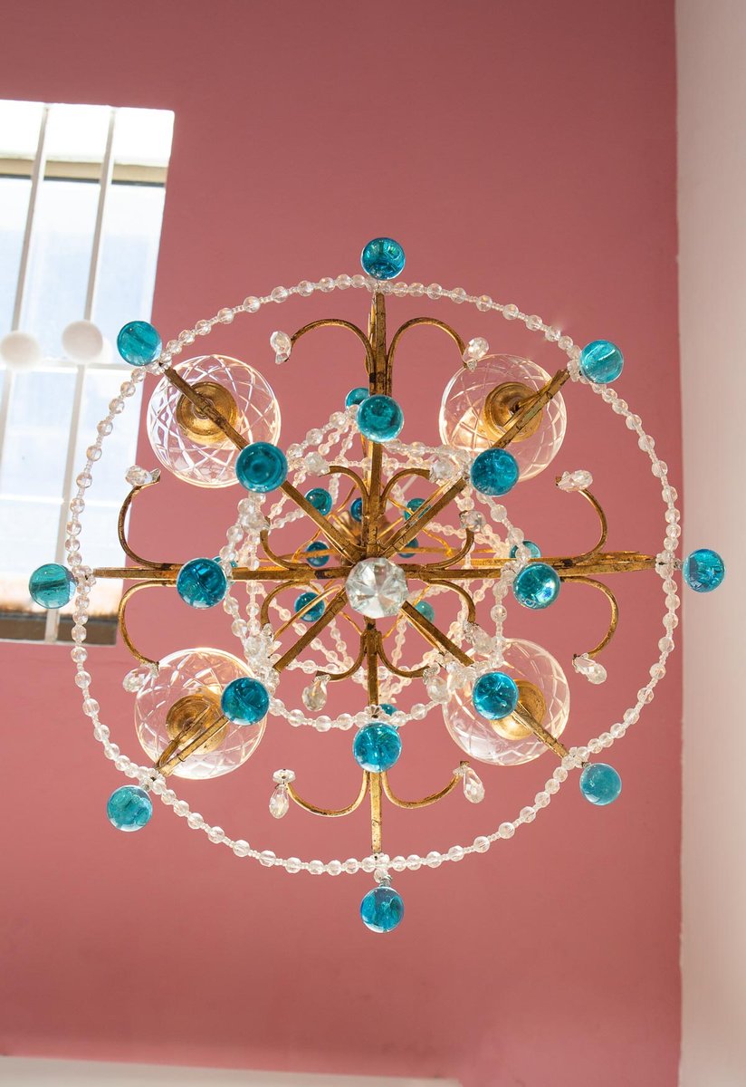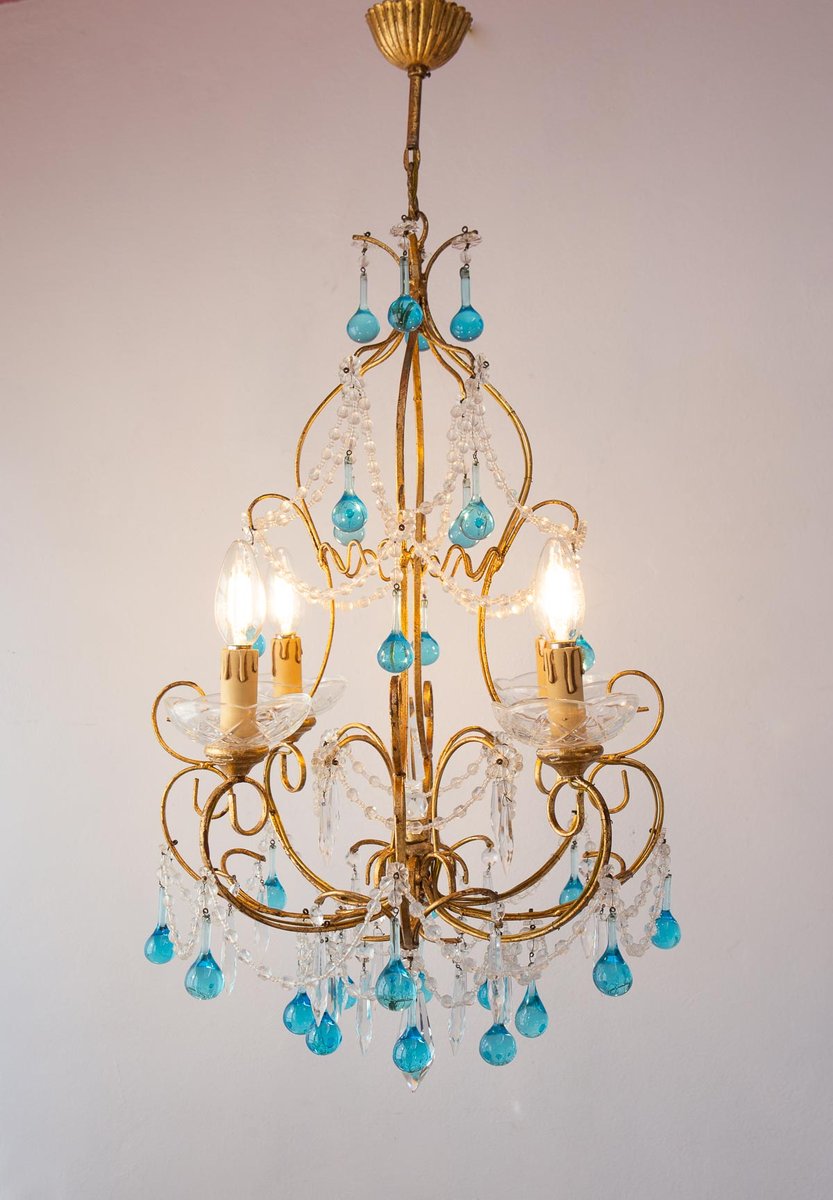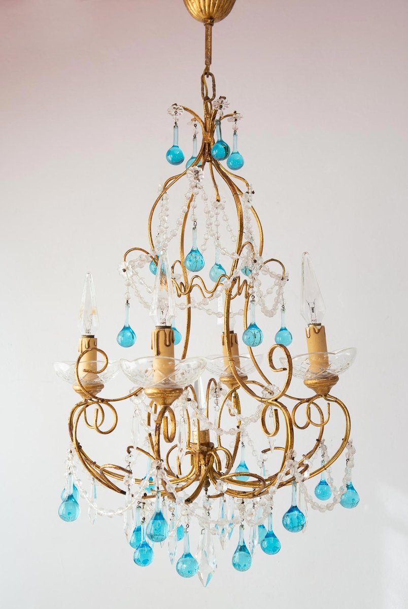 Italian Chandelier with Blue Glass Droplets, 1960s