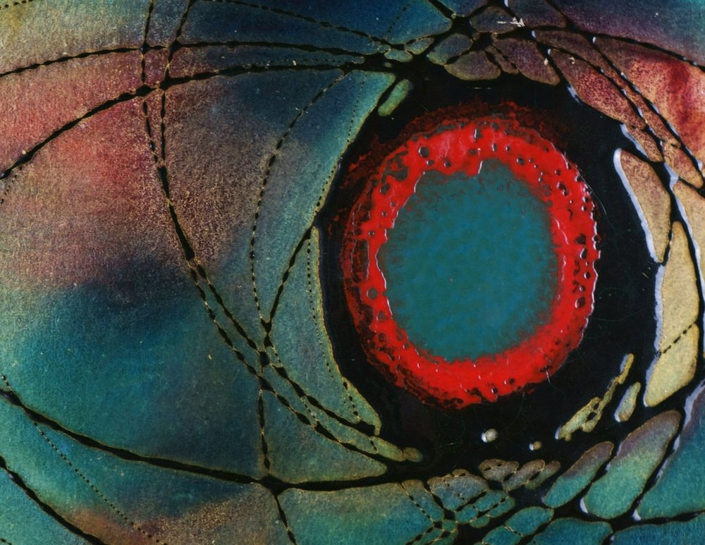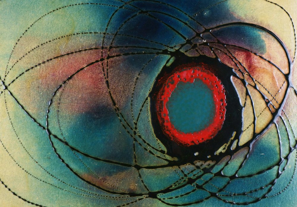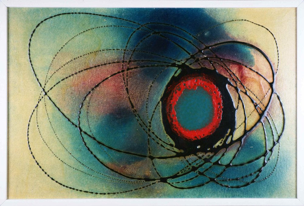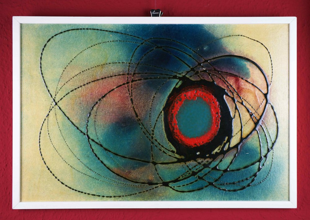 Das verwendete Kunstharz erzeugt eine glänzende Oberfläche, die das Motiv förmlich in sich selbst versiegelt. Dadurch wirkt es nicht wie von Künstlerhand verfertigt, sondern als etwas Autonomes, das durch ein gleichsam wissenschaftliches Verfahren fixiert worden wäre. Zur Eigenständigkeitswirkung trägt auch der sich in der Motivik niederschlagende Fluss des Kunstharzes bei: Die energetischen Entladungen haben in den Fließbewegungen des Materials ihre adäquate sichtbare Form gefunden. Wir scheinen einem Geschehen der atomaren oder subatomaren Welt beizuwohnen, das in dem Form- und Farbereignis präsent wird. Damit ist die vor Augen stehende abstrakte Kunst keineswegs rein abstrakt, sondern gegenständlich konnotiert und ein rares malerisches Beispiel für die Epoche des Space Age.