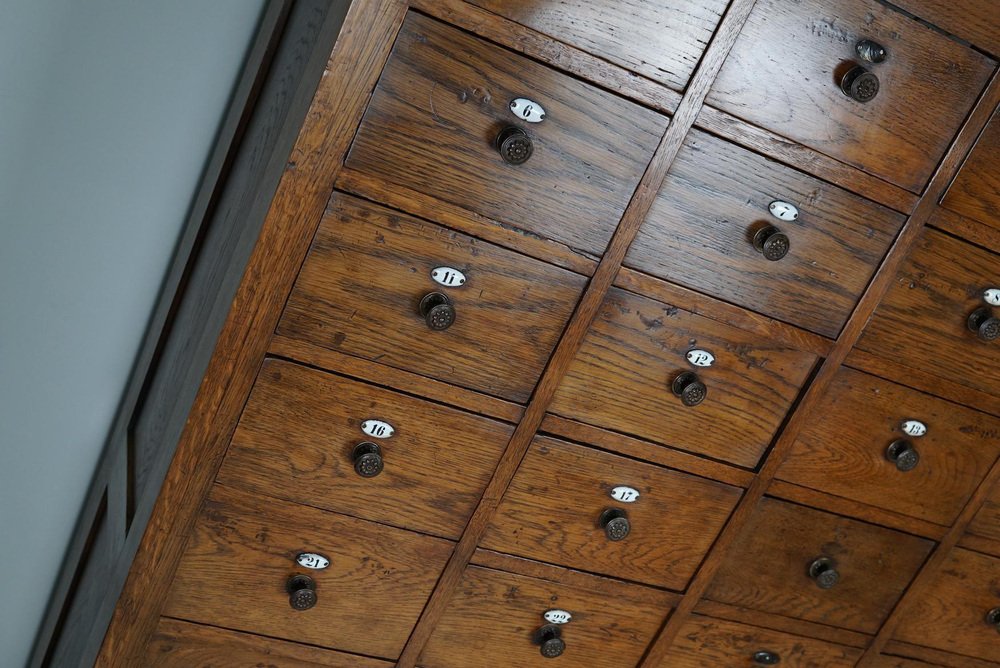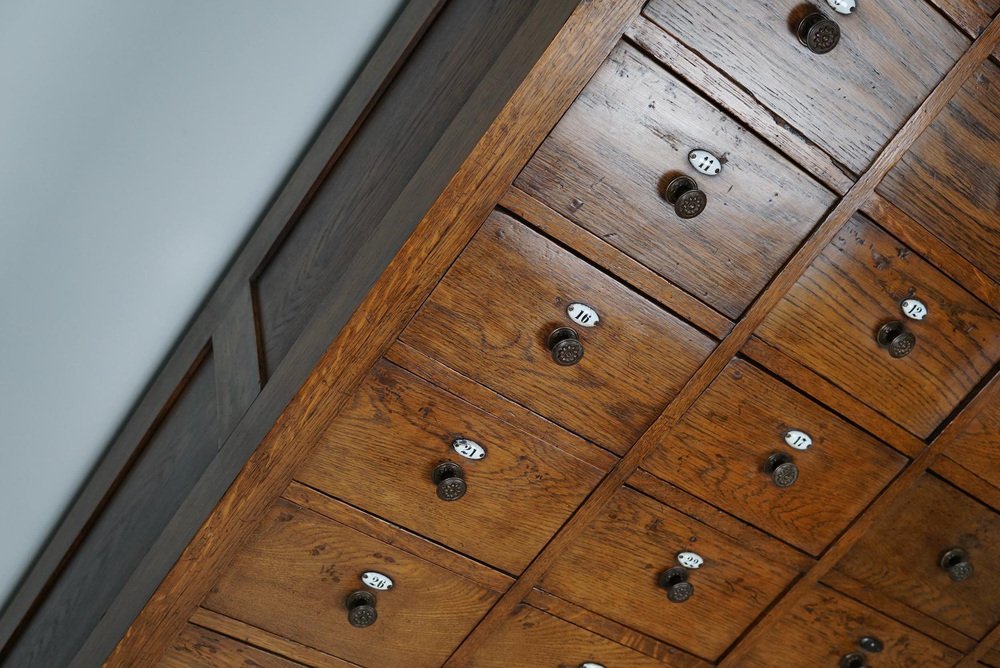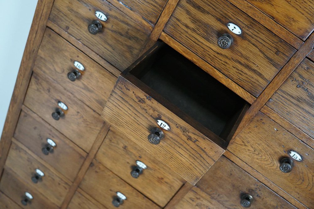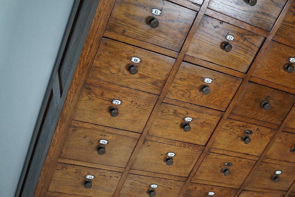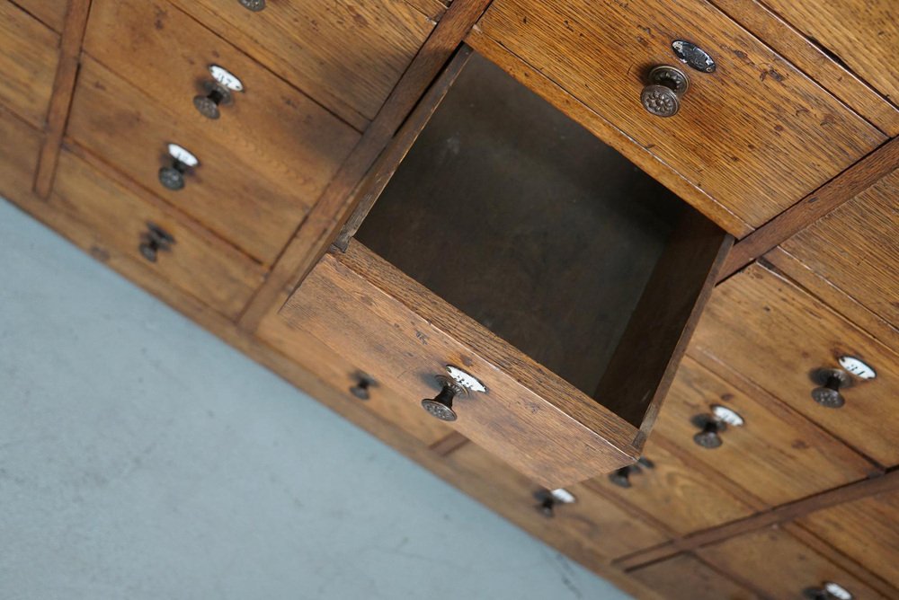 Large Dutch Oak Apothecary Cabinet with Enamel Shields, 1900s