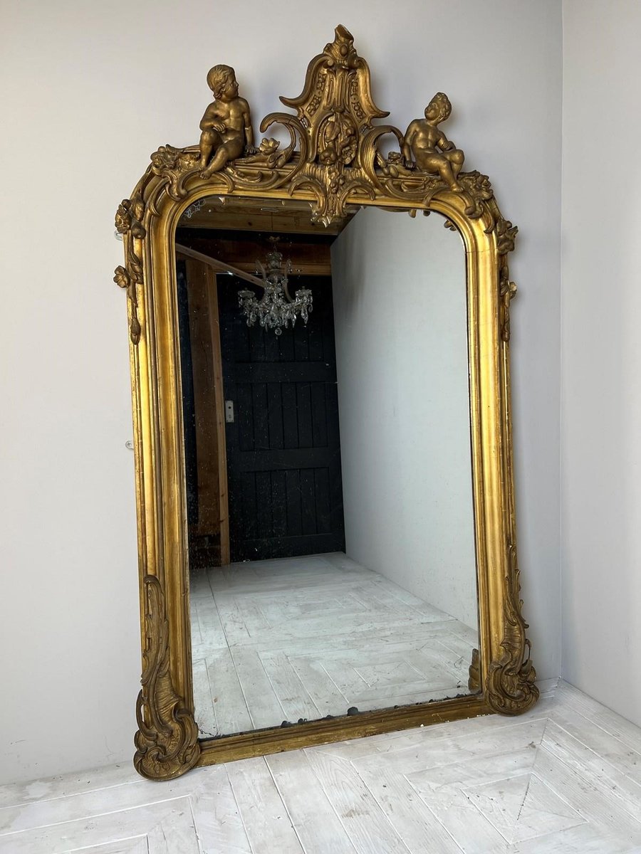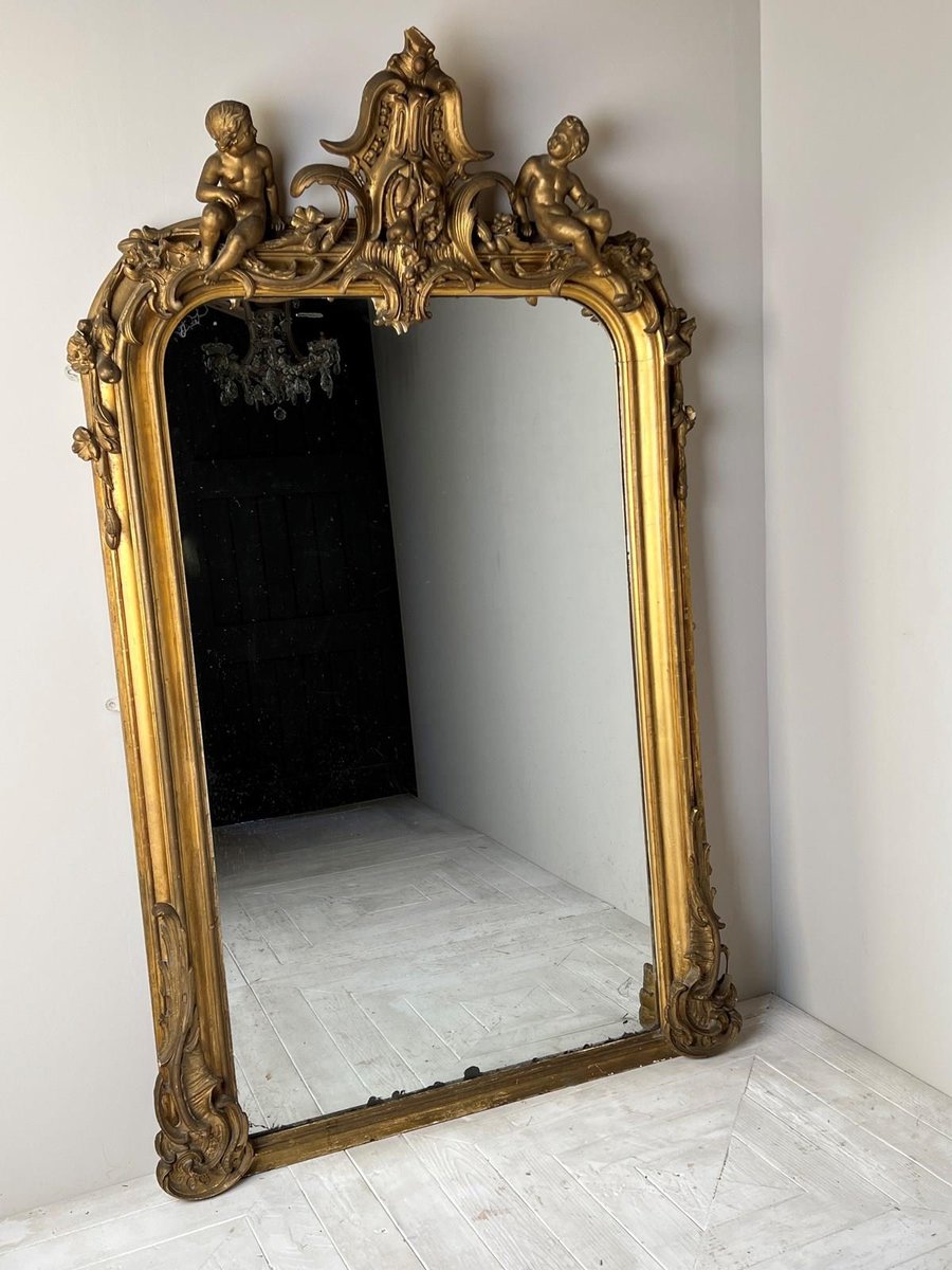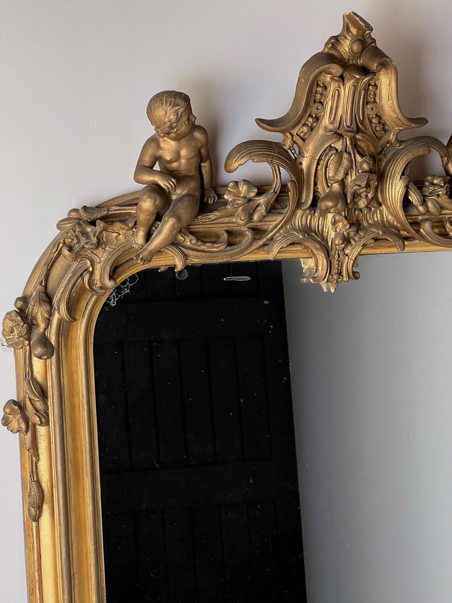 Large Six Foot Giltwood and Gesso Putti Mirror, 19th Century