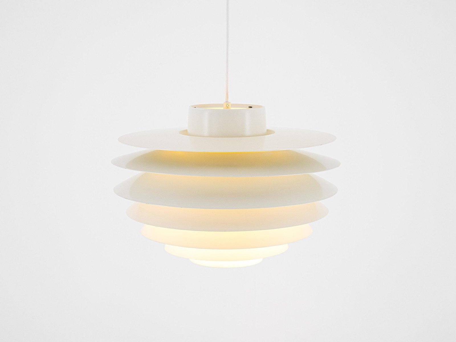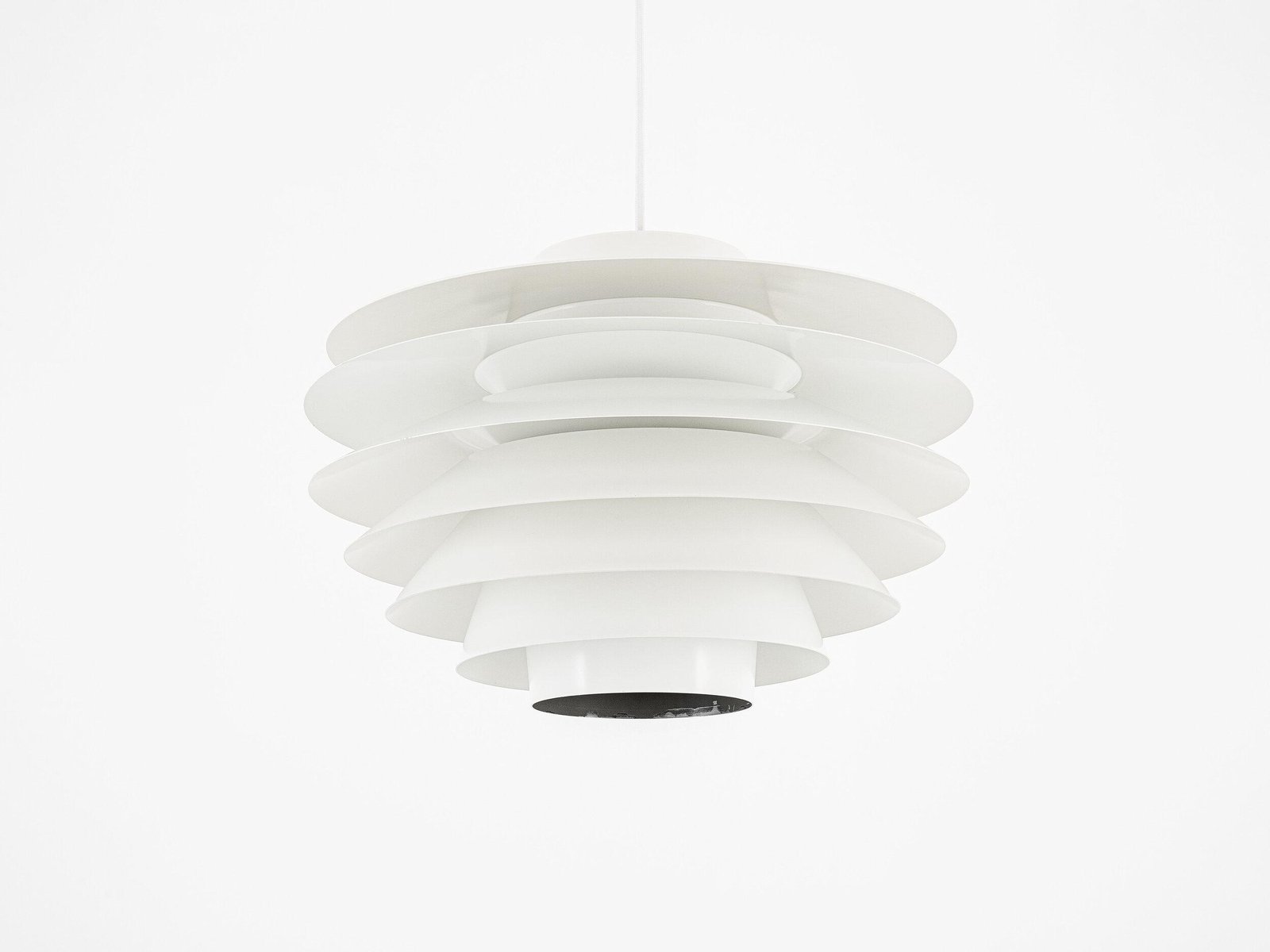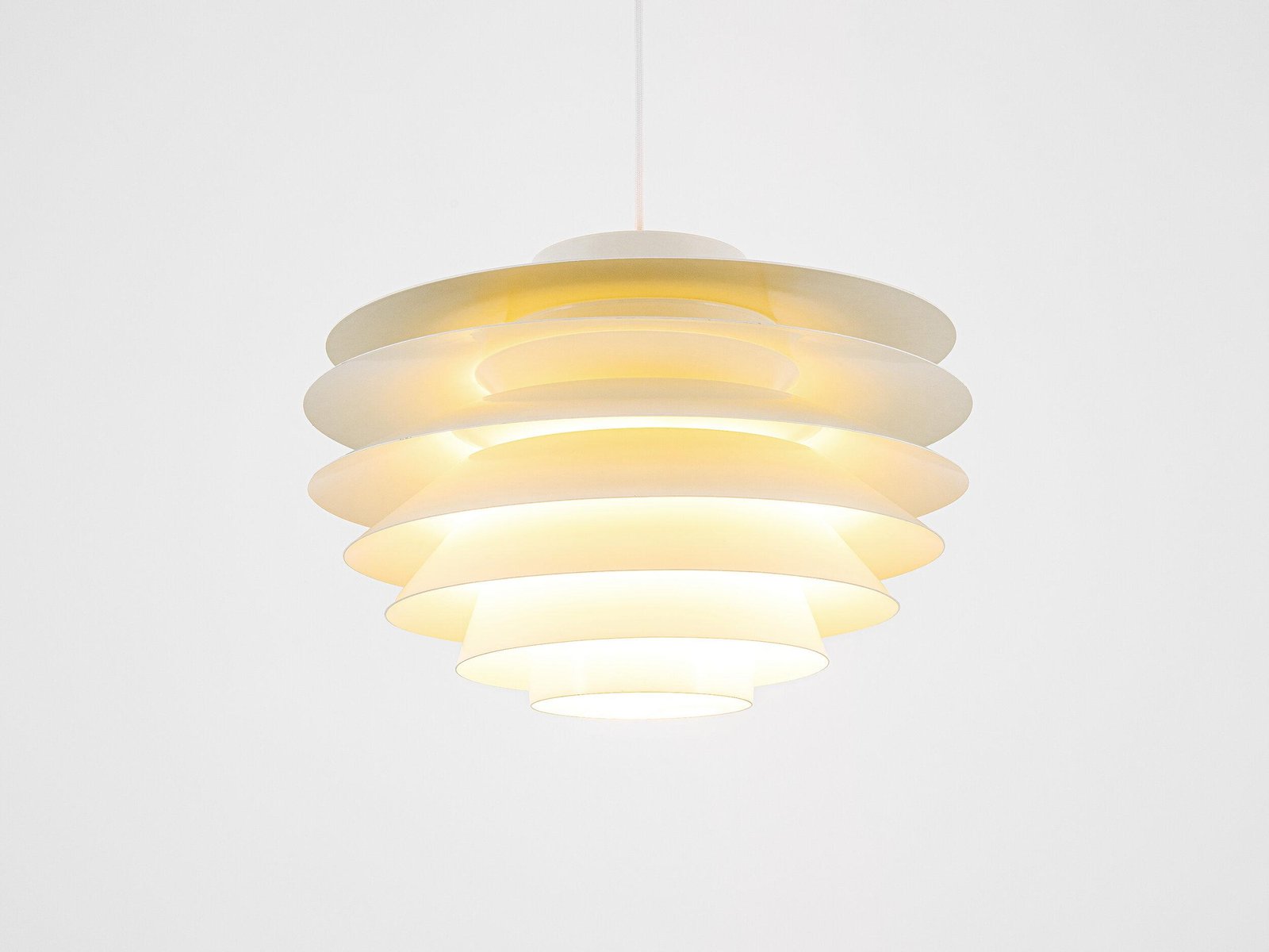 Nordisk Solar used its expertise in using plastic for the production of radio sets, to create many colorful plastic lighting fixtures in the late-1950s and 1960s. The company also commissioned notable Danish architects and designers including Sigvard Bernadotte, Acton Bjørn, Max Brüel, Vagn Dyring, Anton Fogh Holm, Jørgen Kastholm & Preben Fabricius, Eva and Nils Koppel, Sven Middelboe, and Jørn Utzon—who later designed the Sydney Opera House—to create lighting fixtures for Solar. The manufacturer’s most iconic productions include Sven Middleboe’s Verona Pendant Lamp (1960s); Jørn Utzon’s Tivoli Pendant (1947-48, renamed P254 and reintroduced in the 1960s) and Navy Pendant or Sovaernspendel (1956)—which was created for the Royal Danish Navy offices, and was later updated and re-launched by Louis Poulsen under the new name Doo Wop; K Kewo’s Minisol Light (1960s); Preben Fabricius & Jørgen Kastholm’s P376 (1964, renamed Kastholm Pendant in 1980); and Vagn Dyring’s Granada Light (1982).