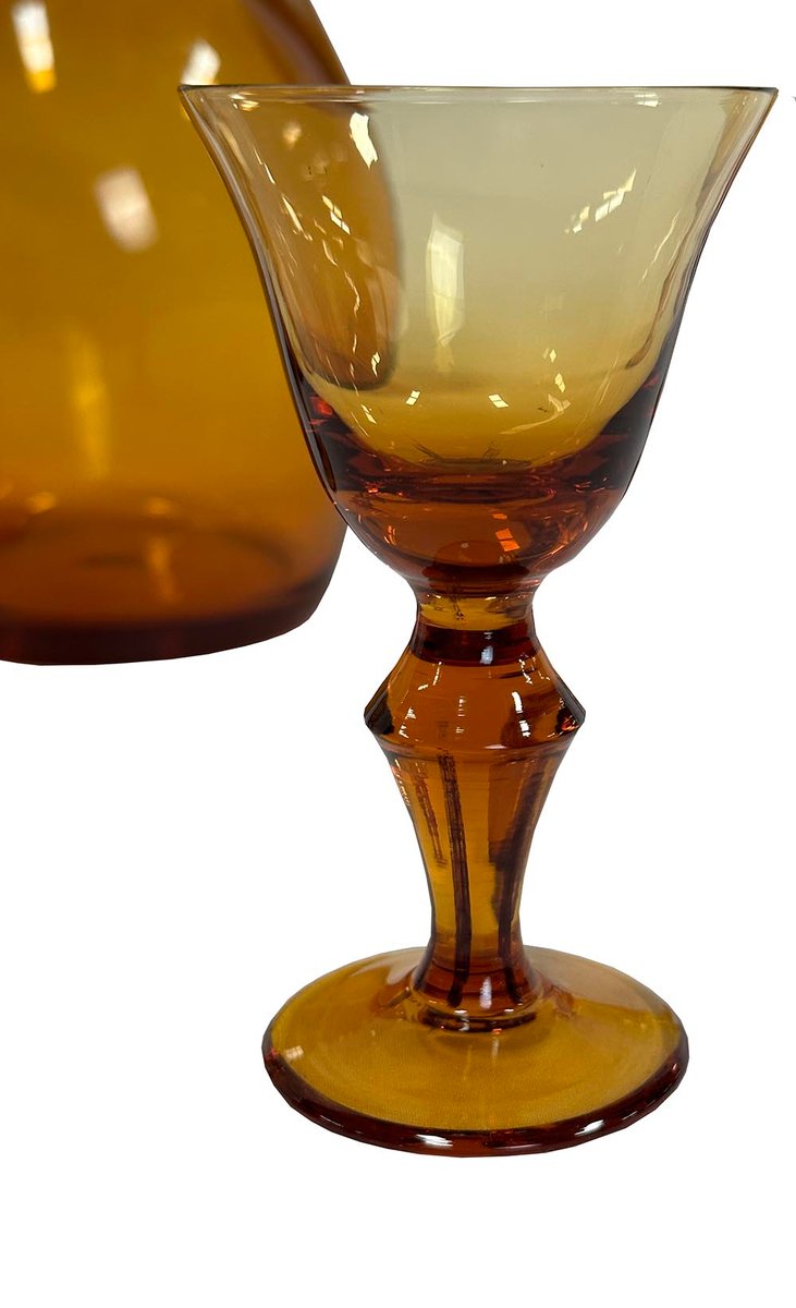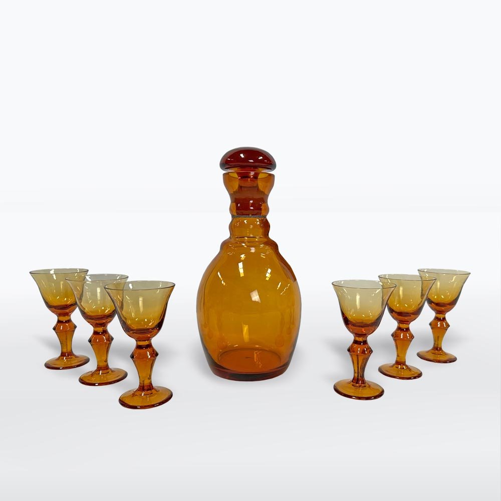 Mid-Century Crystal Decanter Amber glass Liqueur Set, Czech Republic, Set of 7