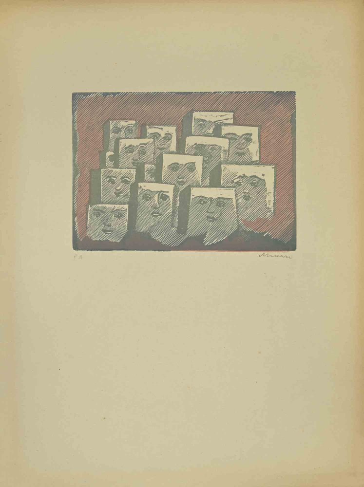 Faces is a linocut realized by Mino Maccari in the 1940s. 50 x 30 cm. Handisigned in the lower right part. Edition of 12 copies. Reference; Cat. Meloni , pag 367, n.1741. Good conditions. Mino Maccari (Siena, 1924-Rome, June 16, 1989) was an Italian writer, painter, engraver and journalist, winner of the Feltrinelli Prize for Painting in 1963 and first winner of the Forte dei Marmi Satira Prize in 1973.After completing his secondary education, he enrolls in university. An interventionist like many young people of his time, he took part in the Great War at the age of nineteen as a field artillery officer. At the end of the conflict he resumed his university studies in Siena and in 1920 he graduated in law. In 1924 he was called by Angiolo Bencini to take care of the printing of the magazine Il Selvaggio, openly uncompromising fascist, revolutionary and anti-bourgeois, where his first engravings were published. After a few years of coexistence between work at the newspaper and the law firm, at the beginning of 1926 he left the legal profession to take over the direction of Il Selvaggio which he would hold until 1942. In 1928 he was the author of the small book published by Vallecchi (Florence), Il Trastullo di Strapaese (little songs and engraved woodwinds) which collected fascist songs (the same book was seized several times from Antonio Gramsci during his detention). with the transfer of the editorial staff of the Selvaggio in 1925 from Colle di Val d'Elsa to Florence, Maccari collaborated with Ardengo Soffici, Ottone Rosai and Achille Lega. In the meantime, between 1927 and 1930, he made himself known to the general public as a painter by participating in various national exhibitions. Also in 1930 Maccari works in Turin at La Stampa as editor-in-chief and has the writer Curzio Malaparte as director. His presence in the cultural and editorial world of the fascist regime is very intense, he writes and collaborates with various magazines: Quadrivio, L'Italia Letteraria, L'Italiano and Omnibus by Leo Longanesi; then, during the war, in il Primato di Bottai and, subsequently again, in Il Mondo di Pannunzio (from the first number, in 1949), up to Documento by Federigo Valli. His graphic production is also vast, ranging from the Album of Vallecchi (1925), Il trastullo di Strapaese (1928) to Linoleum (1931). Maccari illustrated in 1934 La vecchia del Bal Bullier by Antonio Baldini and in 1942 he published the Album folder, followed by Come quando fuori Piove and Il superfluo illustrata.For his pictorial work full of evident chromatic accentuations and fast brushstrokes, the violent drawing combined with the lively stroke of the graphic sign of his engravings, he is recognized by critics as a complete artist. In 1962 he was also entrusted with the presidency of the Accademia di San Luca in Rome and managed to obtain a personal exhibition at Gallery 63 in New York. His production of drawings, watercolors, temperas, etc. is endless, sometimes in collaboration with prestigious publishing houses; it is worth mentioning, just as an excellent example, the 32 b/w and color drawings with which he illustrated Il gusto di vivere, a volume that collects writings by Giancarlo Fusco, edited by Natalia Aspesi and published by Laterza in 1985. Maccari, Sienese and great contradaiolo della Torre, painted the Palio of 16 August 1970 won by Selva. In 1973 he was awarded the Political Satire Award of Forte dei Marmi, an award born in that year. He died without great fanfare, in silence, at the age of ninety, in Rome on June 16, 1989.