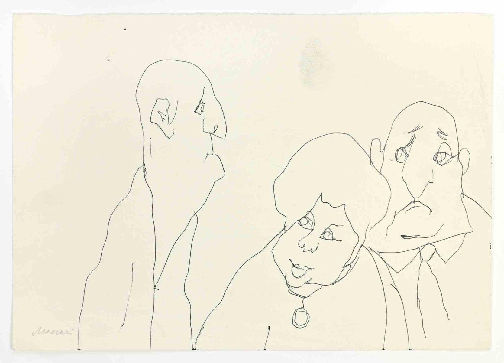 Figures is a Pen Drawing realized by Mino Maccari (1924-1989) in the 1960s. Hand-signed on the lower. Good condition with slight folding and foxing. Mino Maccari (Siena, 1924-Rome, June 16, 1989) was an Italian writer, painter, engraver and journalist, winner of the Feltrinelli Prize for Painting in 1963 and first winner of the Forte dei Marmi Satira Prize in 1973.After completing his secondary education, he enrolls in university. An interventionist like many young people of his time, he took part in the Great War at the age of nineteen as a field artillery officer. At the end of the conflict he resumed his university studies in Siena and in 1920 he graduated in law. In 1924 he was called by Angiolo Bencini to take care of the printing of the magazine Il Selvaggio, openly uncompromising fascist, revolutionary and anti-bourgeois, where his first engravings were published. After a few years of coexistence between work at the newspaper and the law firm, at the beginning of 1926 he left the legal profession to take over the direction of Il Selvaggio which he would hold until 1942. In 1928 he was the author of the small book published by Vallecchi (Florence), Il Trastullo di Strapaese (little songs and engraved woodwinds) which collected fascist songs (the same book was seized several times from Antonio Gramsci during his detention). with the transfer of the editorial staff of the Selvaggio in 1925 from Colle di Val d'Elsa to Florence, Maccari collaborated with Ardengo Soffici, Ottone Rosai and Achille Lega. In the meantime, between 1927 and 1930, he made himself known to the general public as a painter by participating in various national exhibitions. Also in 1930 Maccari works in Turin at La Stampa as editor-in-chief and has the writer Curzio Malaparte as director. His presence in the cultural and editorial world of the fascist regime is very intense, he writes and collaborates with various magazines: Quadrivio, L'Italia Letteraria, L'Italiano and Omnibus by Leo Longanesi; then, during the war, in il Primato di Bottai and, subsequently again, in Il Mondo di Pannunzio (from the first number, in 1949), up to Documento by Federigo Valli. His graphic production is also vast, ranging from the Album of Vallecchi (1925), Il trastullo di Strapaese (1928) to Linoleum (1931). Maccari illustrated in 1934 La vecchia del Bal Bullier by Antonio Baldini and in 1942 he published the Album folder, followed by Come quando fuori Piove and Il superfluo illustrata.For his pictorial work full of evident chromatic accentuations and fast brushstrokes, the violent drawing combined with the lively stroke of the graphic sign of his engravings, he is recognized by critics as a complete artist. In 1962 he was also entrusted with the presidency of the Accademia di San Luca in Rome and managed to obtain a personal exhibition at Gallery 63 in New York. His production of drawings, watercolors, temperas, etc. is endless, sometimes in collaboration with prestigious publishing houses; it is worth mentioning, just as an excellent example, the 32 b/w and color drawings with which he illustrated Il gusto di vivere, a volume that collects writings by Giancarlo Fusco, edited by Natalia Aspesi and published by Laterza in 1985. Maccari, Sienese and great contradaiolo della Torre, painted the Palio of 16 August 1970 won by Selva. In 1973 he was awarded the Political Satire Award of Forte dei Marmi, an award born in that year. He died without great fanfare, in silence, at the age of ninety, in Rome on June 16, 1989.