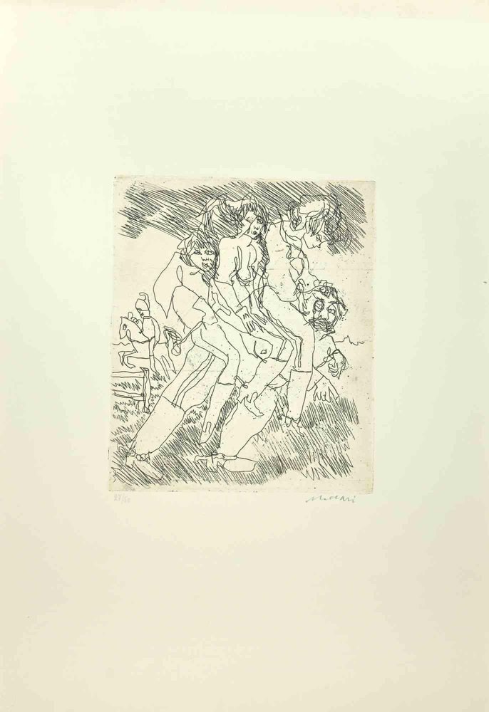 Figures is an Etching and Drypoint realized by Mino Maccari in the Mid-20th Century. Hand-signed in the lower right part. Numbered. Edition,27/50. Good conditions. Mino Maccari (Siena, 1924-Rome, June 16, 1989) was an Italian writer, painter, engraver and journalist, winner of the Feltrinelli Prize for Painting in 1963 and first winner of the Forte dei Marmi Satira Prize in 1973.After completing his secondary education, he enrolls in university. An interventionist like many young people of his time, he took part in the Great War at the age of nineteen as a field artillery officer. At the end of the conflict he resumed his university studies in Siena and in 1920 he graduated in law. In 1924 he was called by Angiolo Bencini to take care of the printing of the magazine Il Selvaggio, openly uncompromising fascist, revolutionary and anti-bourgeois, where his first engravings were published. After a few years of coexistence between work at the newspaper and the law firm, at the beginning of 1926 he left the legal profession to take over the direction of Il Selvaggio which he would hold until 1942. In 1928 he was the author of the small book published by Vallecchi (Florence), Il Trastullo di Strapaese (little songs and engraved woodwinds) which collected fascist songs (the same book was seized several times from Antonio Gramsci during his detention). with the transfer of the editorial staff of the Selvaggio in 1925 from Colle di Val d'Elsa to Florence, Maccari collaborated with Ardengo Soffici, Ottone Rosai and Achille Lega. In the meantime, between 1927 and 1930, he made himself known to the general public as a painter by participating in various national exhibitions. Also in 1930 Maccari works in Turin at La Stampa as editor-in-chief and has the writer Curzio Malaparte as director. His presence in the cultural and editorial world of the fascist regime is very intense, he writes and collaborates with various magazines: Quadrivio, L'Italia Letteraria, L'Italiano and Omnibus by Leo Longanesi; then, during the war, in il Primato di Bottai and, subsequently again, in Il Mondo di Pannunzio (from the first number, in 1949), up to Documento by Federigo Valli. His graphic production is also vast, ranging from the Album of Vallecchi (1925), Il trastullo di Strapaese (1928) to Linoleum (1931). Maccari illustrated in 1934 La vecchia del Bal Bullier by Antonio Baldini and in 1942 he published the Album folder, followed by Come quando fuori Piove and Il superfluo illustrata.For his pictorial work full of evident chromatic accentuations and fast brushstrokes, the violent drawing combined with the lively stroke of the graphic sign of his engravings, he is recognized by critics as a complete artist. In 1962 he was also entrusted with the presidency of the Accademia di San Luca in Rome and managed to obtain a personal exhibition at Gallery 63 in New York. His production of drawings, watercolors, temperas, etc. is endless, sometimes in collaboration with prestigious publishing houses; it is worth mentioning, just as an excellent example, the 32 b/w and color drawings with which he illustrated Il gusto di vivere, a volume that collects writings by Giancarlo Fusco, edited by Natalia Aspesi and published by Laterza in 1985. Maccari, Sienese and great contradaiolo della Torre, painted the Palio of 16 August 1970 won by Selva. In 1973 he was awarded the Political Satire Award of Forte dei Marmi, an award born in that year. He died without great fanfare, in silence, at the age of ninety, in Rome on June 16, 1989.