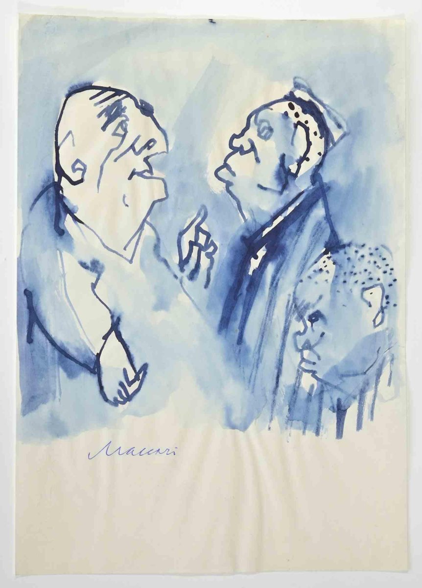 Figures is a watercolor Drawing realized by Mino Maccari (1924-1989) in the 1965. Hand-signed on the lower. Good condition. Mino Maccari (Siena, 1924-Rome, June 16, 1989) was an Italian writer, painter, engraver and journalist, winner of the Feltrinelli Prize for Painting in 1963 and first winner of the Forte dei Marmi Satira Prize in 1973.After completing his secondary education, he enrolls in university. An interventionist like many young people of his time, he took part in the Great War at the age of nineteen as a field artillery officer. At the end of the conflict he resumed his university studies in Siena and in 1920 he graduated in law. In 1924 he was called by Angiolo Bencini to take care of the printing of the magazine Il Selvaggio, openly uncompromising fascist, revolutionary and anti-bourgeois, where his first engravings were published. After a few years of coexistence between work at the newspaper and the law firm, at the beginning of 1926 he left the legal profession to take over the direction of Il Selvaggio which he would hold until 1942. In 1928 he was the author of the small book published by Vallecchi (Florence), Il Trastullo di Strapaese (little songs and engraved woodwinds) which collected fascist songs (the same book was seized several times from Antonio Gramsci during his detention). with the transfer of the editorial staff of the Selvaggio in 1925 from Colle di Val d'Elsa to Florence, Maccari collaborated with Ardengo Soffici, Ottone Rosai and Achille Lega. In the meantime, between 1927 and 1930, he made himself known to the general public as a painter by participating in various national exhibitions. Also in 1930 Maccari works in Turin at La Stampa as editor-in-chief and has the writer Curzio Malaparte as director. His presence in the cultural and editorial world of the fascist regime is very intense, he writes and collaborates with various magazines: Quadrivio, L'Italia Letteraria, L'Italiano and Omnibus by Leo Longanesi; then, during the war, in il Primato di Bottai and, subsequently again, in Il Mondo di Pannunzio (from the first number, in 1949), up to Documento by Federigo Valli. His graphic production is also vast, ranging from the Album of Vallecchi (1925), Il trastullo di Strapaese (1928) to Linoleum (1931). Maccari illustrated in 1934 La vecchia del Bal Bullier by Antonio Baldini and in 1942 he published the Album folder, followed by Come quando fuori Piove and Il superfluo illustrata.For his pictorial work full of evident chromatic accentuations and fast brushstrokes, the violent drawing combined with the lively stroke of the graphic sign of his engravings, he is recognized by critics as a complete artist. In 1962 he was also entrusted with the presidency of the Accademia di San Luca in Rome and managed to obtain a personal exhibition at Gallery 63 in New York. His production of drawings, watercolors, temperas, etc. is endless, sometimes in collaboration with prestigious publishing houses; it is worth mentioning, just as an excellent example, the 32 b/w and color drawings with which he illustrated Il gusto di vivere, a volume that collects writings by Giancarlo Fusco, edited by Natalia Aspesi and published by Laterza in 1985. Maccari, Sienese and great contradaiolo della Torre, painted the Palio of 16 August 1970 won by Selva. In 1973 he was awarded the Political Satire Award of Forte dei Marmi, an award born in that year. He died without great fanfare, in silence, at the age of ninety, in Rome on June 16, 1989.