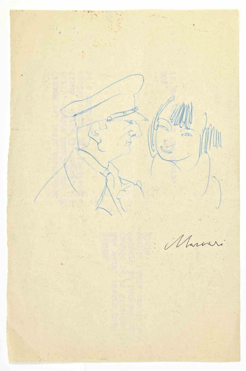 General and Girl is a pen Drawing realized by Mino Maccari (1924-1989) in 1947 ca Hand-signed on the lower. Good condition, with slight folding. Mino Maccari (Siena, 1924-Rome, June 16, 1989) was an Italian writer, painter, engraver and journalist, winner of the Feltrinelli Prize for Painting in 1963 and first winner of the Forte dei Marmi Satira Prize in 1973.After completing his secondary education, he enrolls in university. An interventionist like many young people of his time, he took part in the Great War at the age of nineteen as a field artillery officer. At the end of the conflict he resumed his university studies in Siena and in 1920 he graduated in law. In 1924 he was called by Angiolo Bencini to take care of the printing of the magazine Il Selvaggio, openly uncompromising fascist, revolutionary and anti-bourgeois, where his first engravings were published. After a few years of coexistence between work at the newspaper and the law firm, at the beginning of 1926 he left the legal profession to take over the direction of Il Selvaggio which he would hold until 1942. In 1928 he was the author of the small book published by Vallecchi (Florence), Il Trastullo di Strapaese (little songs and engraved woodwinds) which collected fascist songs (the same book was seized several times from Antonio Gramsci during his detention). with the transfer of the editorial staff of the Selvaggio in 1925 from Colle di Val d'Elsa to Florence, Maccari collaborated with Ardengo Soffici, Ottone Rosai and Achille Lega. In the meantime, between 1927 and 1930, he made himself known to the general public as a painter by participating in various national exhibitions. Also in 1930 Maccari works in Turin at La Stampa as editor-in-chief and has the writer Curzio Malaparte as director. His presence in the cultural and editorial world of the fascist regime is very intense, he writes and collaborates with various magazines: Quadrivio, L'Italia Letteraria, L'Italiano and Omnibus by Leo Longanesi; then, during the war, in il Primato di Bottai and, subsequently again, in Il Mondo di Pannunzio (from the first number, in 1949), up to Documento by Federigo Valli. His graphic production is also vast, ranging from the Album of Vallecchi (1925), Il trastullo di Strapaese (1928) to Linoleum (1931). Maccari illustrated in 1934 La vecchia del Bal Bullier by Antonio Baldini and in 1942 he published the Album folder, followed by Come quando fuori Piove and Il superfluo illustrata.For his pictorial work full of evident chromatic accentuations and fast brushstrokes, the violent drawing combined with the lively stroke of the graphic sign of his engravings, he is recognized by critics as a complete artist. In 1962 he was also entrusted with the presidency of the Accademia di San Luca in Rome and managed to obtain a personal exhibition at Gallery 63 in New York. His production of drawings, watercolors, temperas, etc. is endless, sometimes in collaboration with prestigious publishing houses; it is worth mentioning, just as an excellent example, the 32 b/w and color drawings with which he illustrated Il gusto di vivere, a volume that collects writings by Giancarlo Fusco, edited by Natalia Aspesi and published by Laterza in 1985. Maccari, Sienese and great contradaiolo della Torre, painted the Palio of 16 August 1970 won by Selva. In 1973 he was awarded the Political Satire Award of Forte dei Marmi, an award born in that year. He died without great fanfare, in silence, at the age of ninety, in Rome on June 16, 1989.